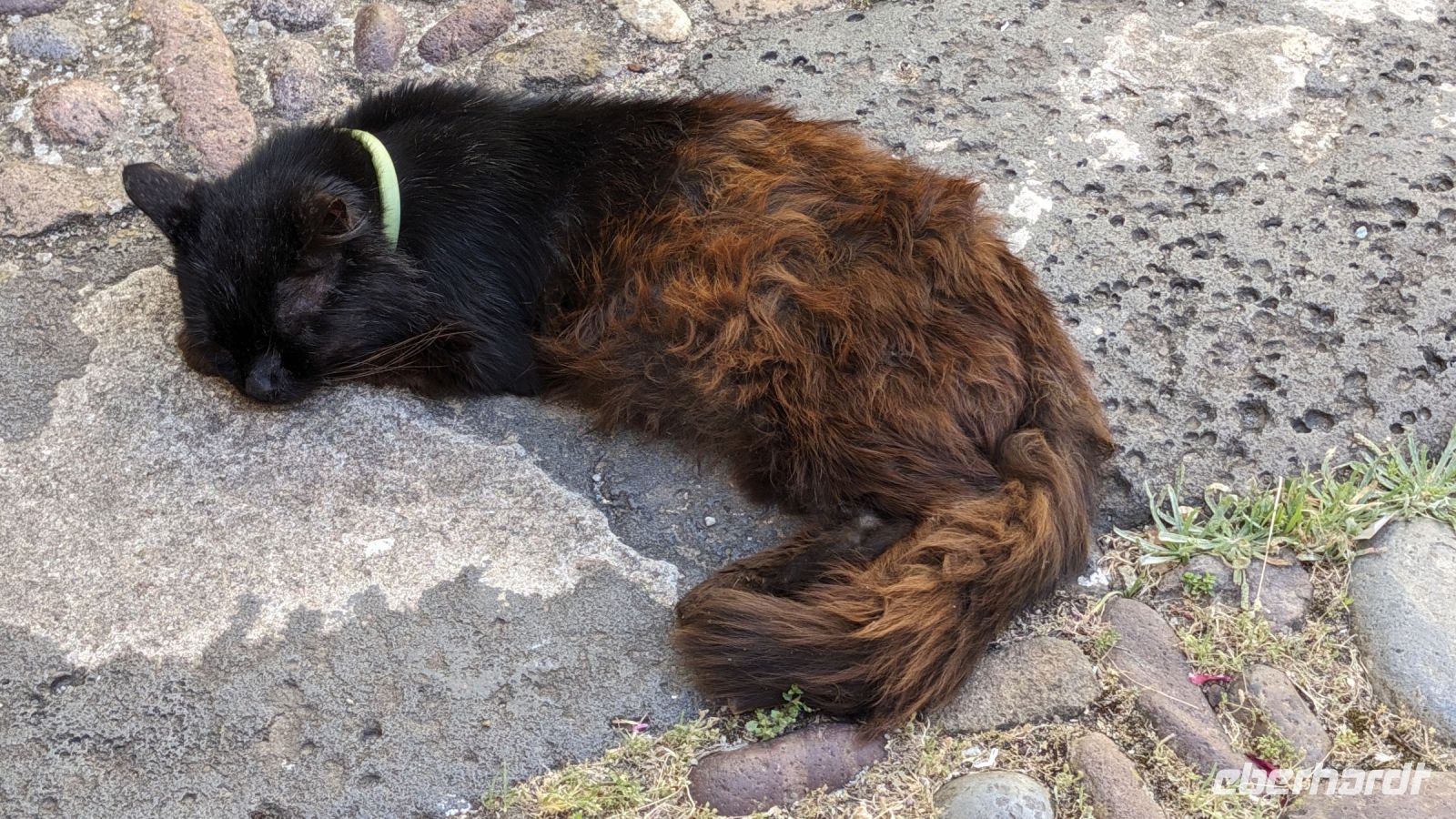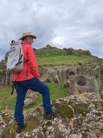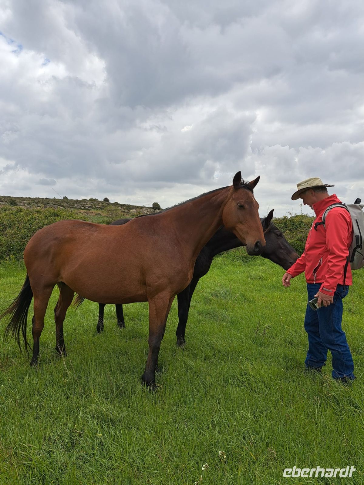 Spannender war allerdings die intensive Pferdebegegnung. Zwei wunderschöne Pferde hatten uns erspäht. Ihr Überlebenssinn sagte ihnen, Wanderer mit Rucksäcken haben sicher was Essbares dabei. Sie kamen uns näher. Anfangs noch etwas scheu, später wesentlich aufdringlicher. Knabberten auch schon mal an manchen Rucksack oder Schulter der Wanderer. Angst sollte man ihnen jetzt nicht zeigen. Streicheln ließen sie sich auch nicht unbedingt. Der Versuch, die Pferde mit einem Apfel milde zu stimmen gelang auch nicht wirklich. Sie verfolgten uns trotzdem. Verjagen gelang auch nicht, denn plötzlich standen sie vor uns und versperrten den Weg. Hier musste man sie schon mal mit dem Hut in Zaum halten, damit wir unversehrt das Gelände verlassen konnte.