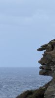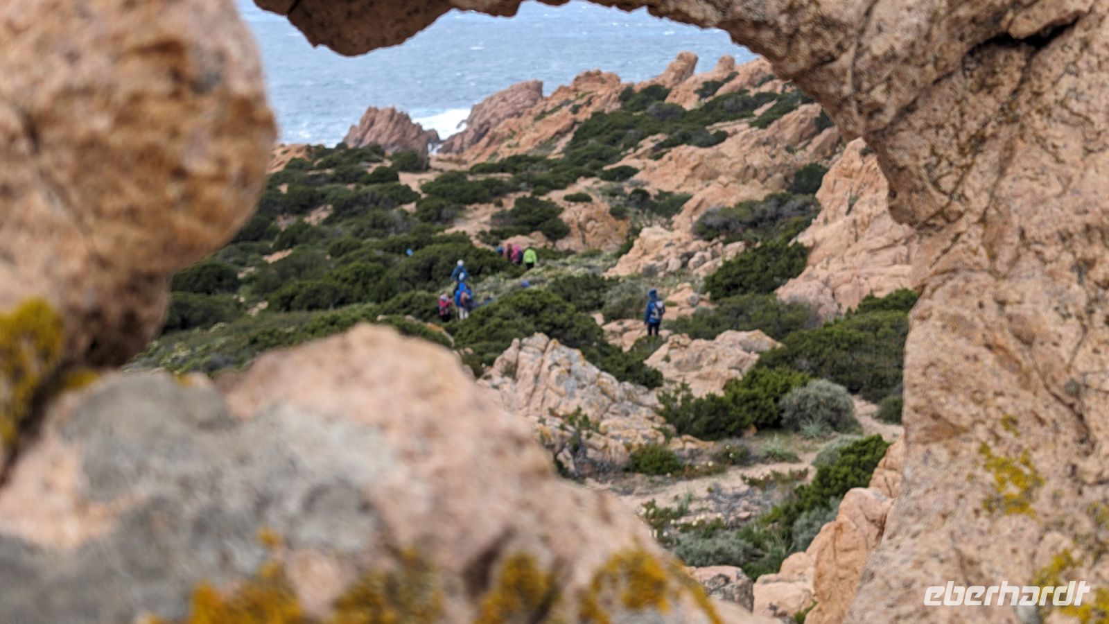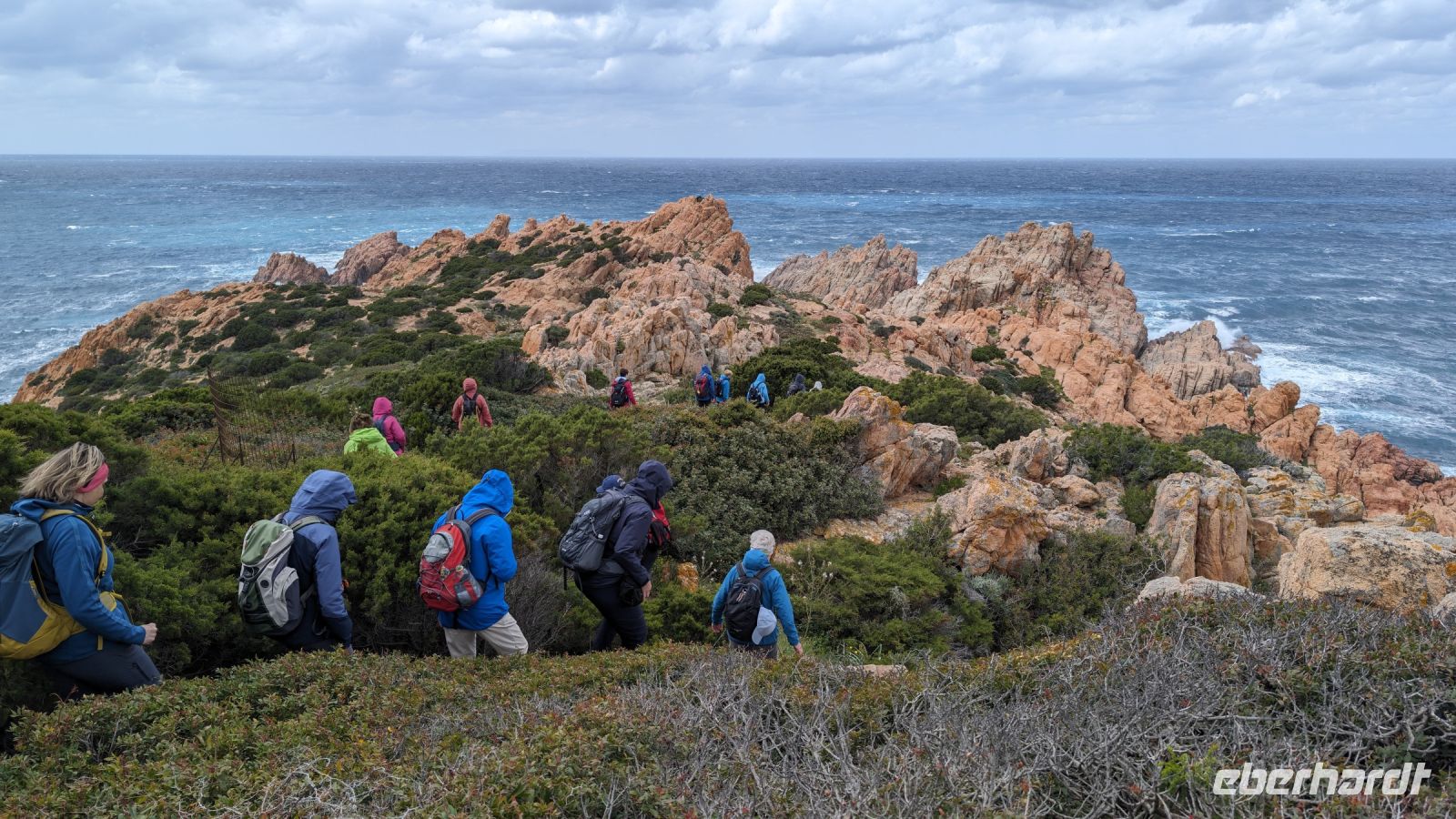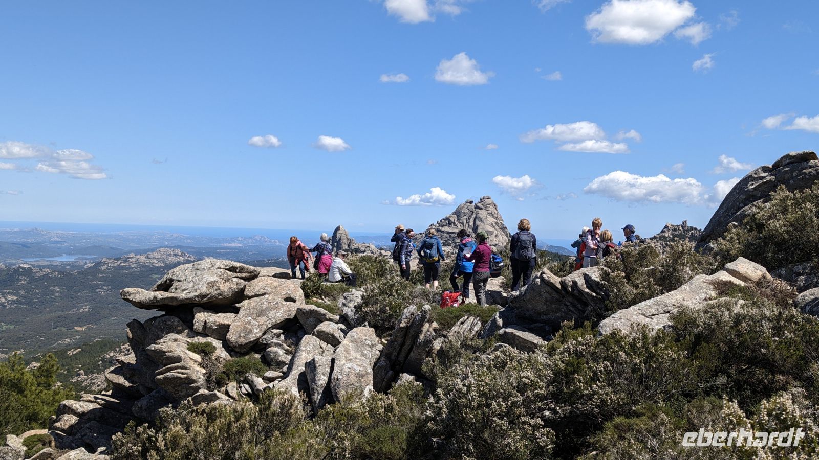 In der faszinierende Felsformationen aus rotem Granit, wurde von der Gruppe wieder Hilfsbereitschaft und Teamwork abverlangt beim Erklimmen der Felsen. Die Aussicht oben vom Punta li Canneddi hinüber nach Korsika war getrübt, aber die Kontraste zwischen türkisblauem Meer, roten Felsen und dazwischen immer wieder mal grüne Feigenkakteen und Zwergpalmen waren schon einmalig. Für Sekunden kam manchmal die Sonne durch die Wolken und ließ die Natur erstrahlen und die Felsen leuchteten.