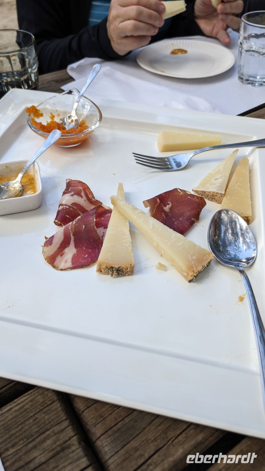 Zum Wein wurde natürlich auch ein kleiner Happen gereicht, bestehend aus mildem Weichkäse, mildem Hartkäse, 2 Scheiben Salami und zum Schluß ein würziger Hartkäse. Dazu das berühmte hauchdünne Pane Canacau und die oben genannten Oliven. Gegessen sollte dies zu den jeweiligen Weinen werden.