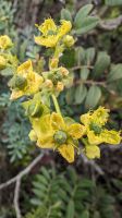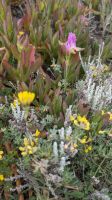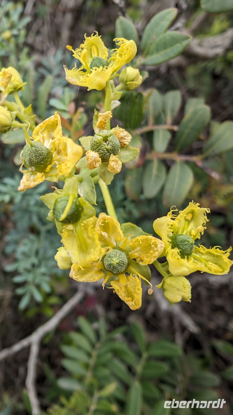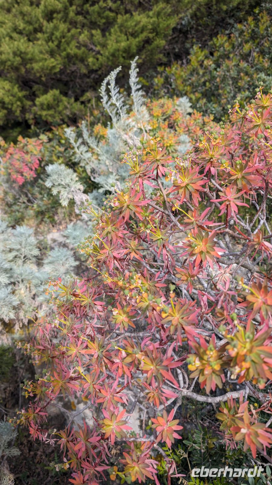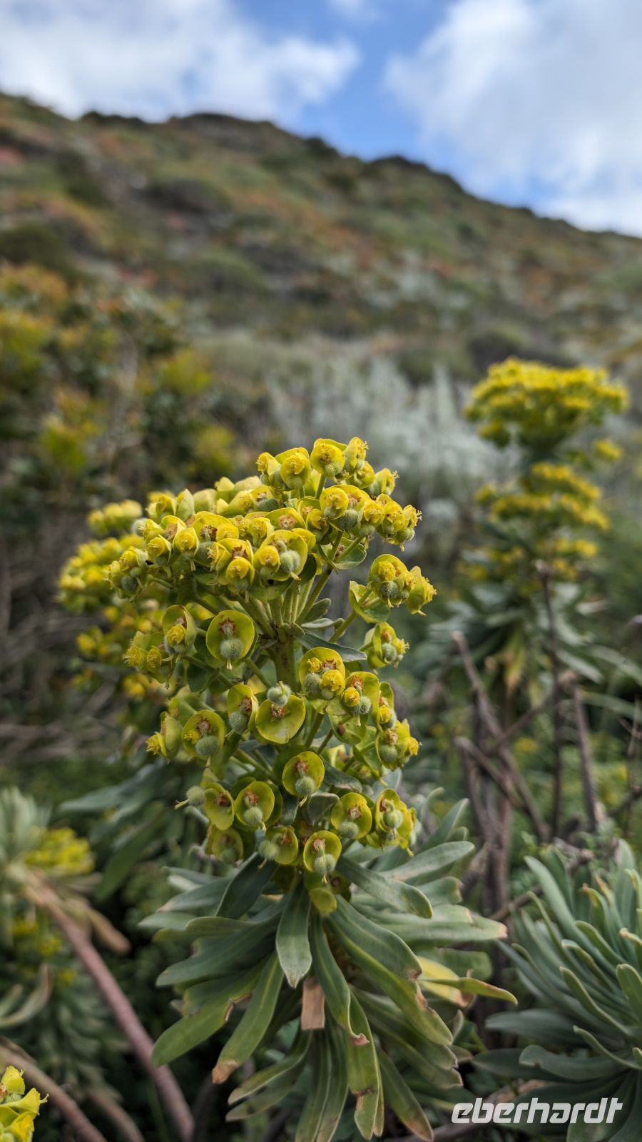 Die Berghänge übersät mit der hellgelben, orangen und rostbraunen Wolfsmilch, die aussieht wie runde gewölbte Kissen aus 1001 Nacht und zum hinsetzen einluden. Der knallgelbe Ginster mit seinen intensiven grünen Stengeln. Weiße Zistrosenfelder dunkelgrüne wilde Birnen, dazwischen immer wieder der gelbe Wildfenchel und der hellgrüne bis graue Mittelmeervermut. Kornwucherblumen verwandelten ganze Flächen in ein gelbes Meer. Einen spannenden Kontrast zu all der Blütenpracht bildete das hellgrüne bis dunkelrote Basaltgestein.