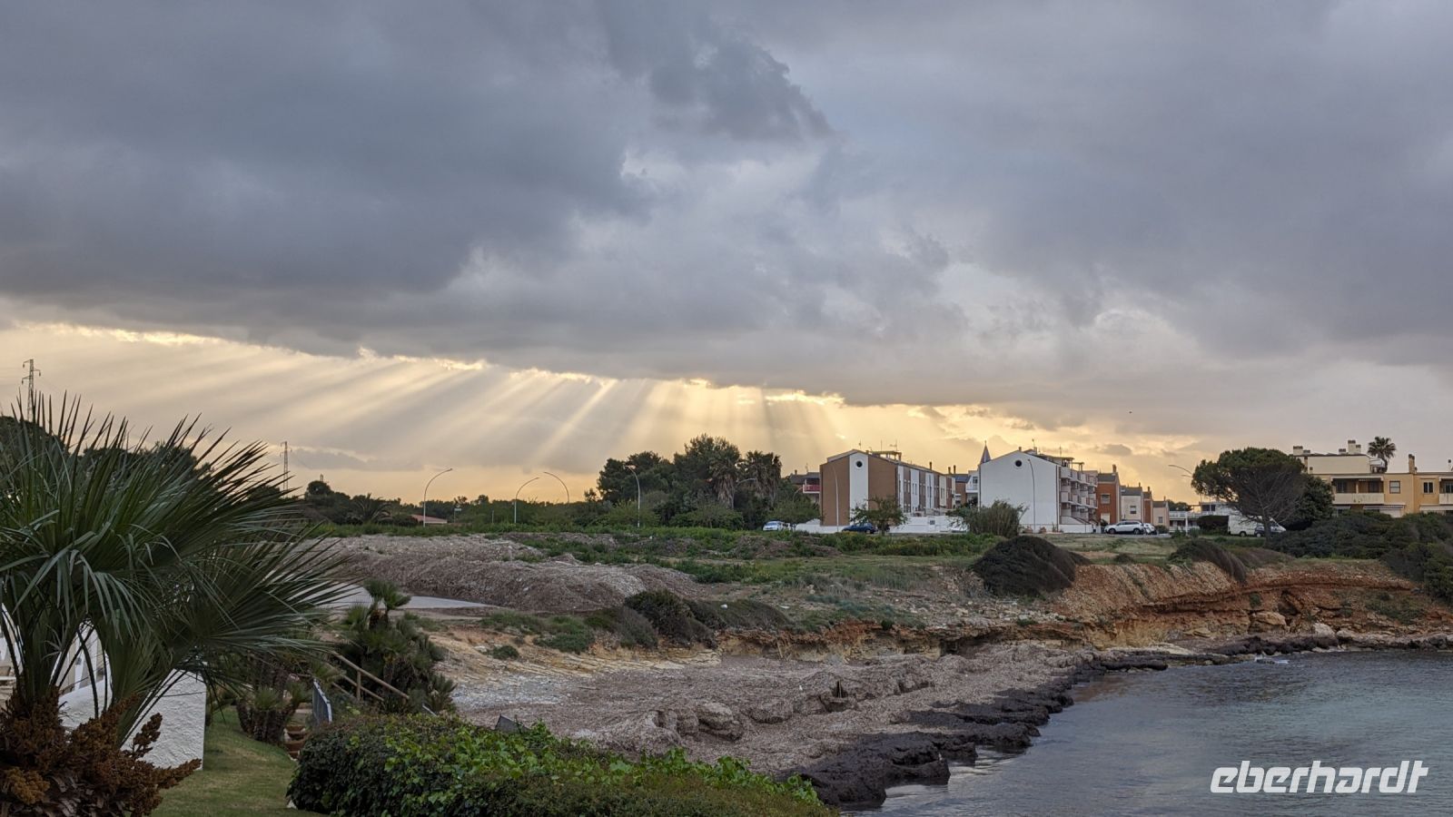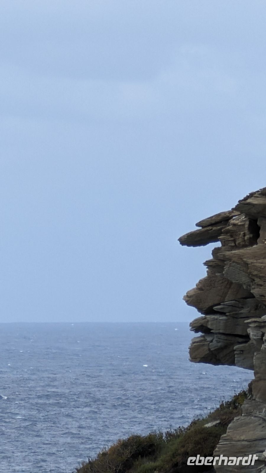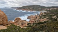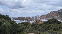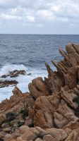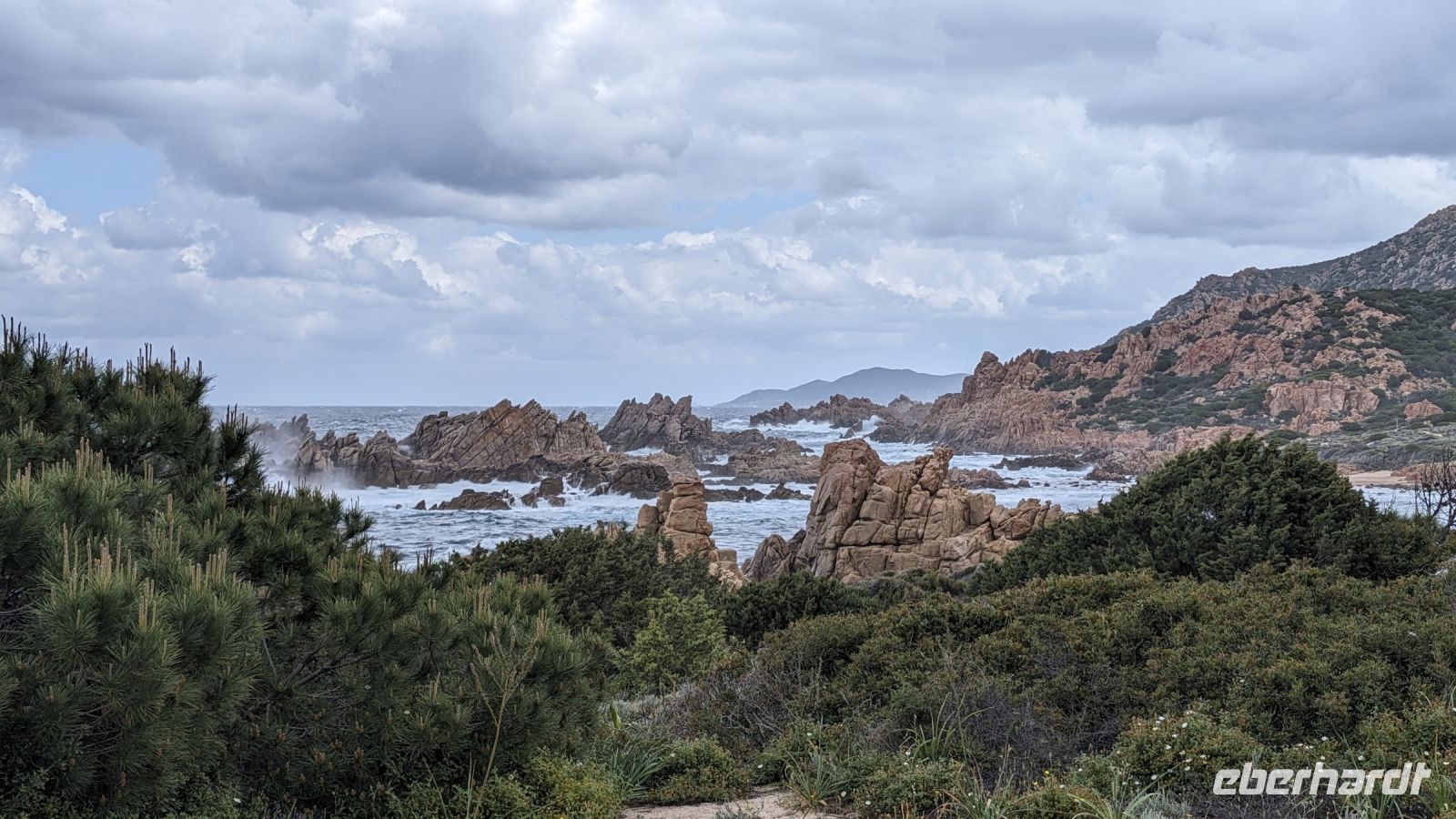 In der Nacht hatte es geregnet. Das Wetter heute bescherte uns viele Wolken. Mit unverminderter Stärke wehte der Mistral aus Nordwesten und schob die Wolken vor die Sonne. Schade, gerade für Isola Rossa brauchte man schönes Wetter, damit die Felsen in leuchtendem Rot erstrahlen.