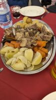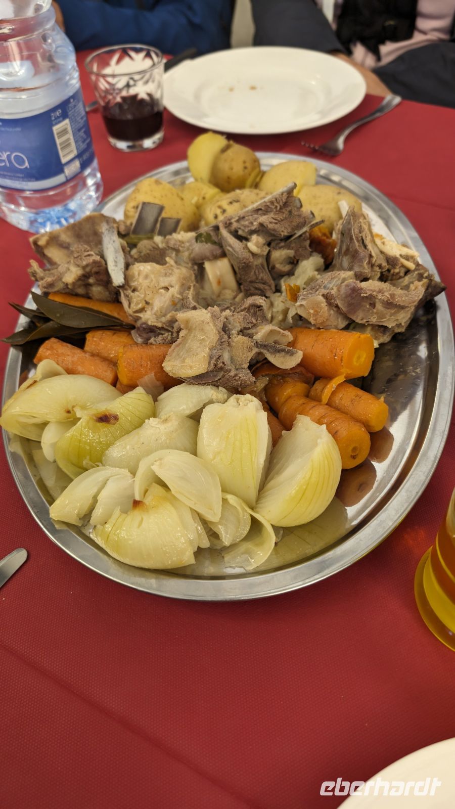 Als Hauptspeise, gekochtes Schaffleisch, mit Kartoffeln, Zwiebeln und Karotten und als besonderer Höhepunkt das gegrillte Spanferkel.