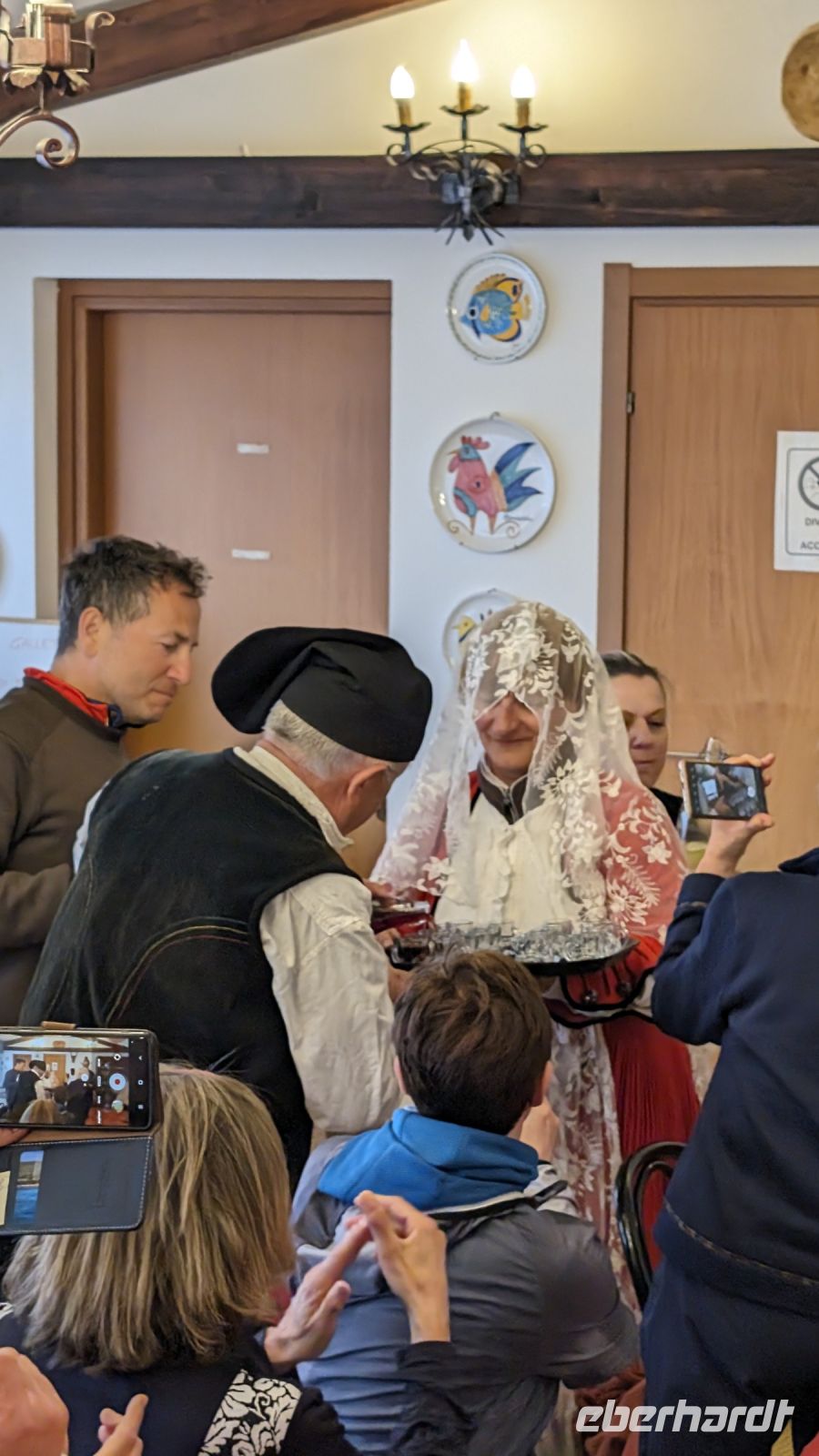 Die sardische Musik zur Unterhaltung war diesmal nicht live, sondern kam aus dem Lautsprecher via Spotify. Ein Herr und eine Dame aus der Gruppe wurden in traditionelle Hochzeitskleider gesteckt und ahmten eine sardische Hochzeit nach, wo das Brautpaar seinen Gästen die Getränke servieren mussten. Die beiden machten das sehr gut, obwohl sie im richtigen Leben nicht verheiratet waren.