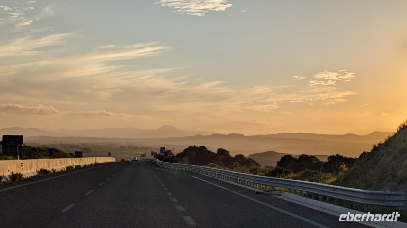 24 Grad, leichter Wind und Sonne. Il Signore Salvatore stand bereit, diesmal mit blauem Mercedesbus und chauffierte uns über die Insel, hinein in einen goldenen Sonnenuntergang. Ein romantisches Bild, das sofort an Caspar David Friedrich erinnerte, „Das Riesengebirge“. Und hier, Sardinien im Abendschein.