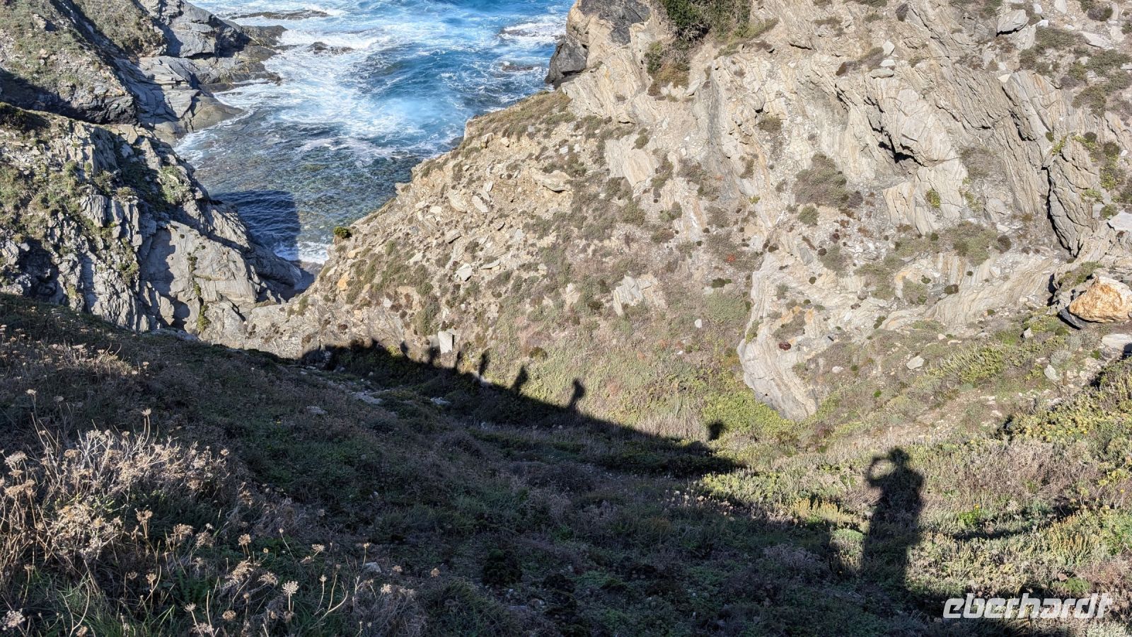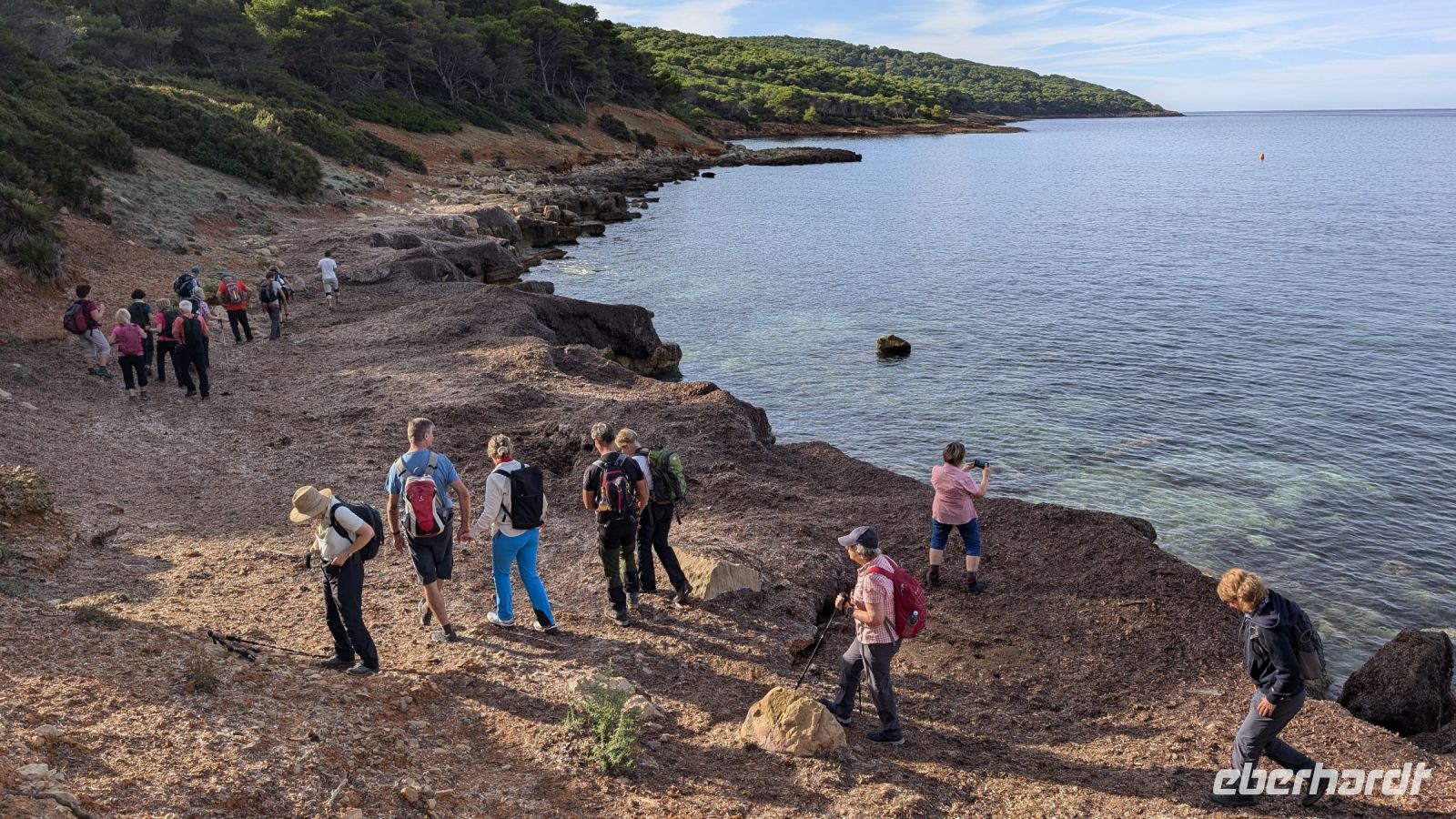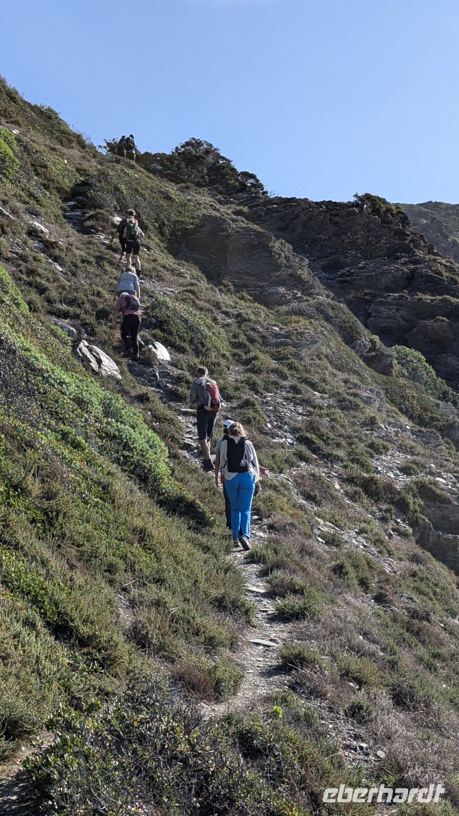 Schmale Pfade entlang steiler Hänge, umrahmt von hohen Felsen und Klippen. Unter uns das schäumende Meer mit der Cala di Punta Agliastroni.