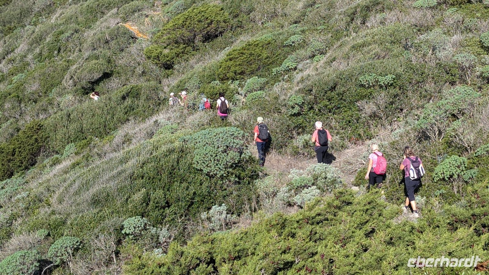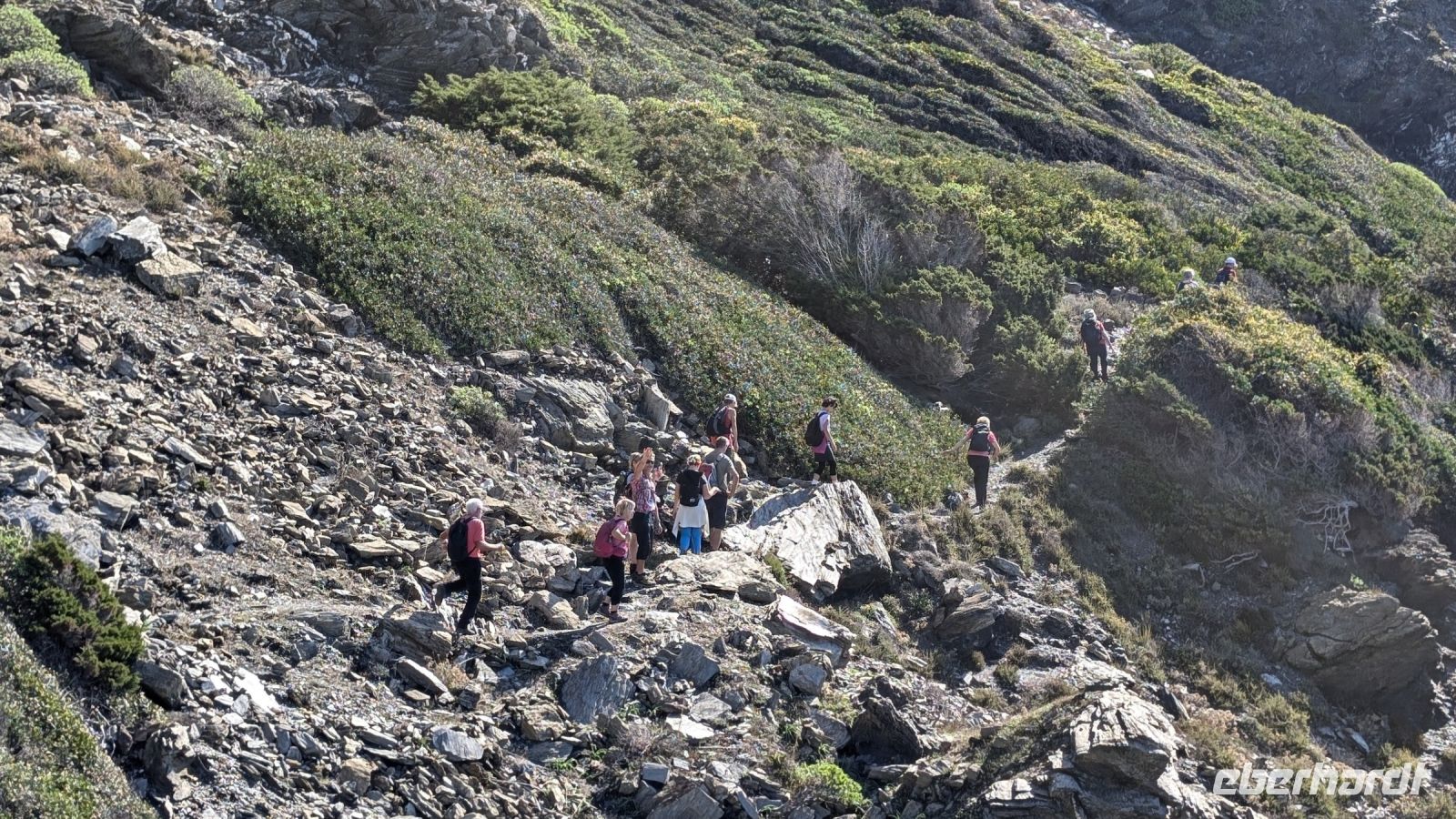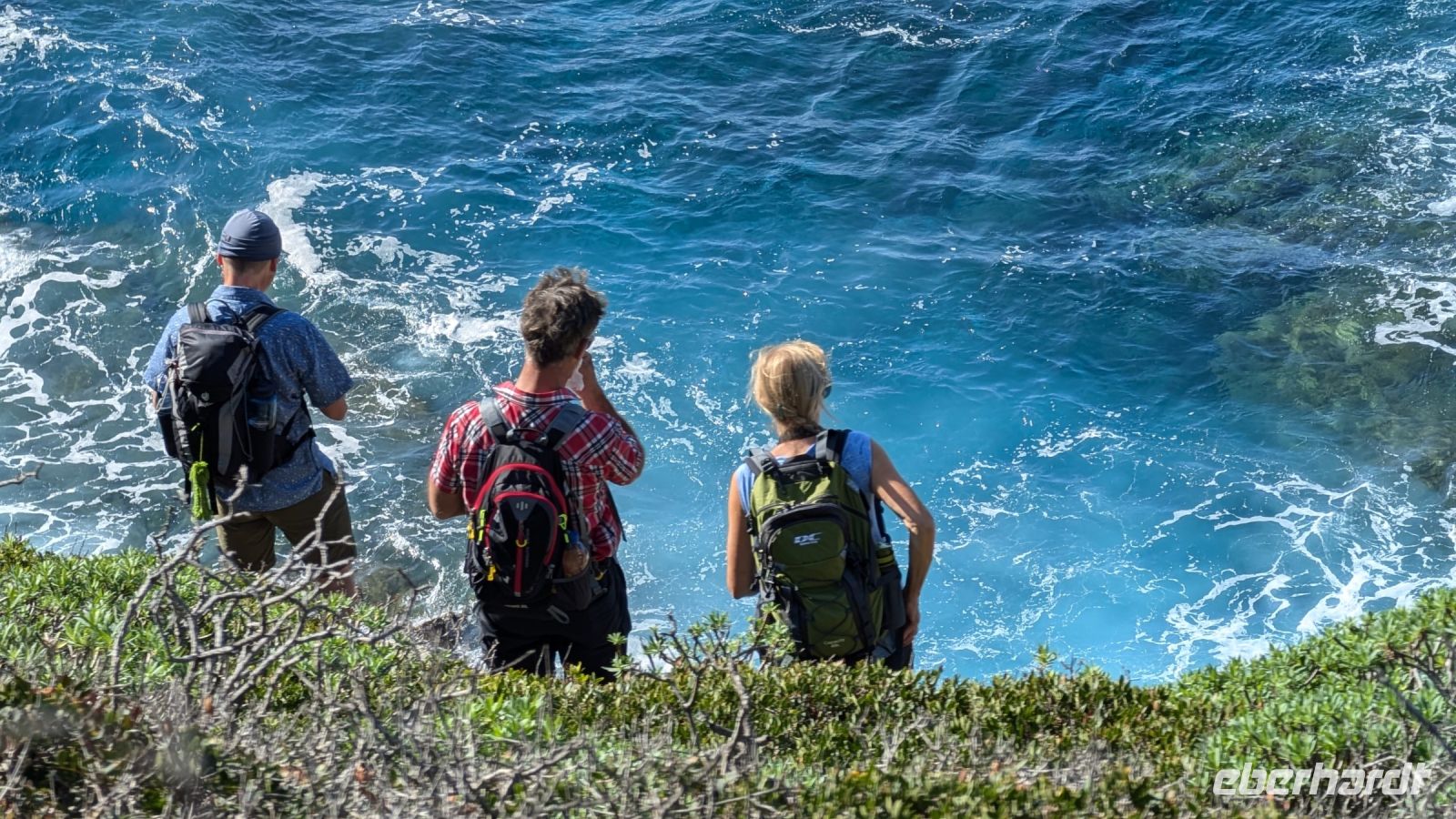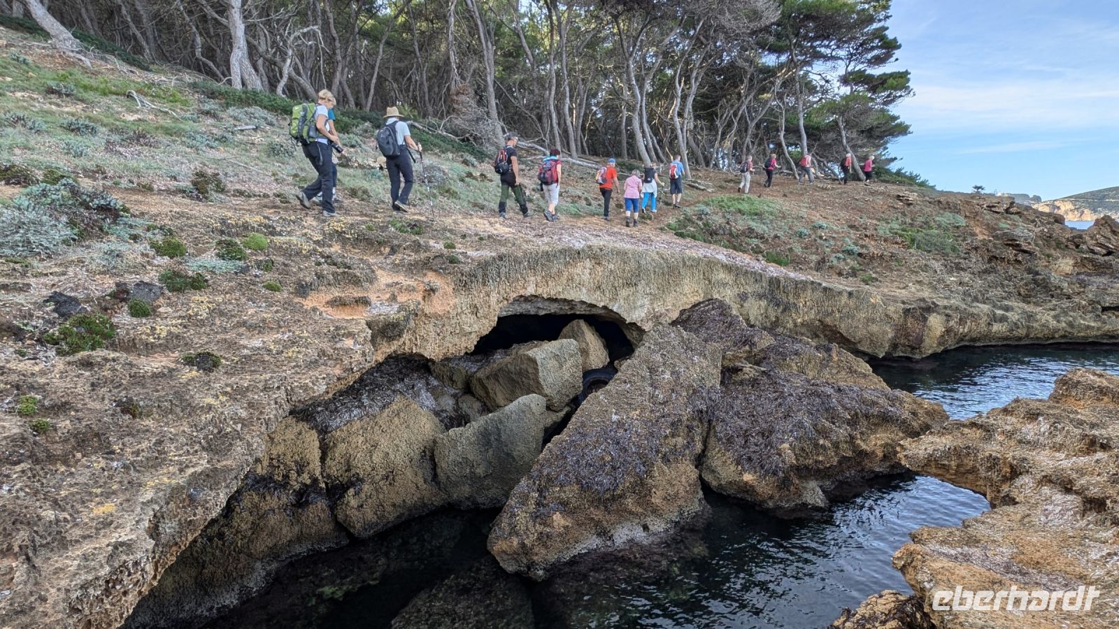 Schmale Pfade entlang steiler Hänge, umrahmt von hohen Felsen und Klippen. Unter uns das schäumende Meer mit der Cala di Punta Agliastroni.