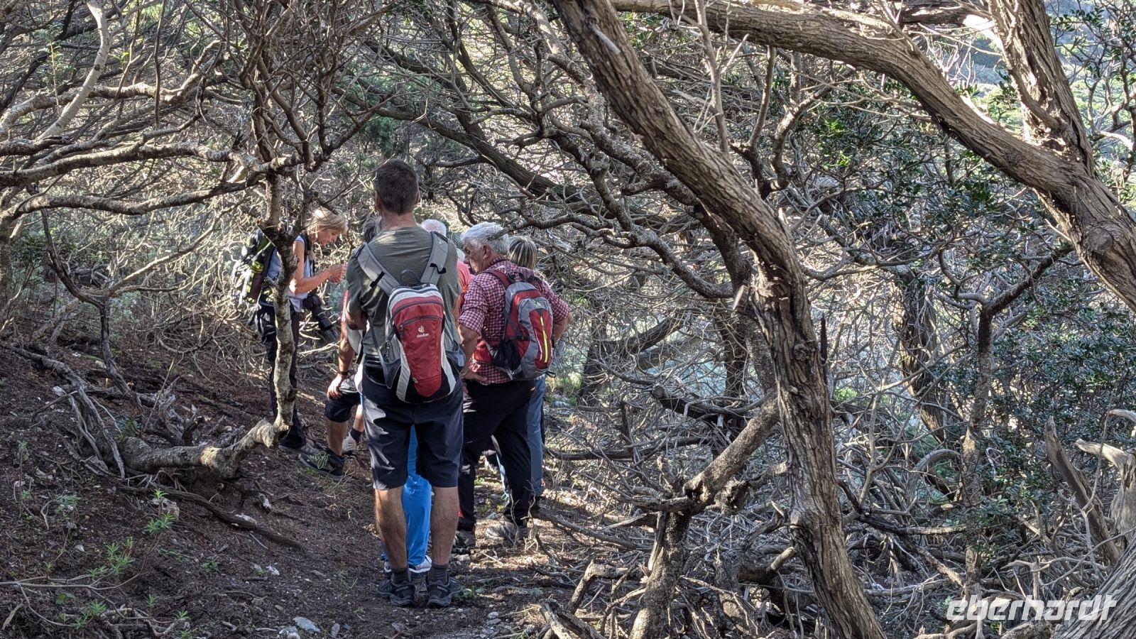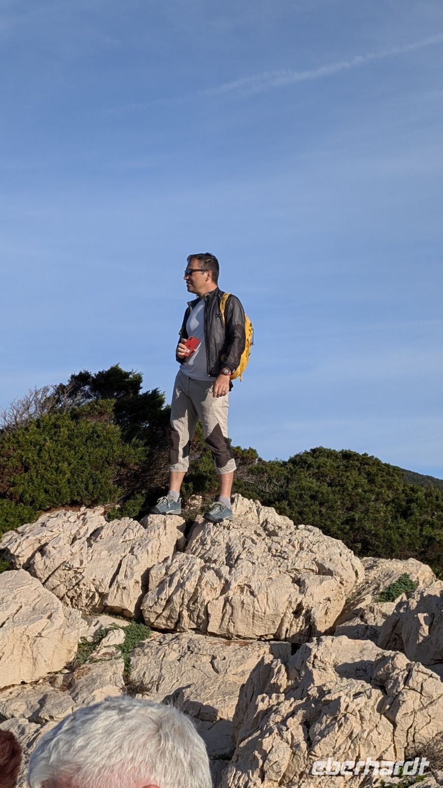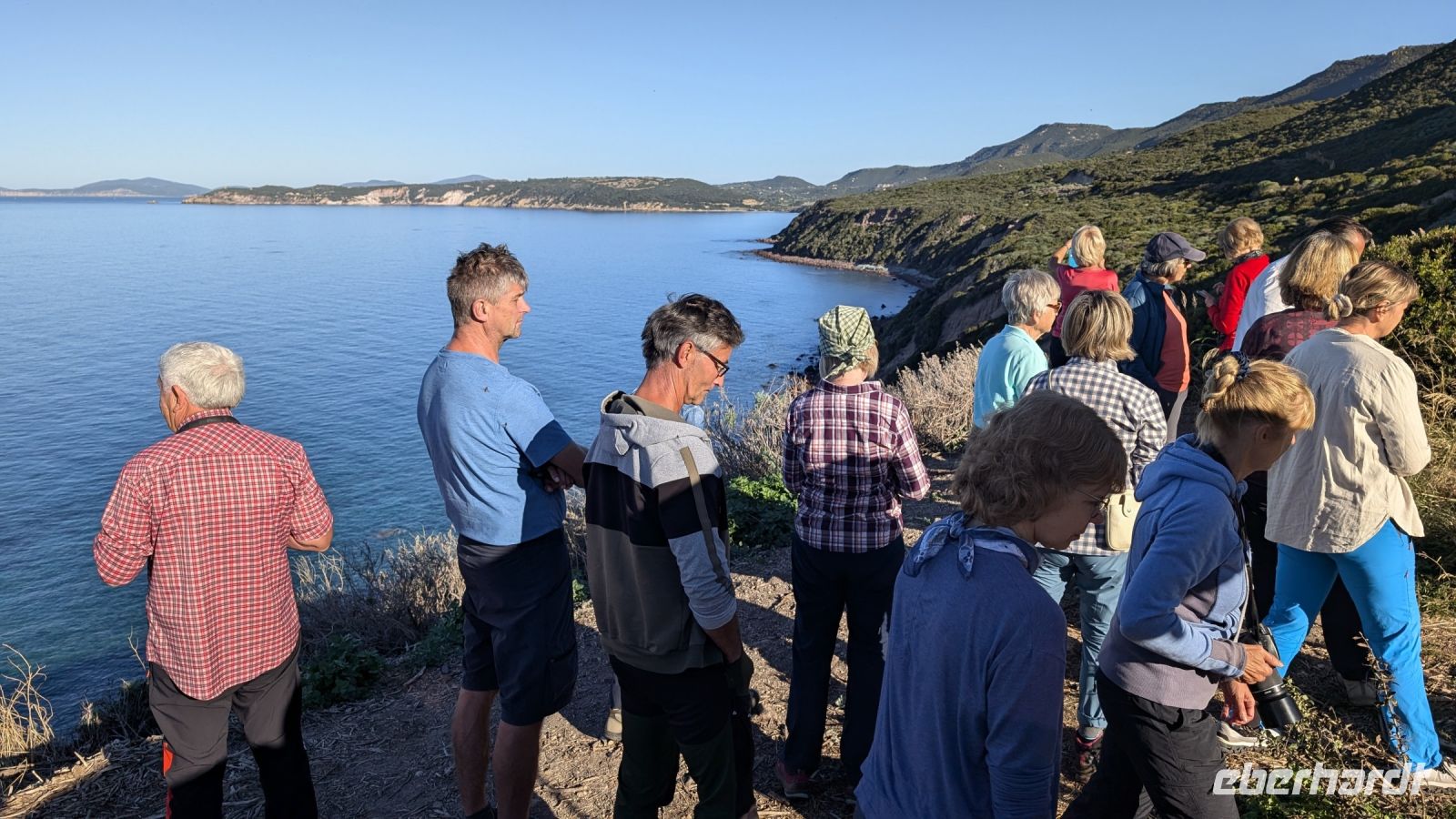 Noch ein grandioser Ausblick hinunter aufs Meer und dann führte uns Carlo auf einer spannenden Wanderung hinein in die Unwegsamkeit einer unberührten Landschaft mit mannshohen Macchiagewächsen. Mastixbeeren, Wacholderbäume, Wolfsmilch, eine Wanderung hinein in die Düfte Sardiniens.