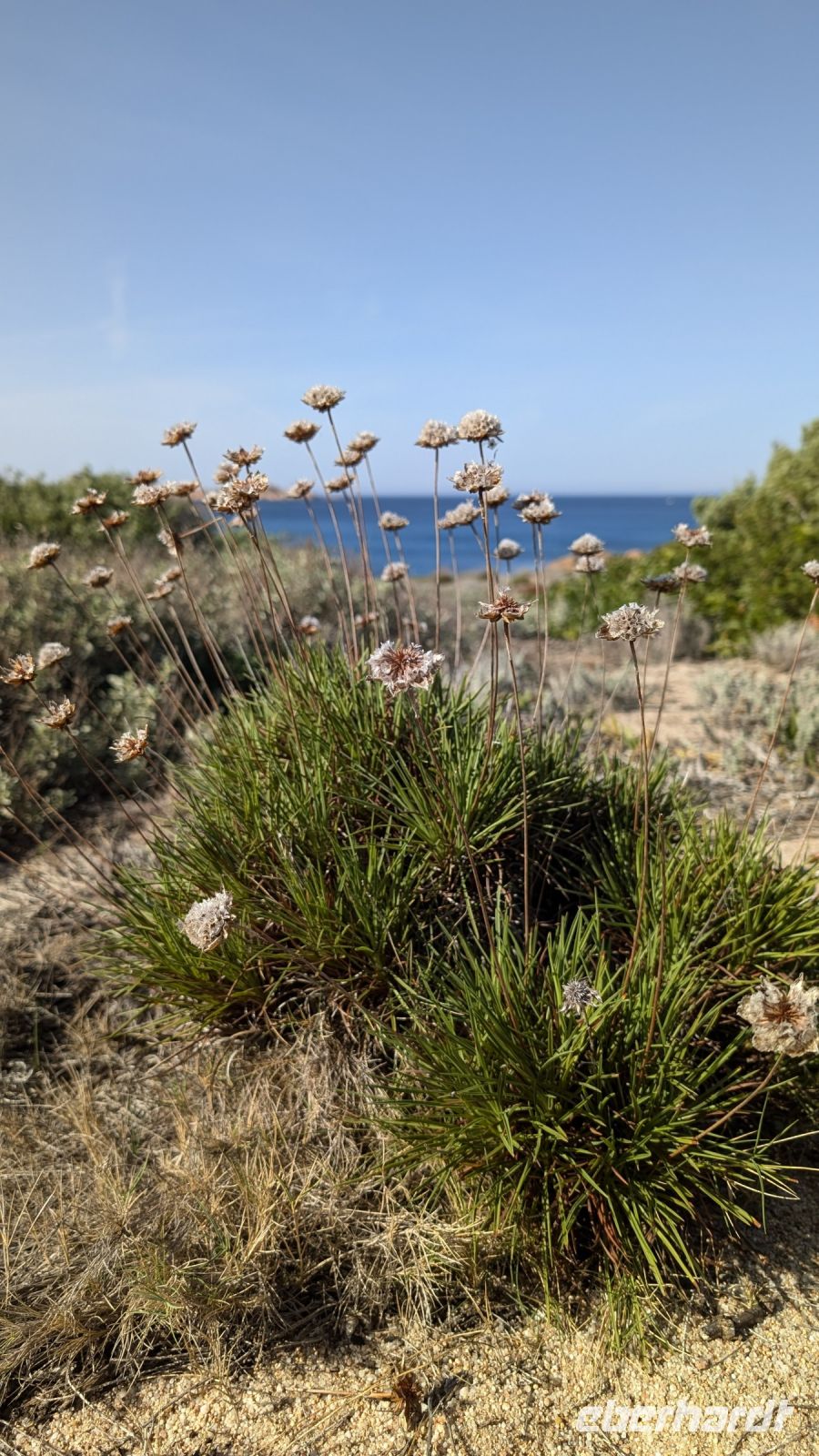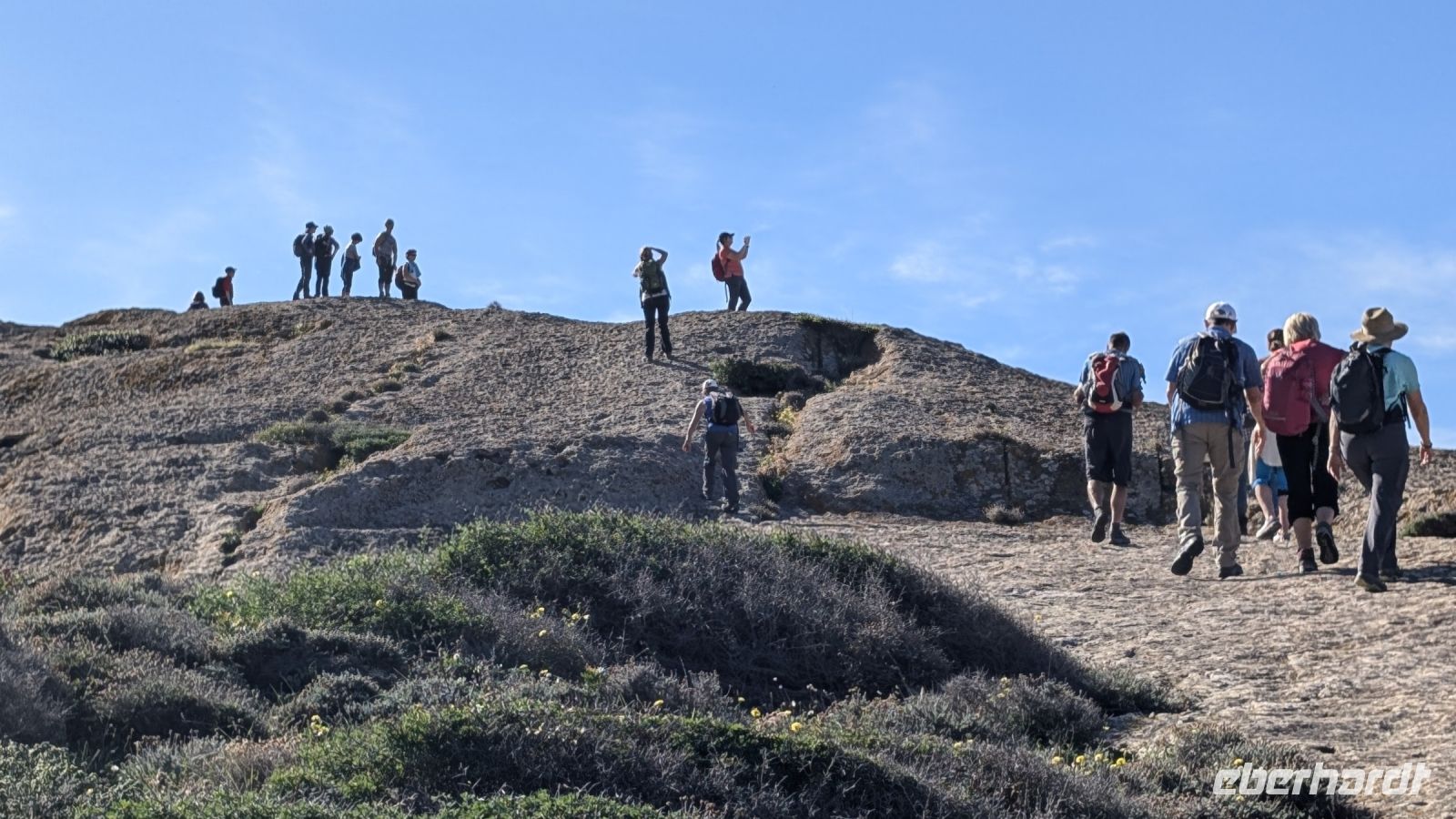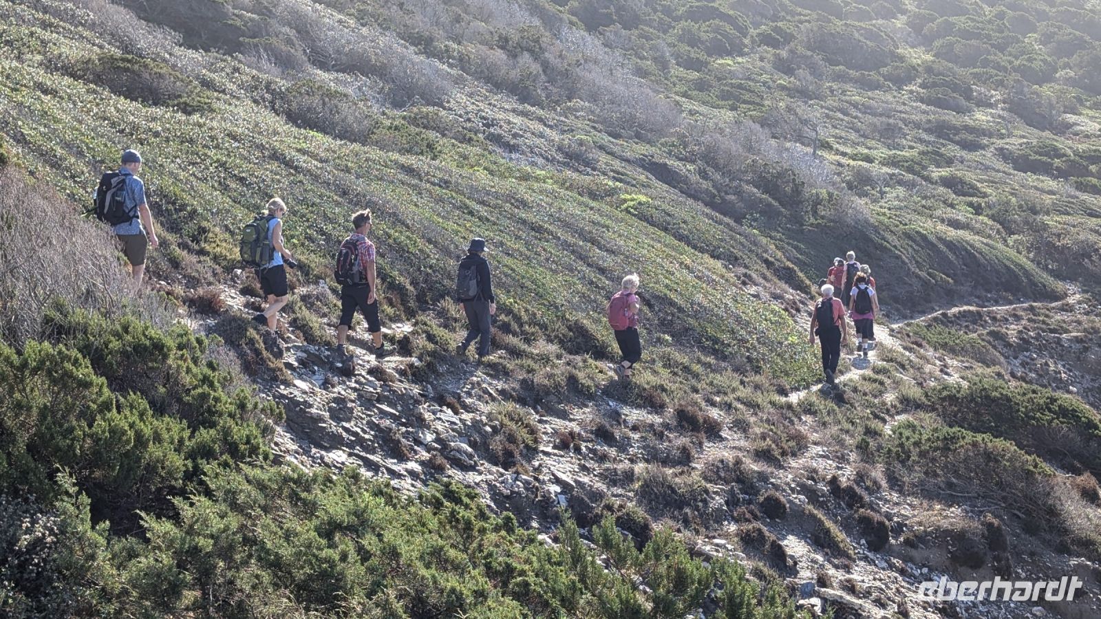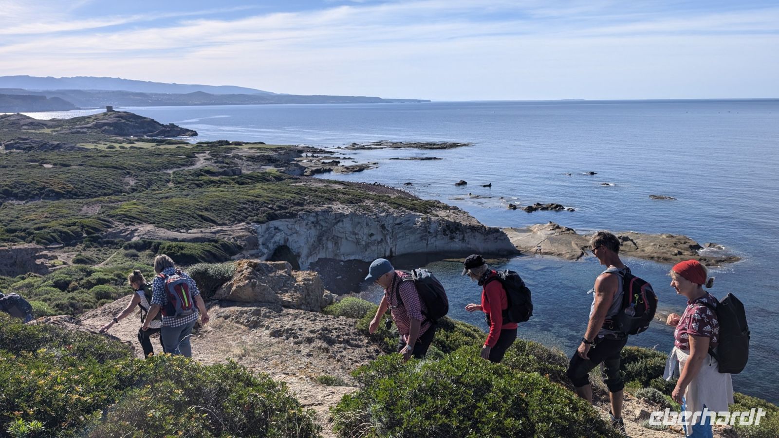 Noch ein grandioser Ausblick hinunter aufs Meer und dann führte uns Carlo auf einer spannenden Wanderung hinein in die Unwegsamkeit einer unberührten Landschaft mit mannshohen Macchiagewächsen. Mastixbeeren, Wacholderbäume, Wolfsmilch, eine Wanderung hinein in die Düfte Sardiniens.