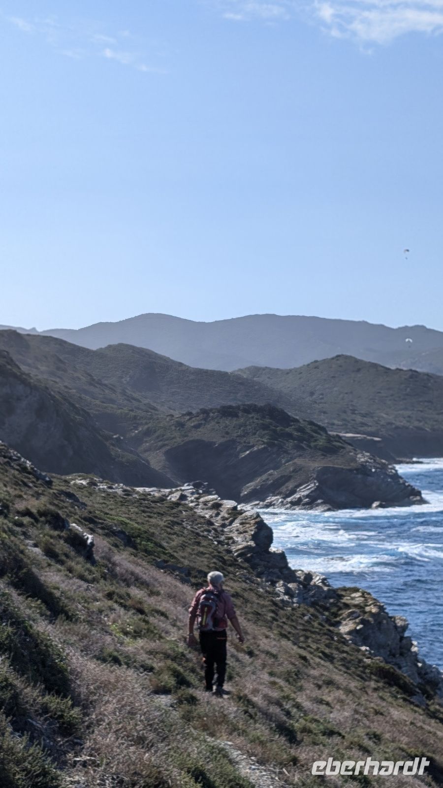 Über uns die Gleitschirmflieger in der Sonne und die Sträucher und Bäume trotzten dem Wind und neigten sich flach die Berhänge hinauf. Eine wundervolle, wilde und überwältigende Natur - die Nurra.