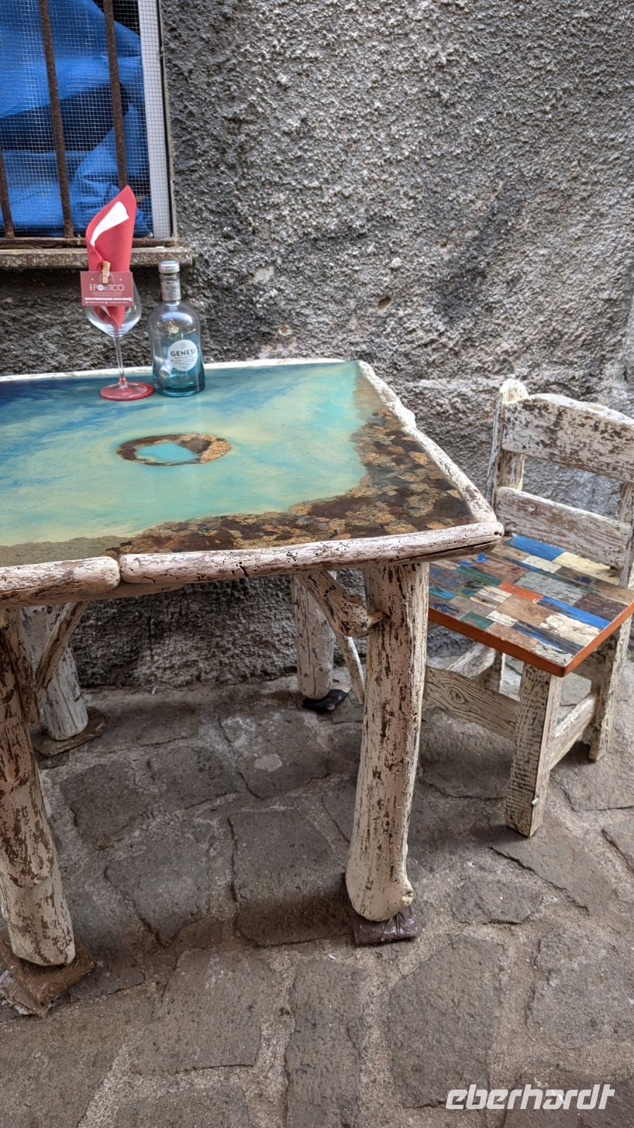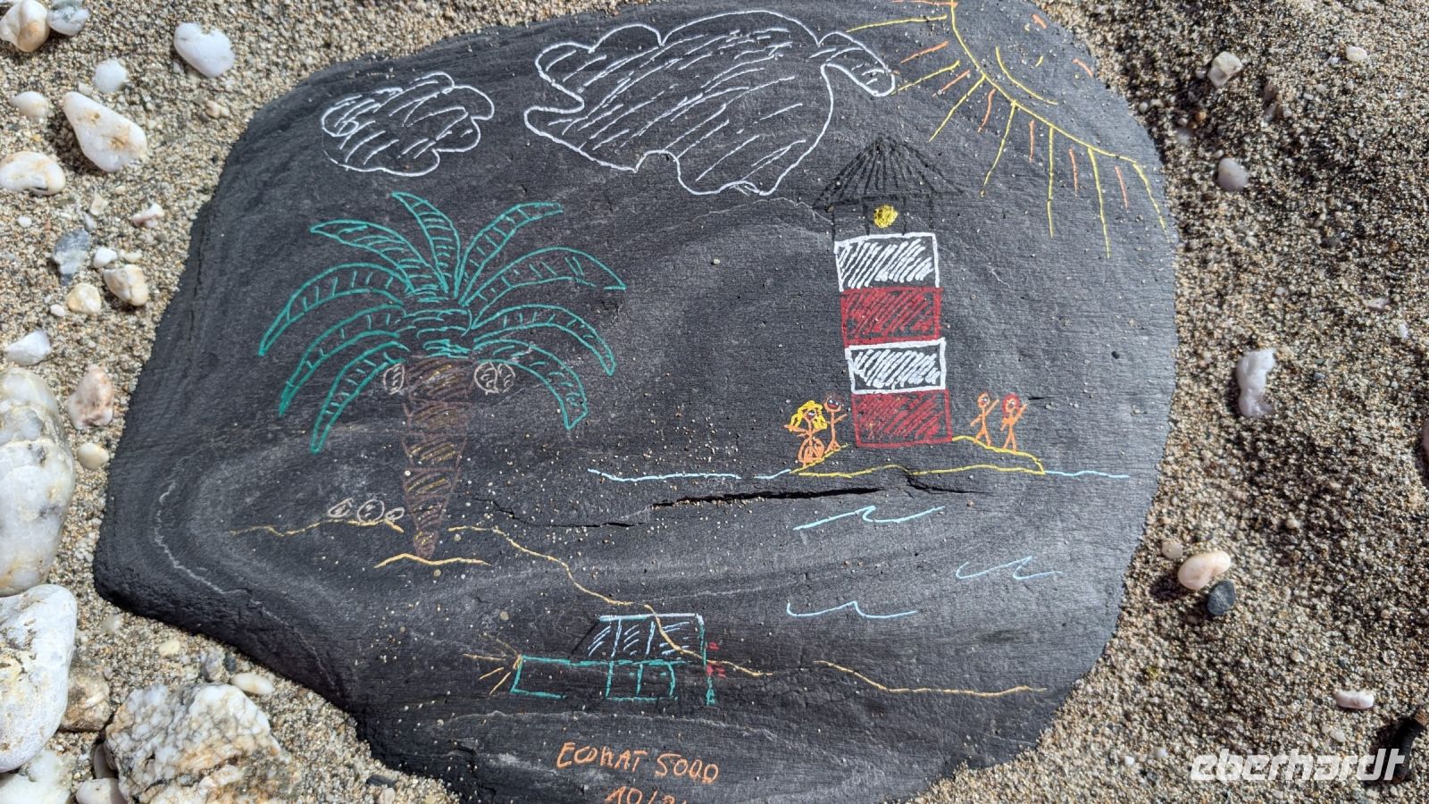 Nur ein kleiner, aber faszinierendes Strand, der Strand La Frana. Nicht jeder ging den steilen Weg hinunter, aber die, die ihn gingen wurden reich belohnt. Erinnert ihr euch noch an die kleinen Kunstwerke unten am Strand. Die kleinen Bilder auf Stein gemalt, die deutsche Speisekarte und an das kleine rote Herz, das sagt…“ich hab dich lieb“?