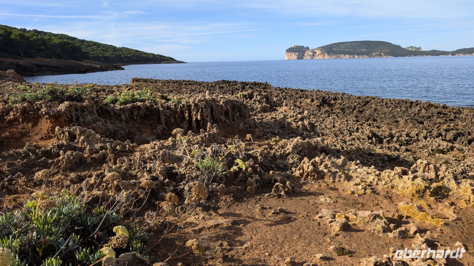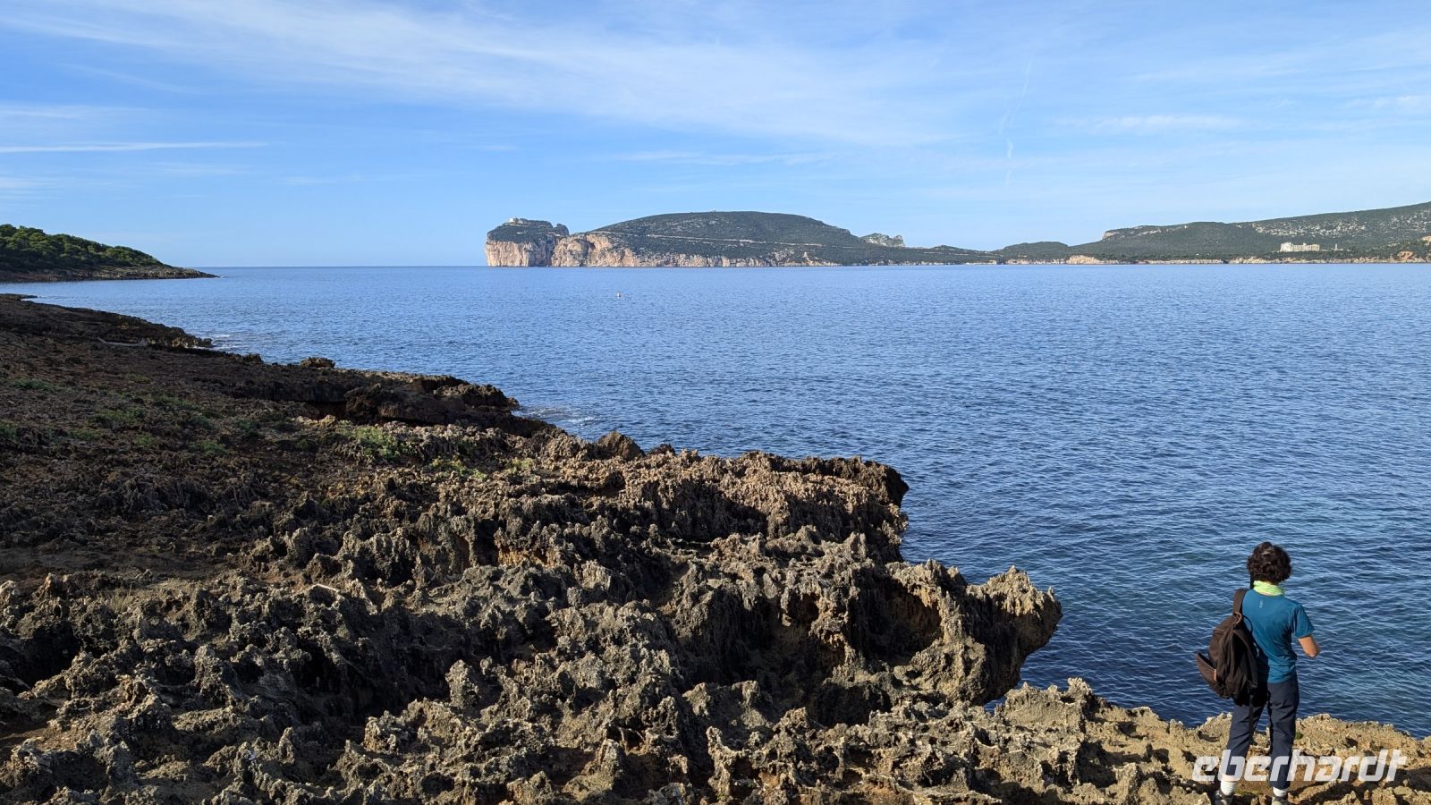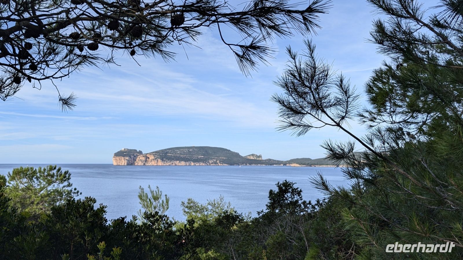 Belvedere, der berühmte Aussichtspunkt hinüber zur Insel La Foradada im Westen und im Osten der Blick auf die Bucht und den Naturhafen Porto Conte.