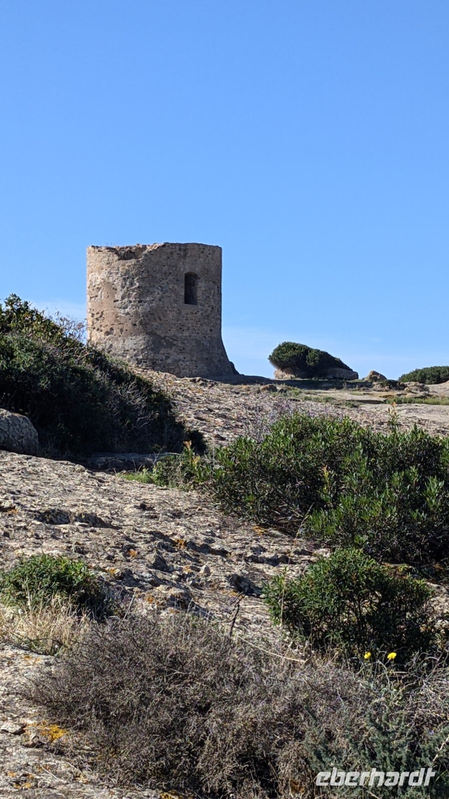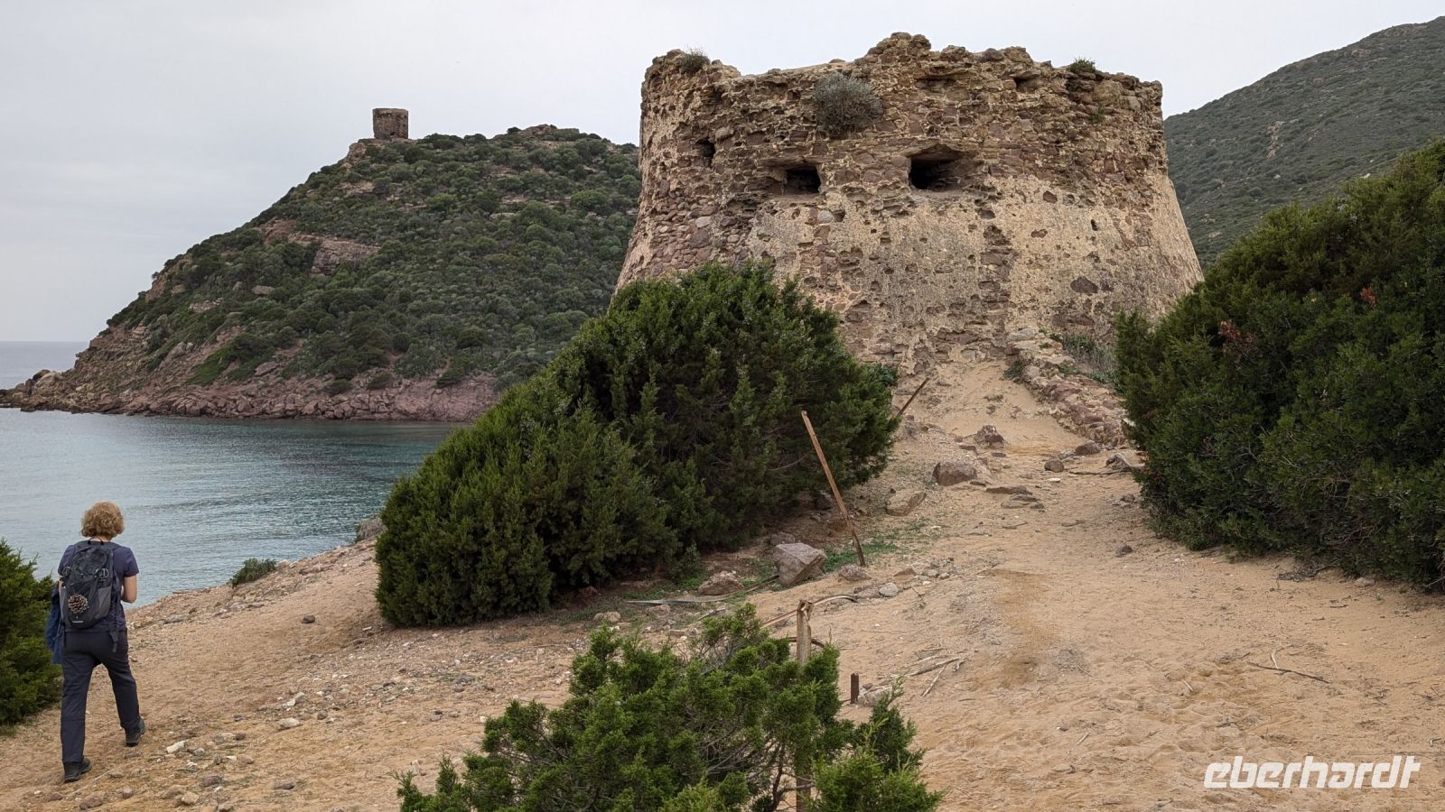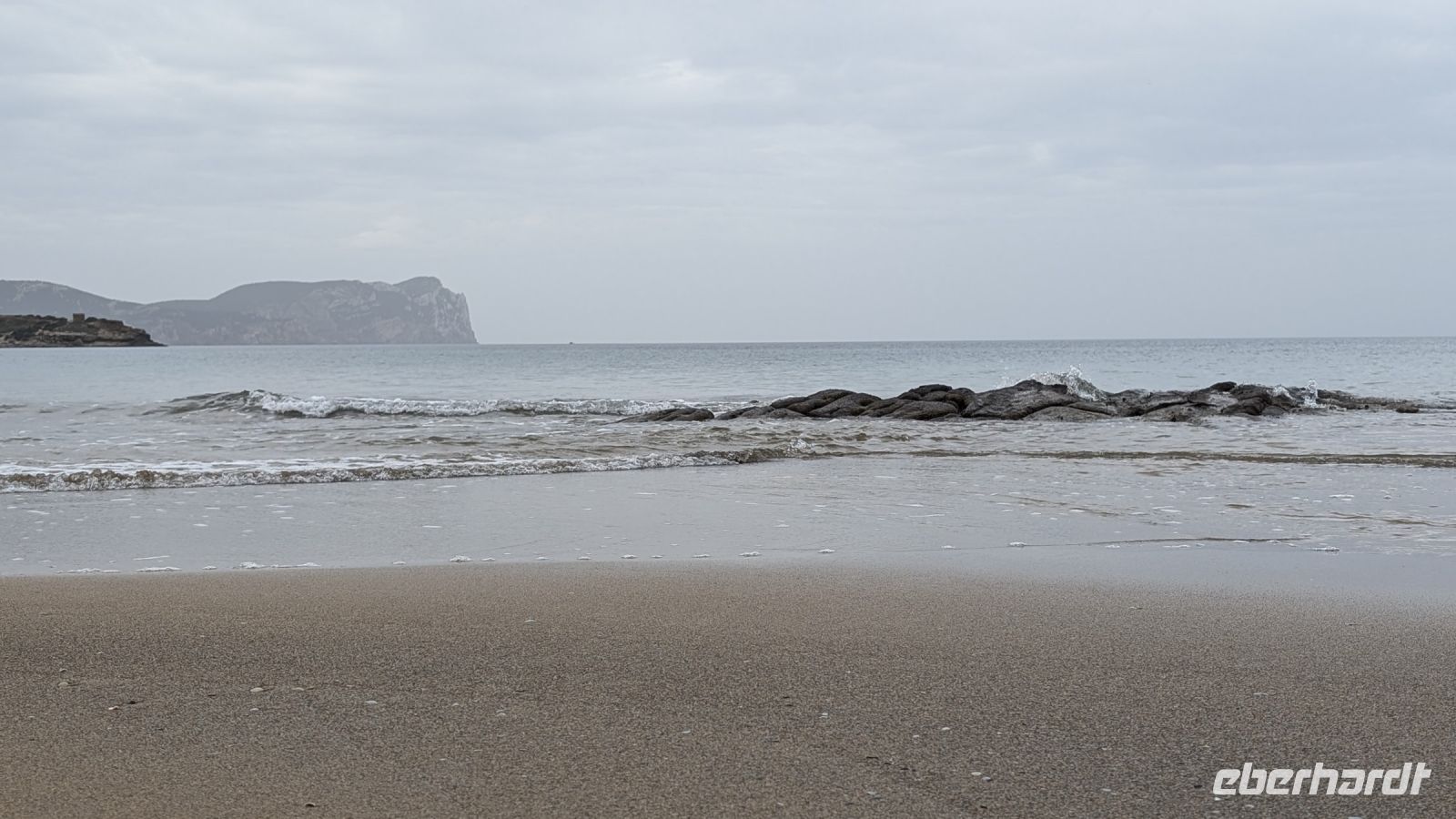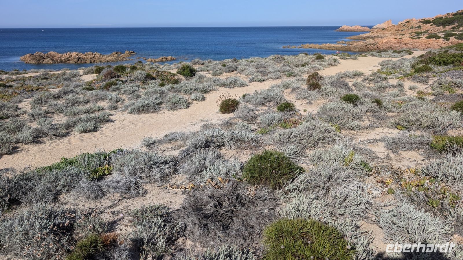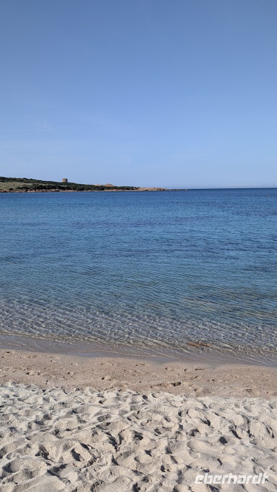 Durch ein ehemaliges Flussbett verließen wir das Biotop und gingen hinüber zu Porto Ferro und landeten am Torre Bianco. Wieder so ein herrlicher Sandstrand, der zum Baden einlud. Zum Glück hatte keiner Badesachen dabei. So blieb nur, die Schuhe ausziehen, die Hosen hochkrempeln und die Füsse ins Wasser.