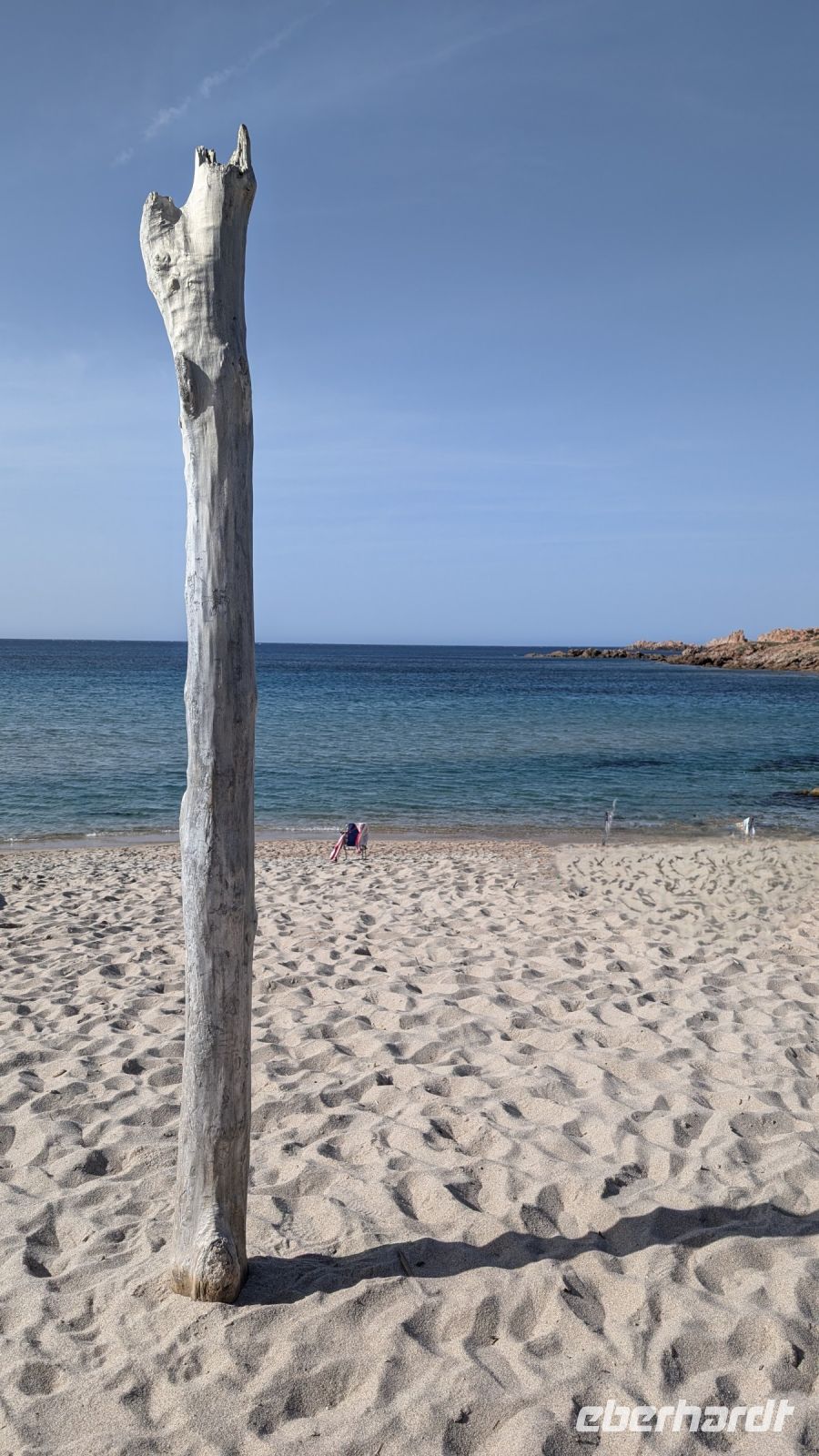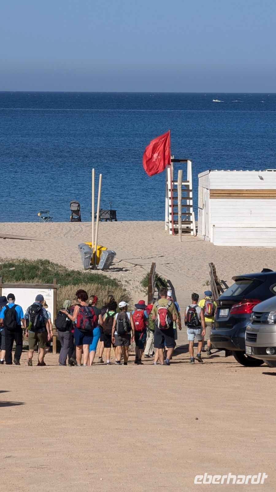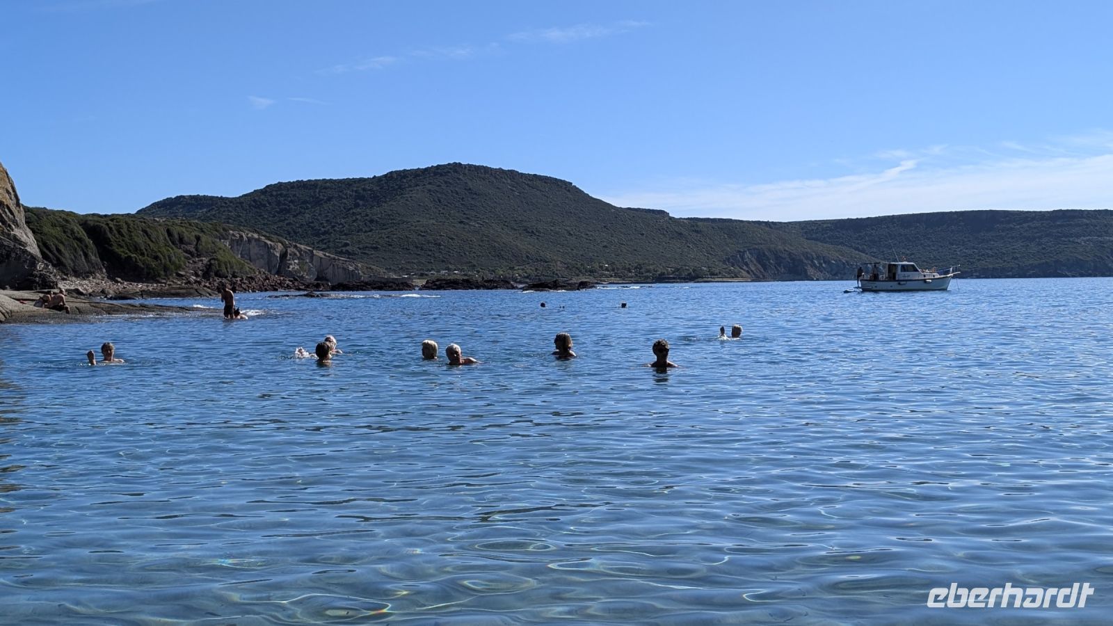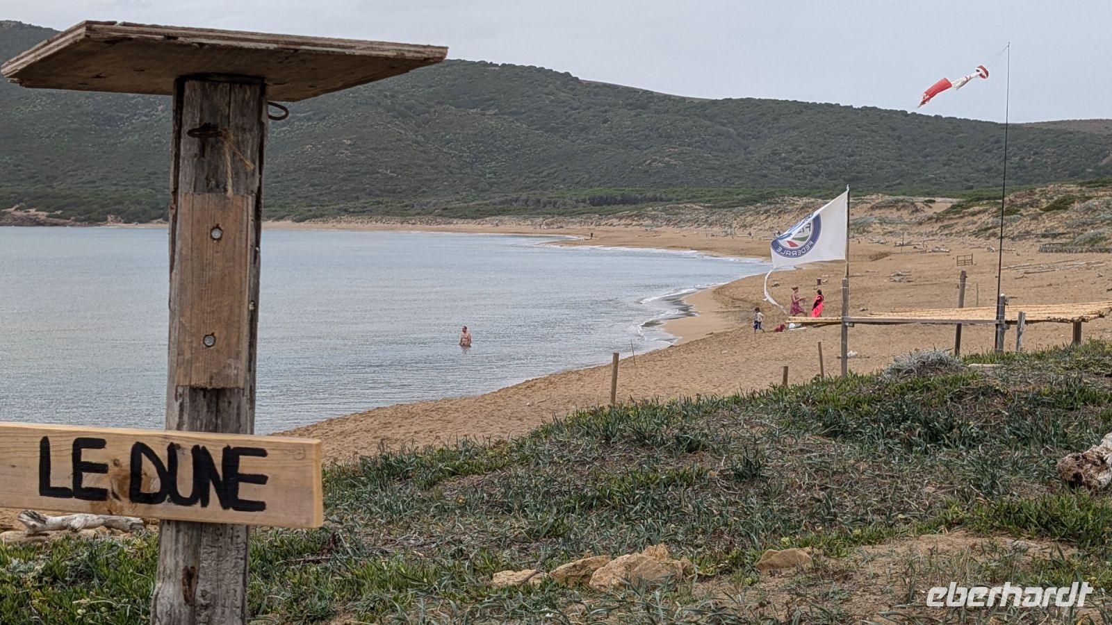 La Marinedda ist der Strand. Feinster Sandstrand, türkises kühlendes Wasser, Sonne pur, 30 Grad, die Stimmes des Meeres, das ruft, „Komm herein!!!“, Menschen, in der Sonne liegend und die das Dolce vita genossen. Die Strandbar mit kulinarischen Köstlichkeiten und wir, vollgepackt in Wanderschuhen und schwitzend in der Sonne stehend.