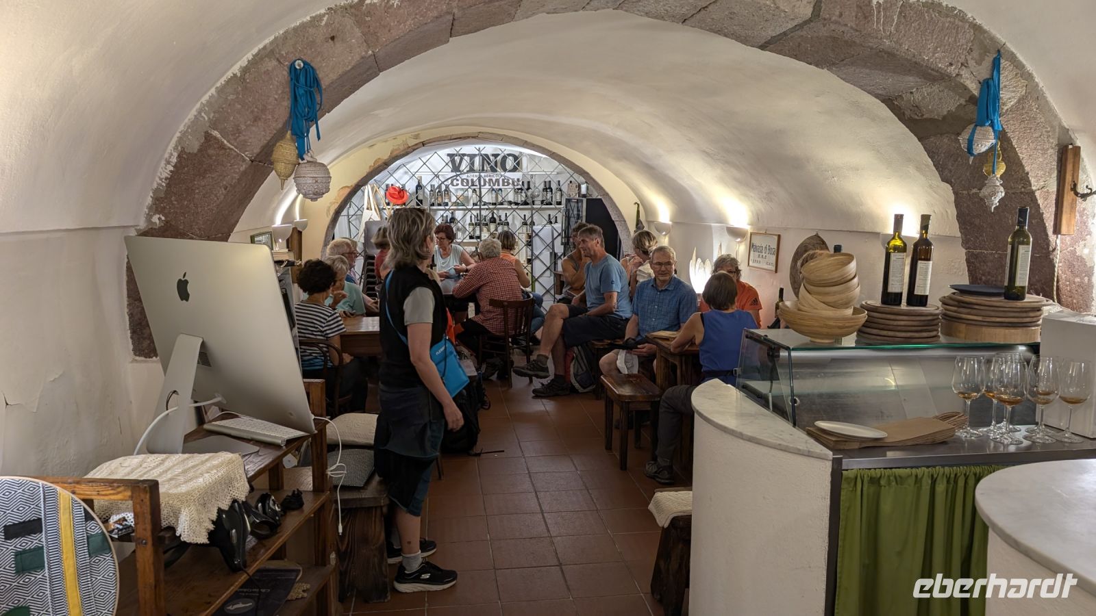 Zum Abschluss eines (ent-)spannenden Wandertages musste natürlich auch der kulinarische Sinn noch aktiviert werden. Nur Wasser trinken den ganzen Tag geht auch nicht. Bosa´s Gold – der Malvasia di Bosa, einst aus Griechenland importiert, lange gereift, goldgelb im Glas, süß im Abgang. Vanna Mazzon führte uns während der Verkostung in die Geheimnisse der Weinveredelung ein. Das spezielle Mikroklima und die salzhaltige Luft schützen den Wein vor Krankheiten und machen ihn so einzigartig und zu einer geschützten Marke.