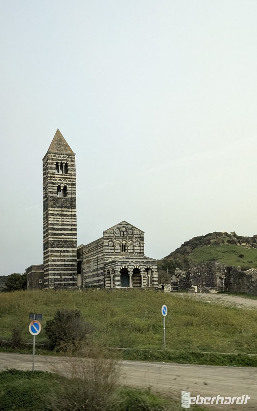 Bei Sassari, die auf Meeresboden gebaute Stadt, verließen wir die Nurra im Westen und betraten Logudoro im Osten. Auffällig und ganz bekannt, die romanische Kirche Santissima Trinitata di Saccaragia mit ihren roten und weißen Steinen.