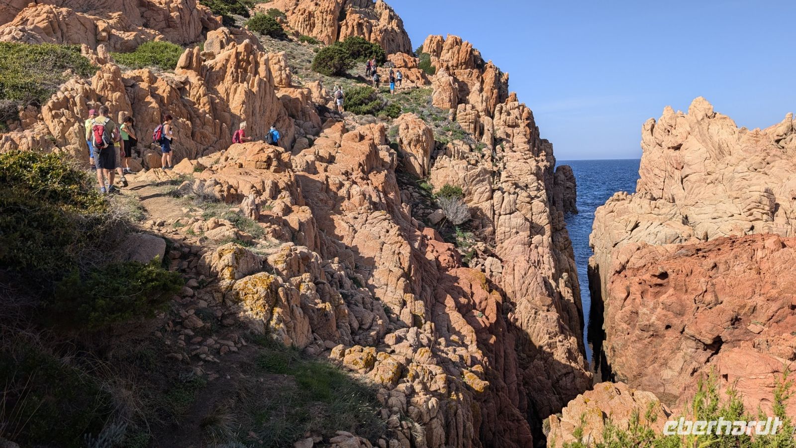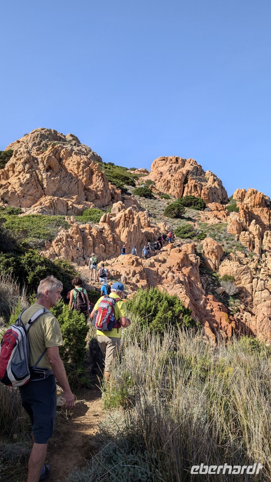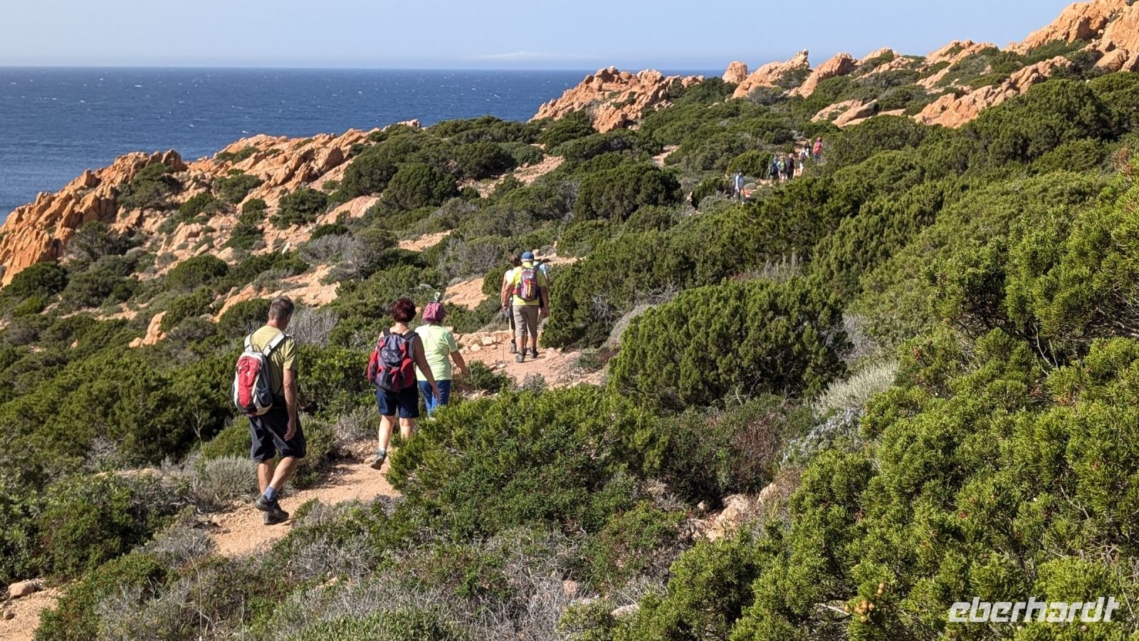 Und hier begann die eigentliche Wanderung. Der schönste Teil. In der Sonne die leuchtend roten Felsen der Cala Leone mit ihren grandiosen Felsformationen, geschaffen durch Erosion in tausenden von Jahren. Man konnte sich kaum sattsehen, so faszinierend war, was die Natur hier geschaffen hatte. Staunend kletterten wir hinauf zum Gipfel der Halbinsel li Cannetti und genossen einen herrlichen Ausblick und den Wind, der sich um die Mittagszeit dreht und landwärts zieht.