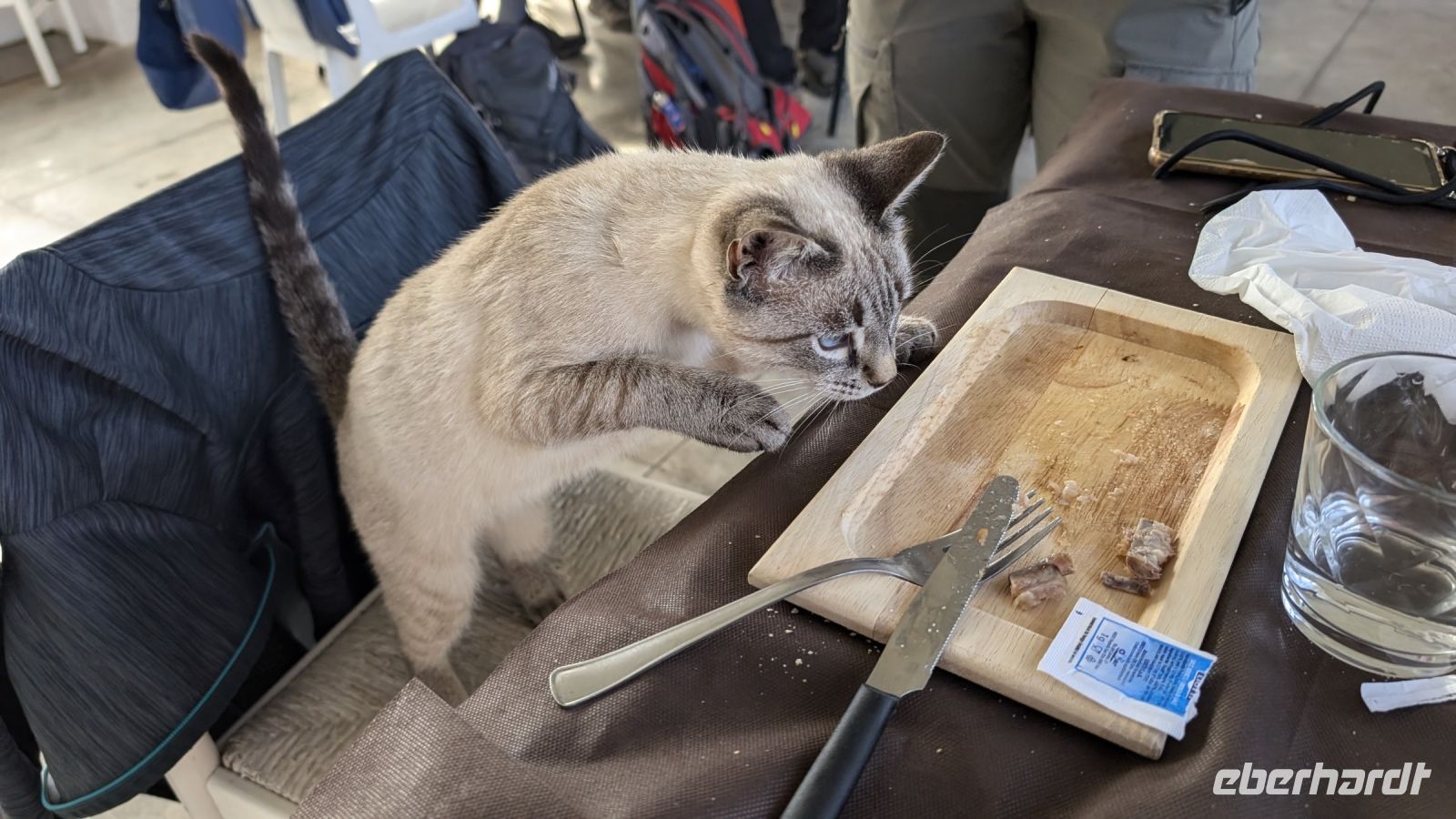 Hunde und Katzen hatten natürlich auch Hunger und versuchten höflich von dem ein oder anderen etwas zu bekommen. War dieser Versuch erfolglos, sprang schon mal eine Katze auf den Tisch und nahm sich ein Stück vom Teller, wenn man gerade nicht aufgepasst hatte. Naturinstinkt - wir waren beim Hirten in der Natur und nicht im Nobelviertel eines Sternerestaurant.