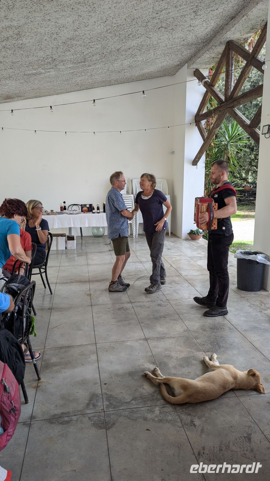 Wir hatten viel Spaß und man merkte die Herzlichkeit unserer sardischen Gastgeber. Beim Tanz machten viele mit und sogar das Servicepersonal tanzte und sang mit unserer Gruppe. Eine wahrlich „goldene“ Einlage kam von 2 Gästen. Wie es der Zufall wollte, konnten sie heute ihre „Goldene Hochzeit“ im wahrsten Sinne des Wortes vorfeiern, nur halt auf sardisch und in entsprechender Tracht.