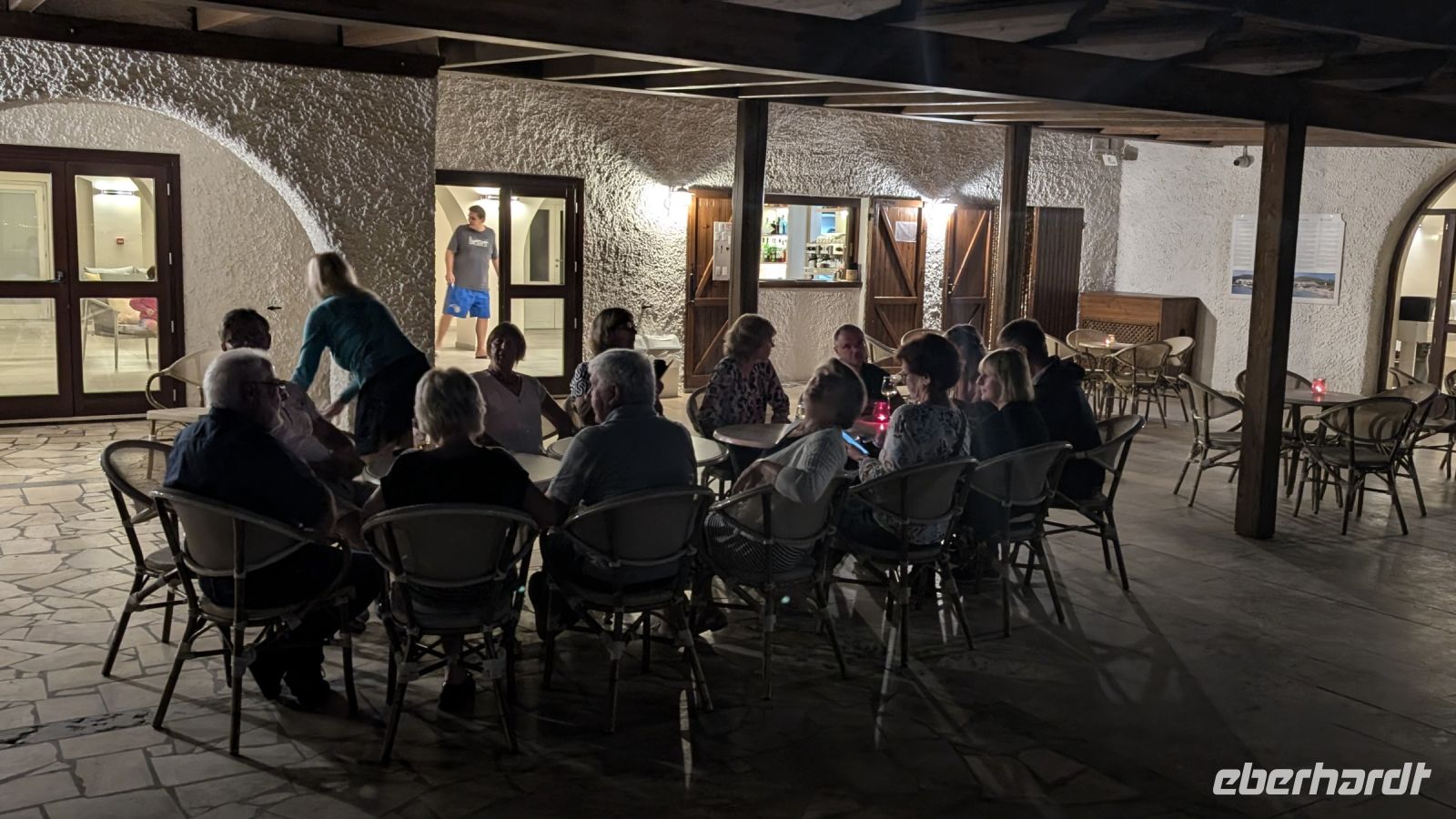 Es war bereits dunkel, als wir unser Hotel erreichten. Und heute gabs etwas, was es noch nie gab, ein Social-Event unter freiem Himmel – ein sardisches Aperitifo.