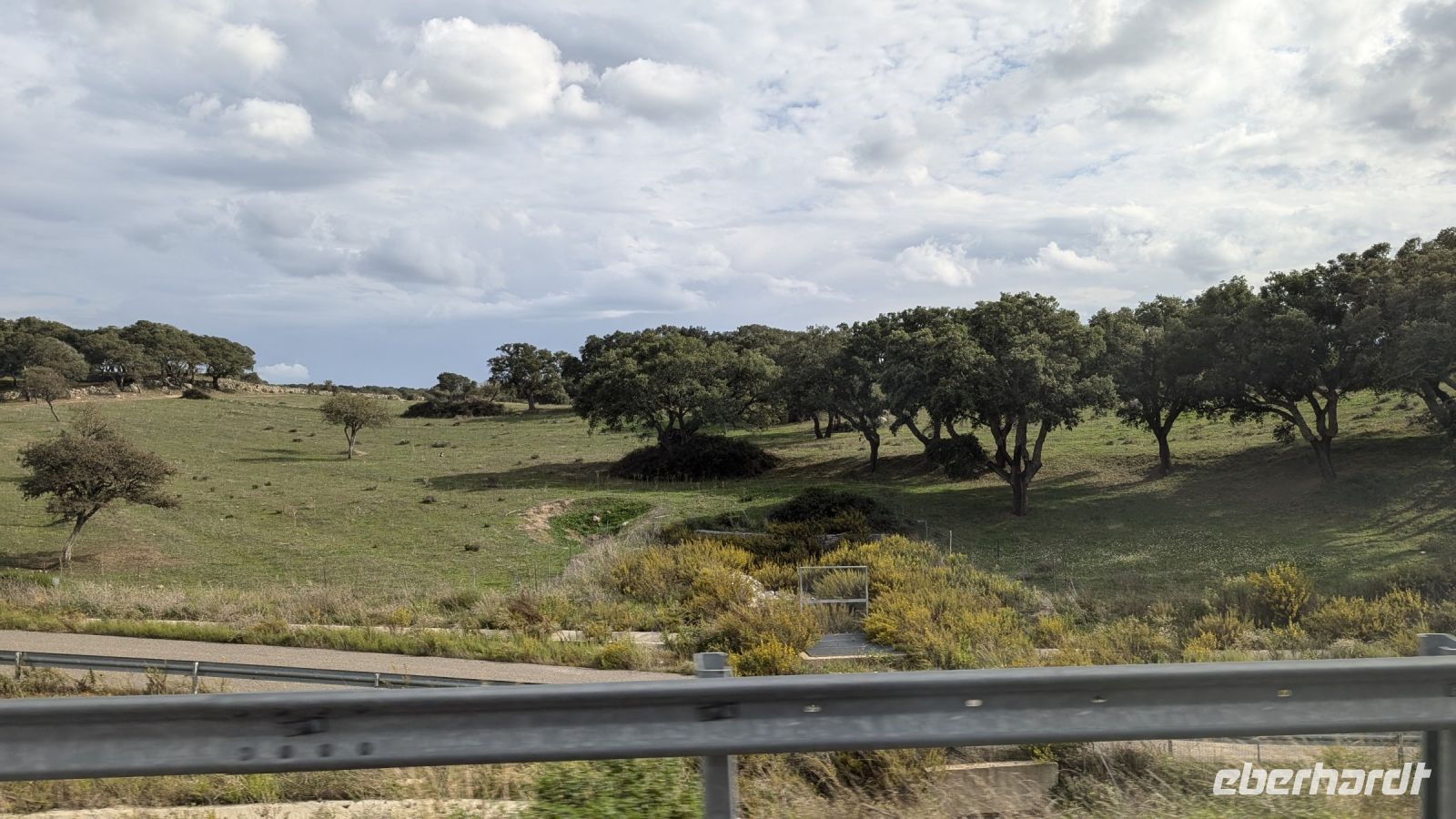 Korkeichenwälder entlang unseres Weges hinüber zur Gallura. Sie können bis zu 150 Jahre alt werden. Wie wir erfuhren, ist der Kork in den ersten Lebensjahren eines Baumes wertlos (Maskulin). Mit zunehmendem Alter verändert sich der Kork und wird weiblich.