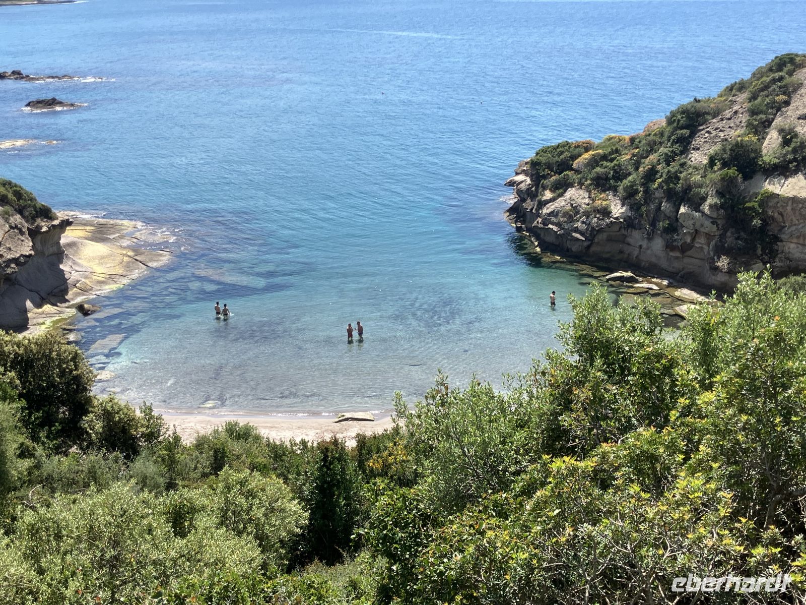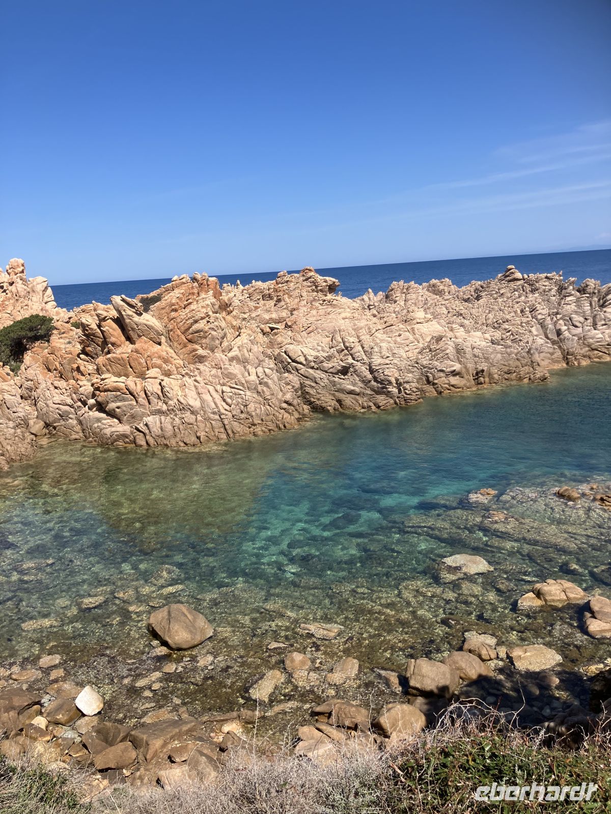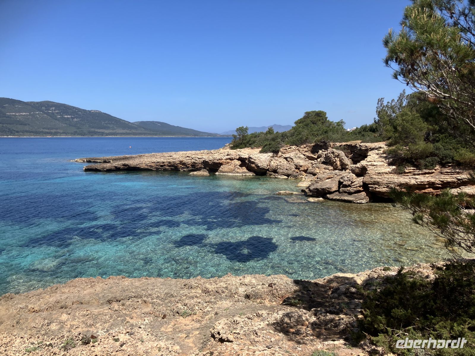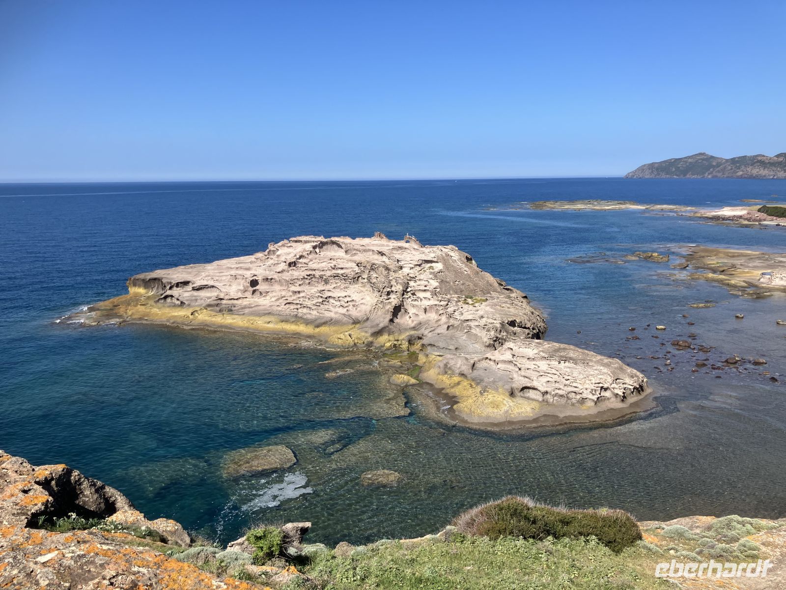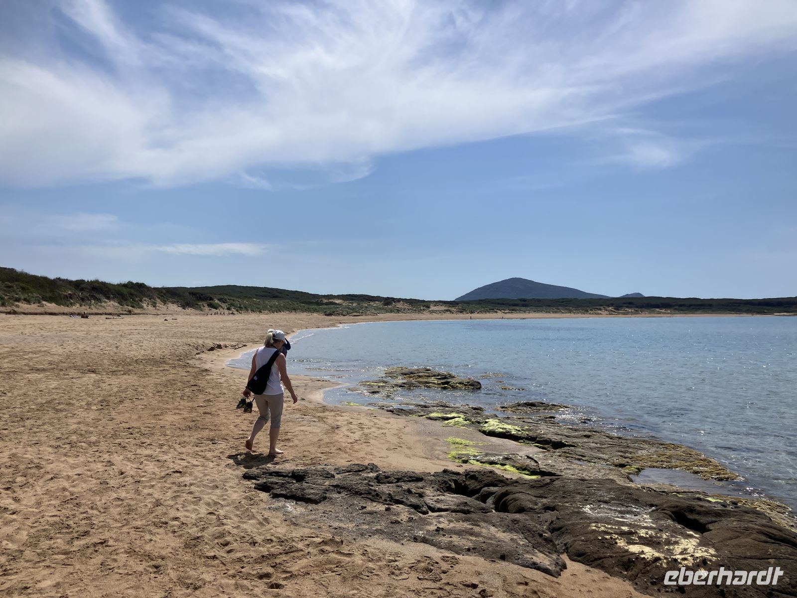Wir genießen das reichliche Frühstück und starten kurz nach 9:00 Uhr. Der Auastieg befindet sich in der Nähe des Örtchens Isola Rossa am Golf von Asinara. Wir wandern immer parallel zum Strand. Die Küste Sardiniens ist sehr vielfältig. Lange Gesteinsformationen werden von kleinem Badebuchten und längeren Sandstränden unterbrochen. Sardinien wird oft als die „Karibik Europas“ bezeichnet, da die Insel mit kristallklarem, türkisblauem Wasser und feinsten Sandstränden auf über 1.800 km Küstenlänge beeindruckt. Der Sandstrand Cala Golorite schaffte es 2025 sogar in die Top 25 der schönsten Strände der Welt. Das besonders klare Wasser rund um sardiniens Küste resultiert aus der reichlichen Sauerstoffproduktion des Seegrases.