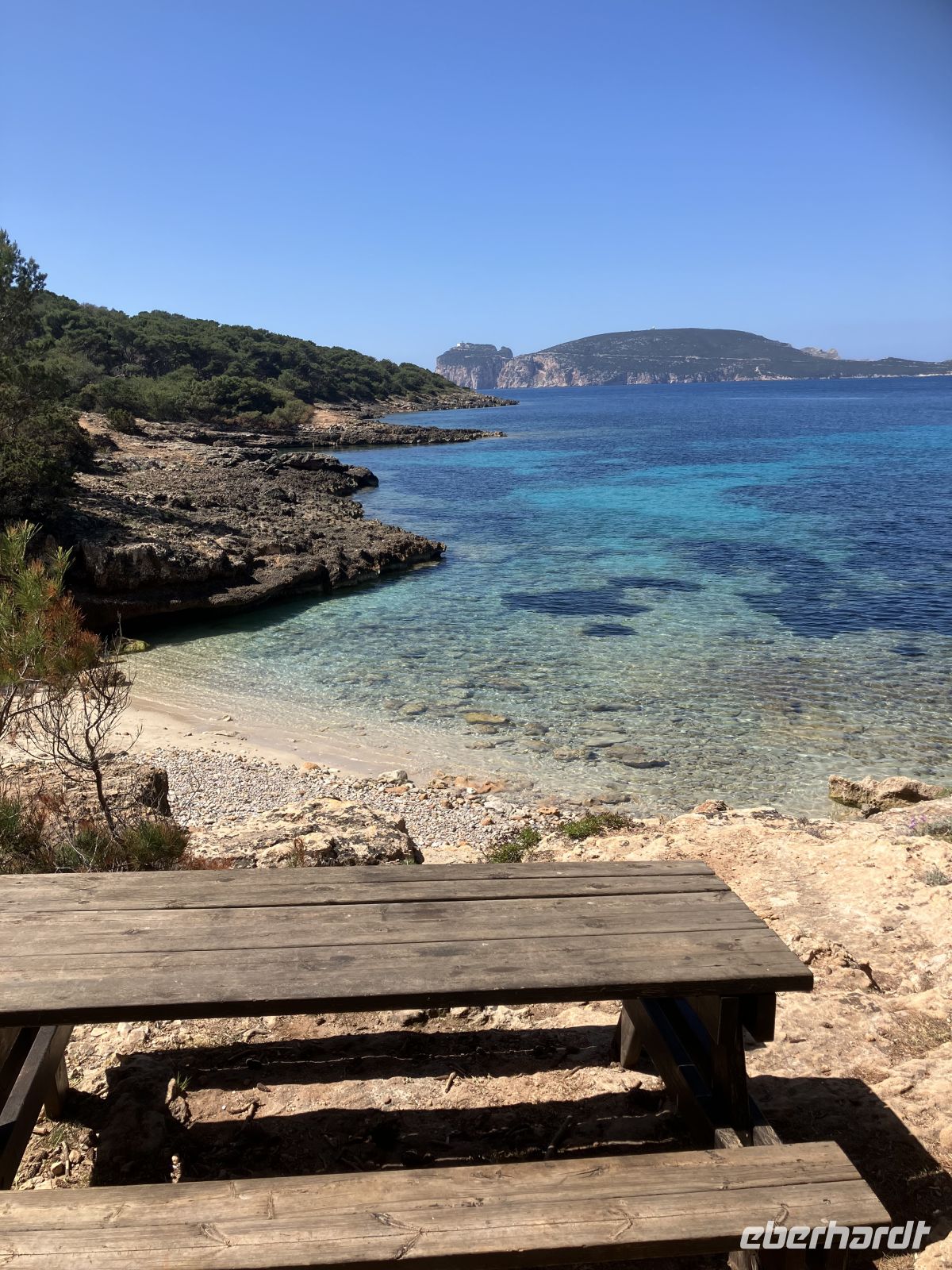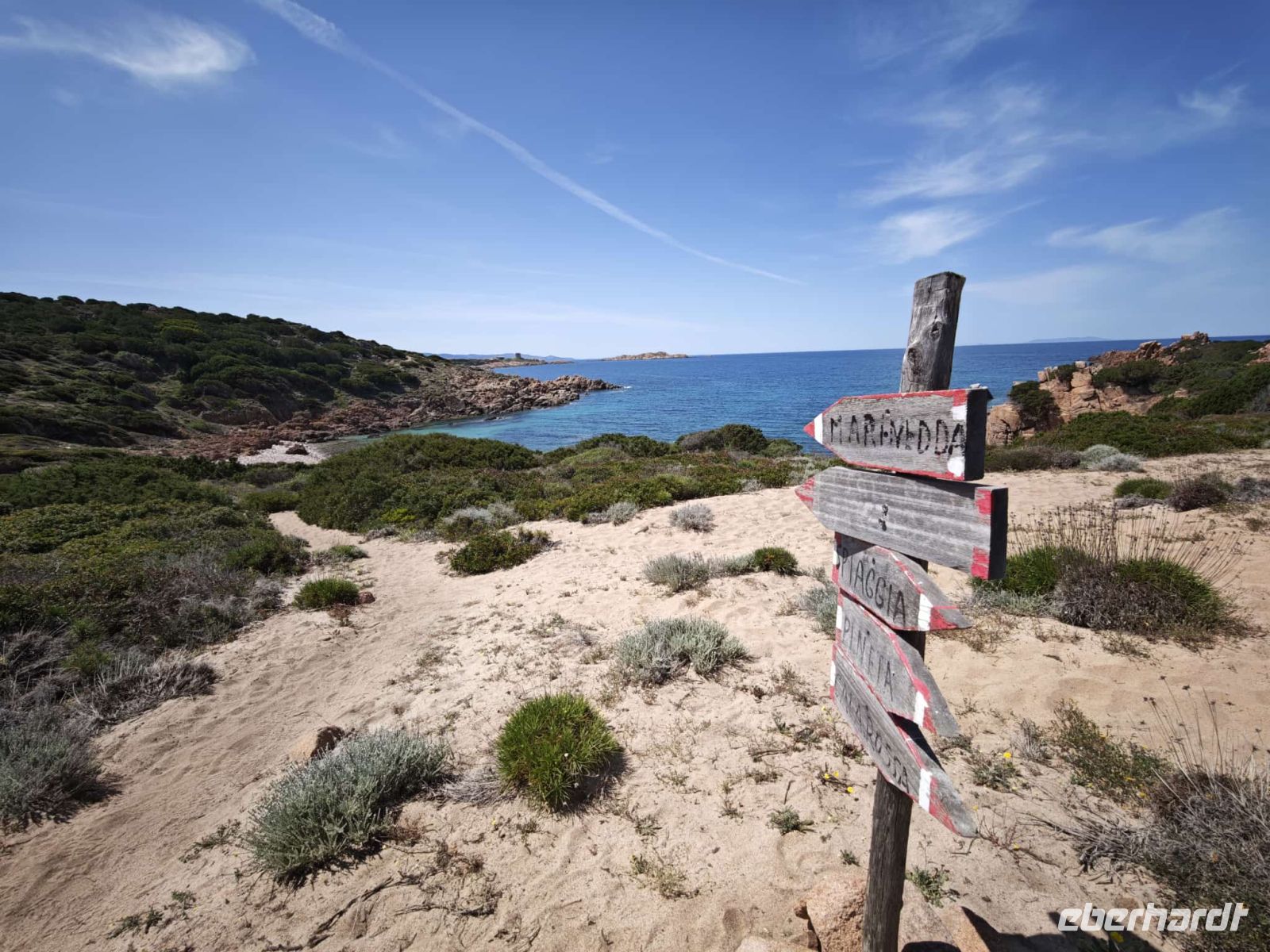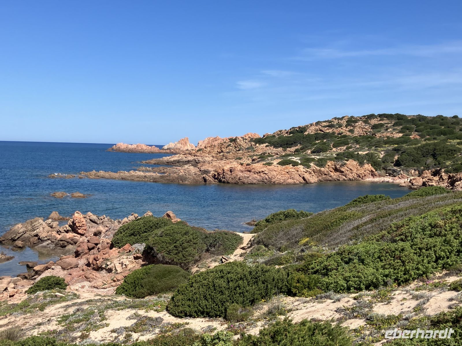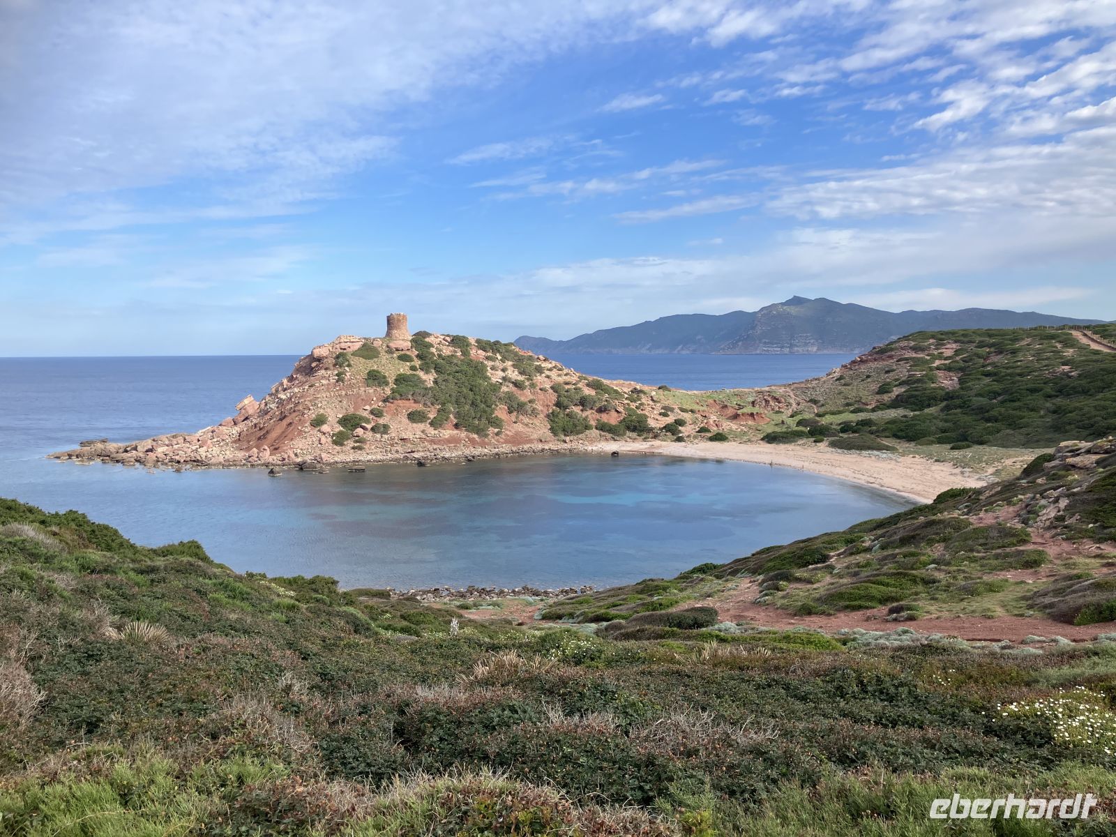 Wir genießen das reichliche Frühstück und starten kurz nach 9:00 Uhr. Der Auastieg befindet sich in der Nähe des Örtchens Isola Rossa am Golf von Asinara. Wir wandern immer parallel zum Strand. Die Küste Sardiniens ist sehr vielfältig. Lange Gesteinsformationen werden von kleinem Badebuchten und längeren Sandstränden unterbrochen. Sardinien wird oft als die „Karibik Europas“ bezeichnet, da die Insel mit kristallklarem, türkisblauem Wasser und feinsten Sandstränden auf über 1.800 km Küstenlänge beeindruckt. Der Sandstrand Cala Golorite schaffte es 2025 sogar in die Top 25 der schönsten Strände der Welt. Das besonders klare Wasser rund um sardiniens Küste resultiert aus der reichlichen Sauerstoffproduktion des Seegrases.