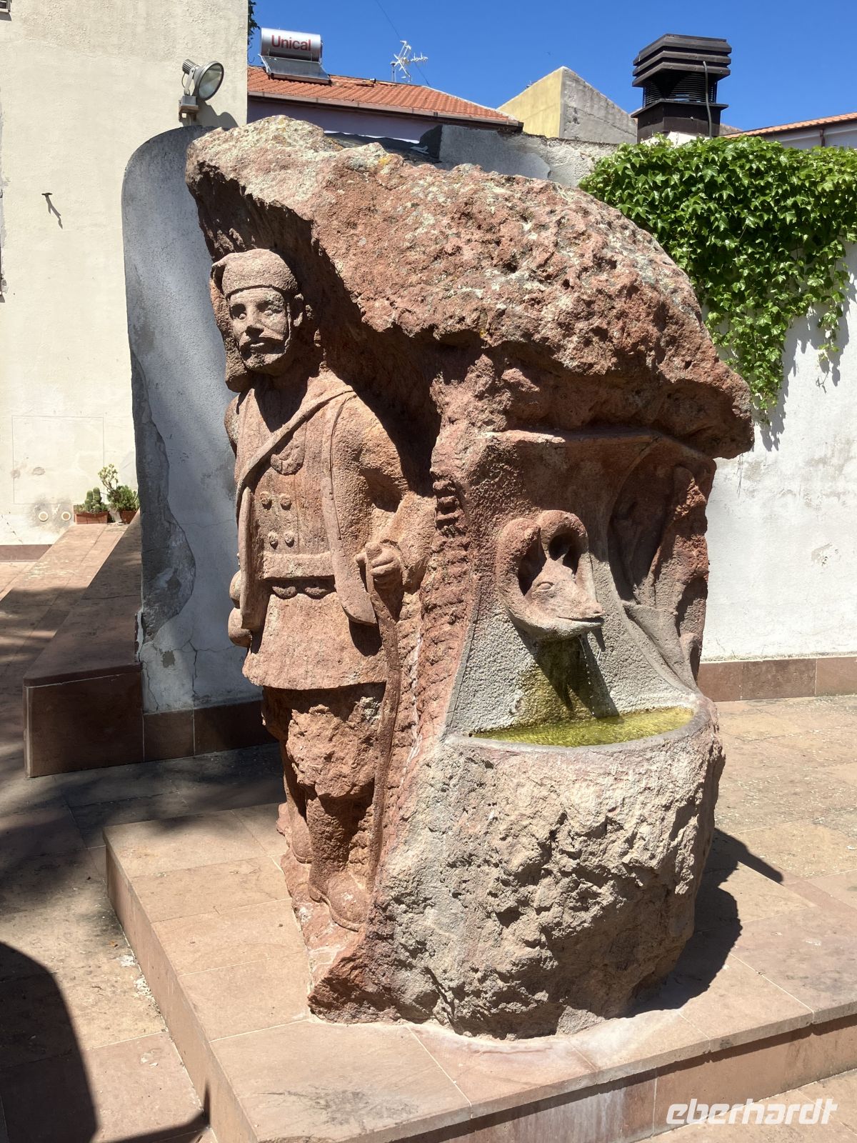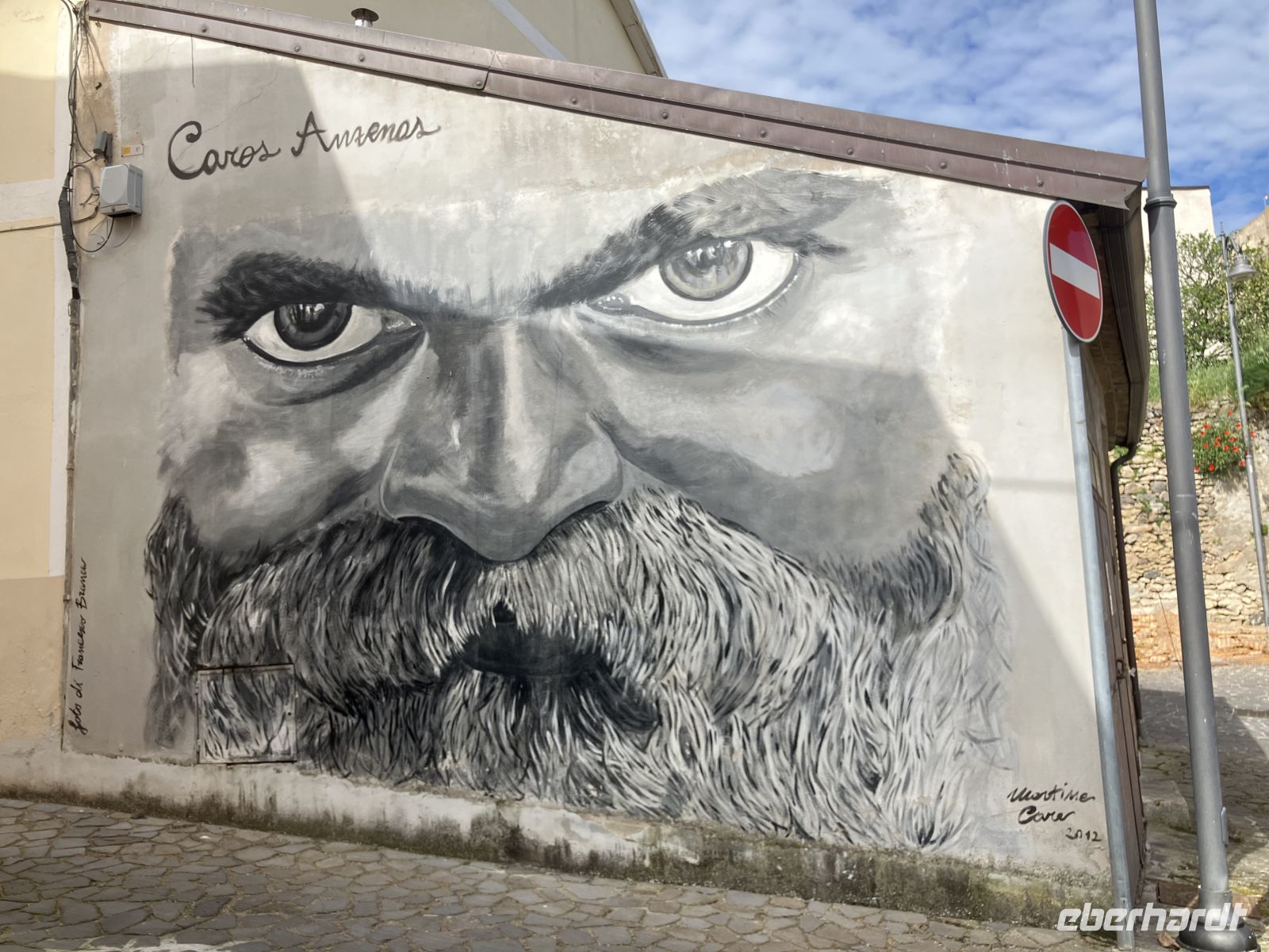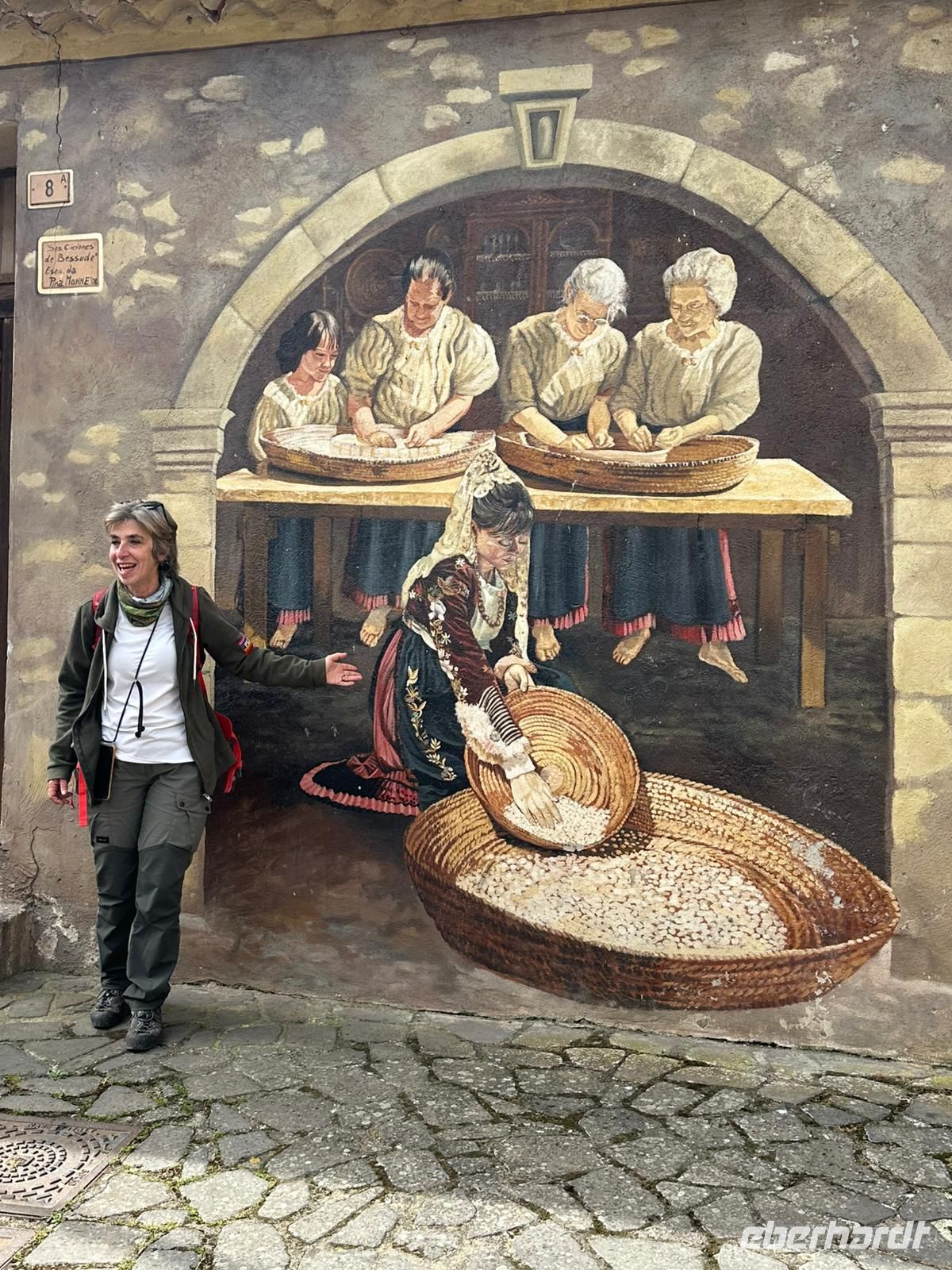 Unsere Fahrt führt uns ins Dörfchen Bessude. Während des Rundganges durch den Ort könne wir die vielfältigsten, sehr gelungen Wandmalereien bewundern. Wir wandern einen Höhenweg entlang und es bieten sich vielfältige Blicke in Schluchten und auf Tafelberge. Heute ist es reichlich warm und obwohl kaum Höhenmeter zu überwinden sind, kommen wir gut ins schwitzen. Wir erreichen den Ort Bonnanaro (Ort mit knapp 1.000 Einwohnern sind keine Seltenheit) und erreichen dort auch unseren Bus. Unser Ziel ist ein Besonderes. Mitten im Wald ist für uns eine Tafel hergerichtet. Wir werden von einer Hirtenfamilie bewirtet. Auf Sardinien sollen übrigens mehr Schafe (fast 2 Mio) als Menschen leben. Das Essen ist sehr reichlich und geschmacklich hervorragend. Begleitend spielt der Hausherr auf einem Schifferklavier für uns auf. Dazu wird neben Wein auch typisch sardischer Schnaps gereicht. So sind wir auf der Heimfahrt zum Hotel besonders ausgelassen und singen die von Flametta eingespielten Italoklassiker lauthals mit.