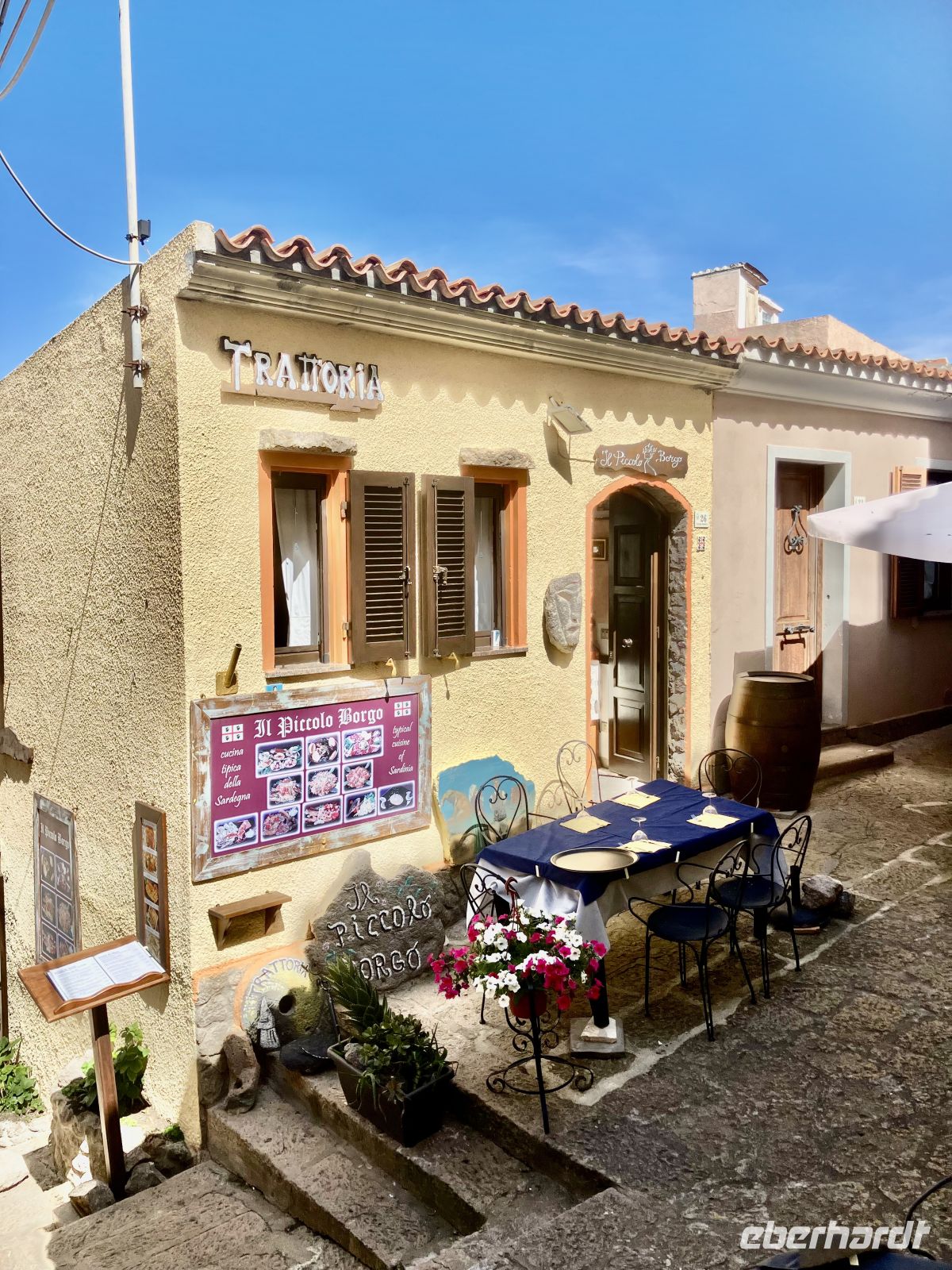 Nach ungefähr 2,5 Stunden erreichen wir wieder das Gasthaus, wo uns eine lange, schön eingedeckte Tafel erwartet. Wir können die regionale Küche in all seinen Facetten genießen, auch den schon erwähnten Weißwein. Auf dem Heimweg erreichen wir nach 30 Minuten den kleinen Ort Tempio, dem Bischofssitz von Tempio-Ampuria.