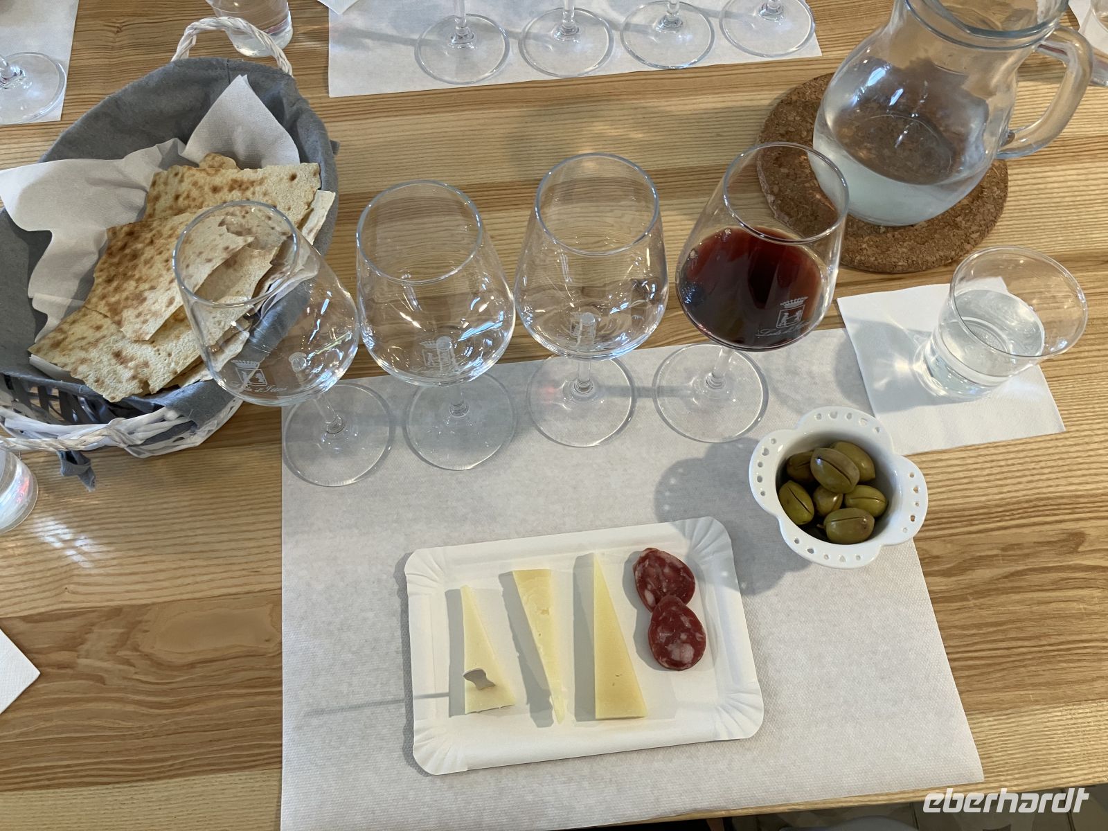 Wir verkosten vier hochwertige Weine und Olivenöl. Auch der obligatorische Imbiss bestehend aus Käse und Salami mundet sehr.
