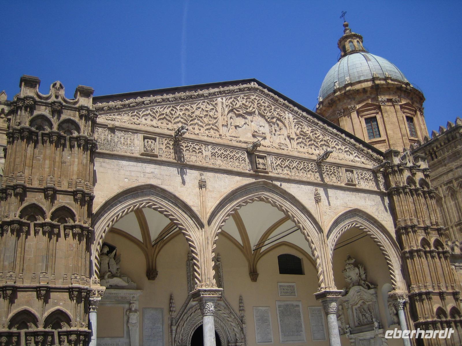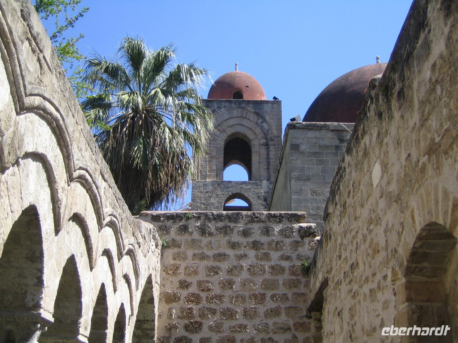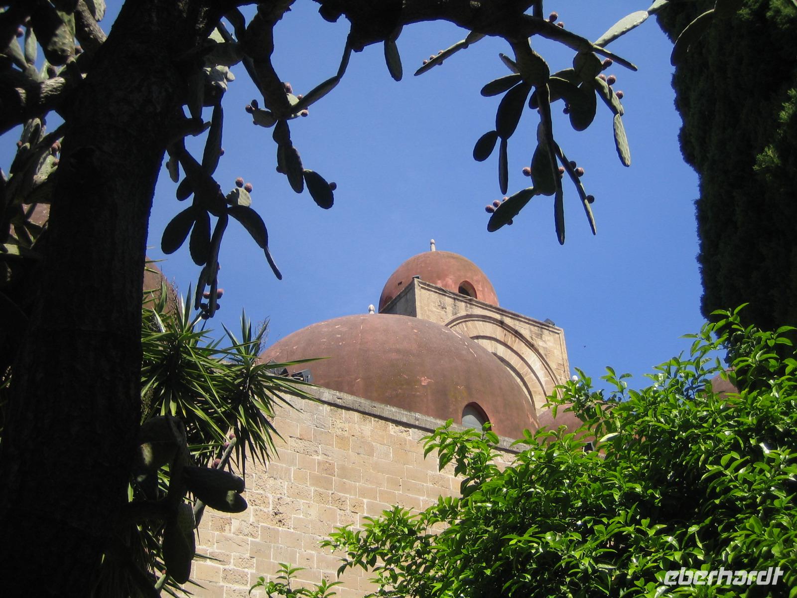 Den Vormittag verbringen wir in Cefalù, der kleinen, charmanten Stadt mit ihrem berühmten Sandstrand, ihrem mittelalterlichen Waschplatz und der Kathedrale San Salvator. Bei gutem Wetter kann man die Äolischen Inseln erblicken, heute liegen sie versunken im Dunst. Wir besichtigen die Kathedrale, die wie auch die Capella Palatina in Palermo vom Normannenkönig Roger II erbaut worden ist. Dann reisen wir weiter, in die Hauptstadt Siziliens. An der Piazza Independenza treffen wir unsere Stadtführerin Maria. Mit ihr gehen wir am Normannenpalast vorbei ein Stück durch die Altstadt. Viele Kinder und Jugendliche sind heute in Palermo unterwegs und erklären die Kulturdenkmäler ihrer Stadt. Vor über 20 Jahren startete die Aktion „Schulen adoptieren Denkmäler" und so sind wir auch bei der Besichtigung der Kirche San Giovanni degli Eremiti von Kinderstimmen umringt. Unsere Stadtführerin Maria bringt uns durch einen schönen Park mit Rekonstruktionen von Mosaiken einer Römervilla bis zum Dom von Palermo. Bei unserer Führung durch das wundervolle Gebäude erklärt uns Maria auch die Königsgräber von Roger II und dem Federico Duo, wie der Stauferkönig Friedrich II. in Italien heißt. Dann fahren wir weiter, an der Porta Nuova vorbei, nach Monreale. Über fast 100 Stufen gelangen wir hinauf zum Domplatz. Dort verweilen wir im Café „Mirto" bei einen Imbiss aus köstlichen Arancini, einer echten Spezialität von Palermo. Frisch gestärkt besichtigen wir mit Maria zusammen den Dom von Monreale und den kunstvollen Kreuzgang des einstigen Benediktinerklosters. Nach einem Blick vom Aussichtspunkt hinunter auf Palermo gehen wir wieder zu unserem Reisebus und Sebastiano bringt uns zu unserem nächsten Domizil, dem Hotel Vittoria in Trapani an der Westküste Siziliens.