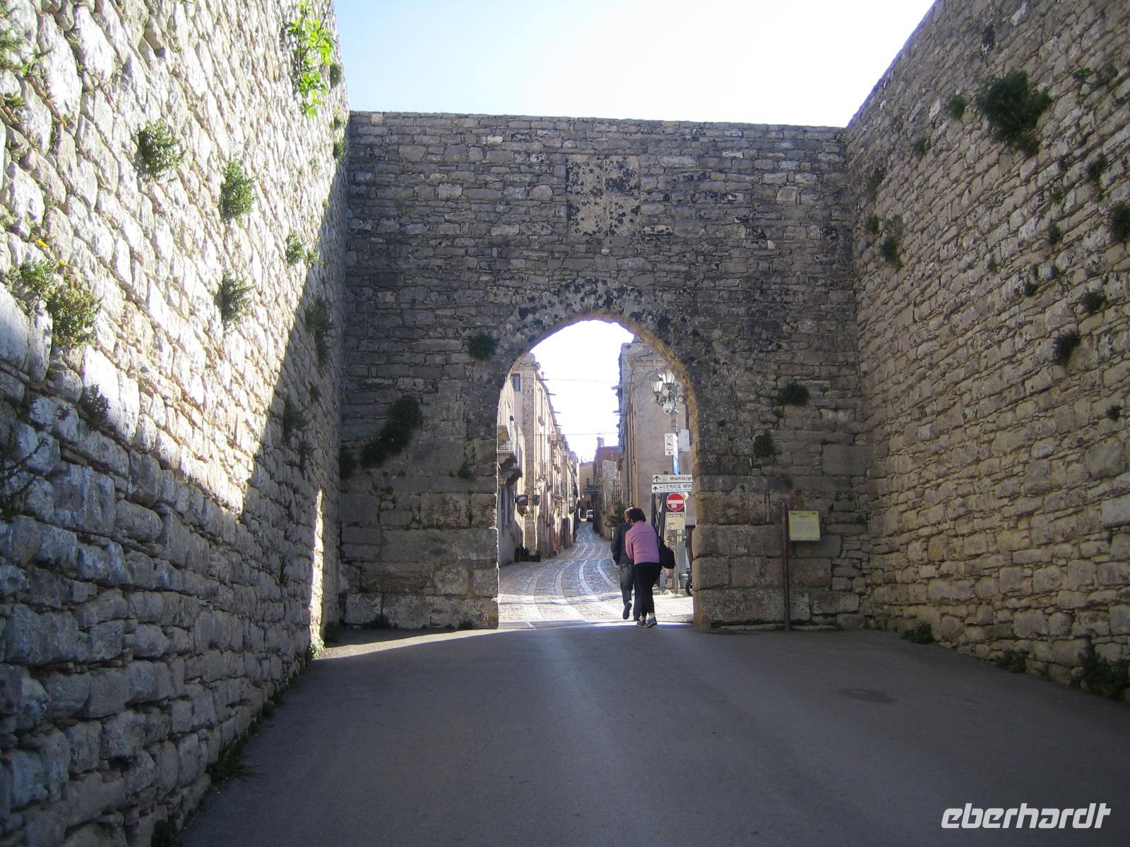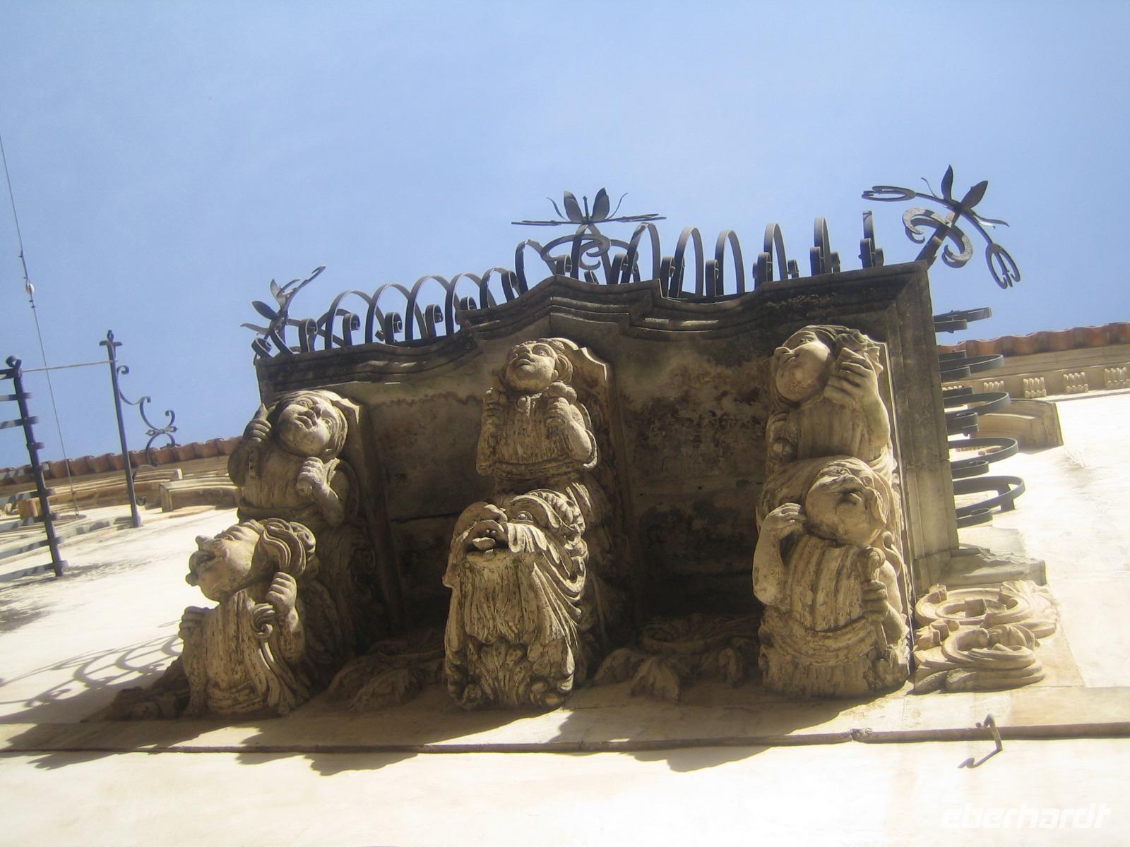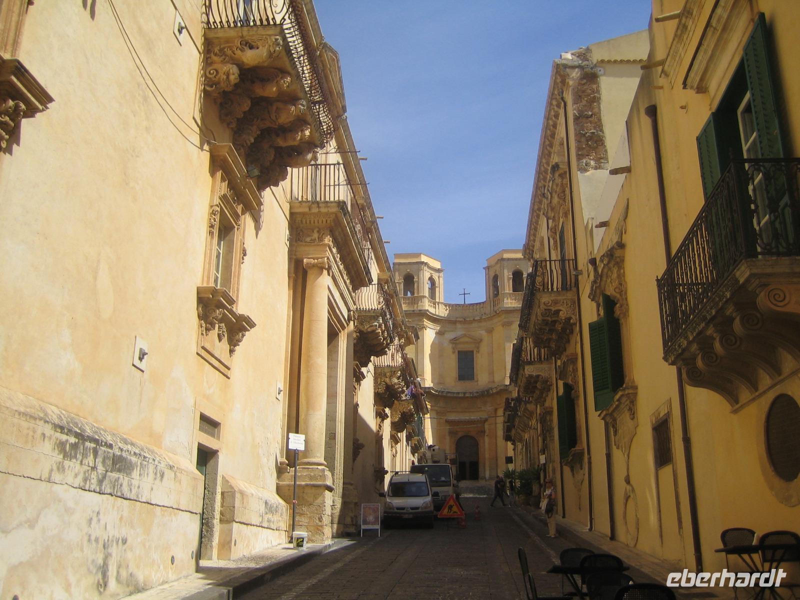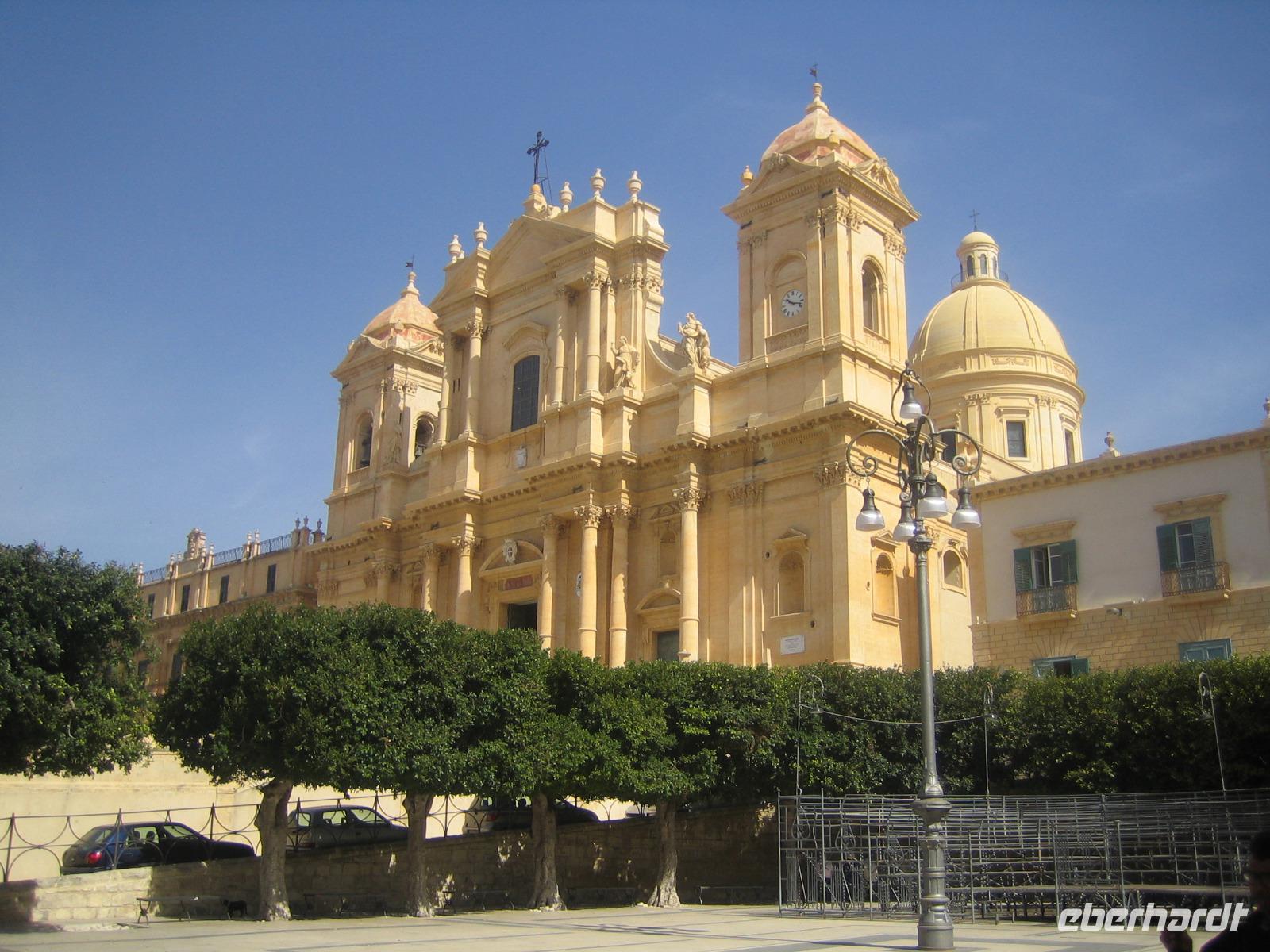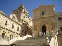 Noto ist unser Ziel am Vormittag. Wieder bringen wir unsere Koffer zum Reisebus und Sebastiano fährt uns zu der barocken Stadt. Beim Erdbeben von 1693 wurde fast die gesamte Ostküste Siziliens und damit auch Noto zerstört. Danach hat man es acht Kilometer südlich wieder erbaut, im damals modernen, typisch sizilianischen Stil des 17. Jahrhunderts. Marialina, die uns durch diesen Tag geleiten wird, empfängt uns am Eingang zur Stadt. Gemeinsam gehen wir durch das Königstor aus der Bourbonenzeit, an der Klosterkirche der Franziskaner vorbei zur rund gebauten Clarissenkirche und von dort weiter zur Kathedrale des heiligen Nicolaus, mit der in Noto die neuklassizistische Zeit Einzug hielt. Ihre Fresken sind jedoch erst 15 Jahre alt, denn Ende der 90er Jahre war das Gebäude zusammengebrochen und wurde neu rekonstruiert.
