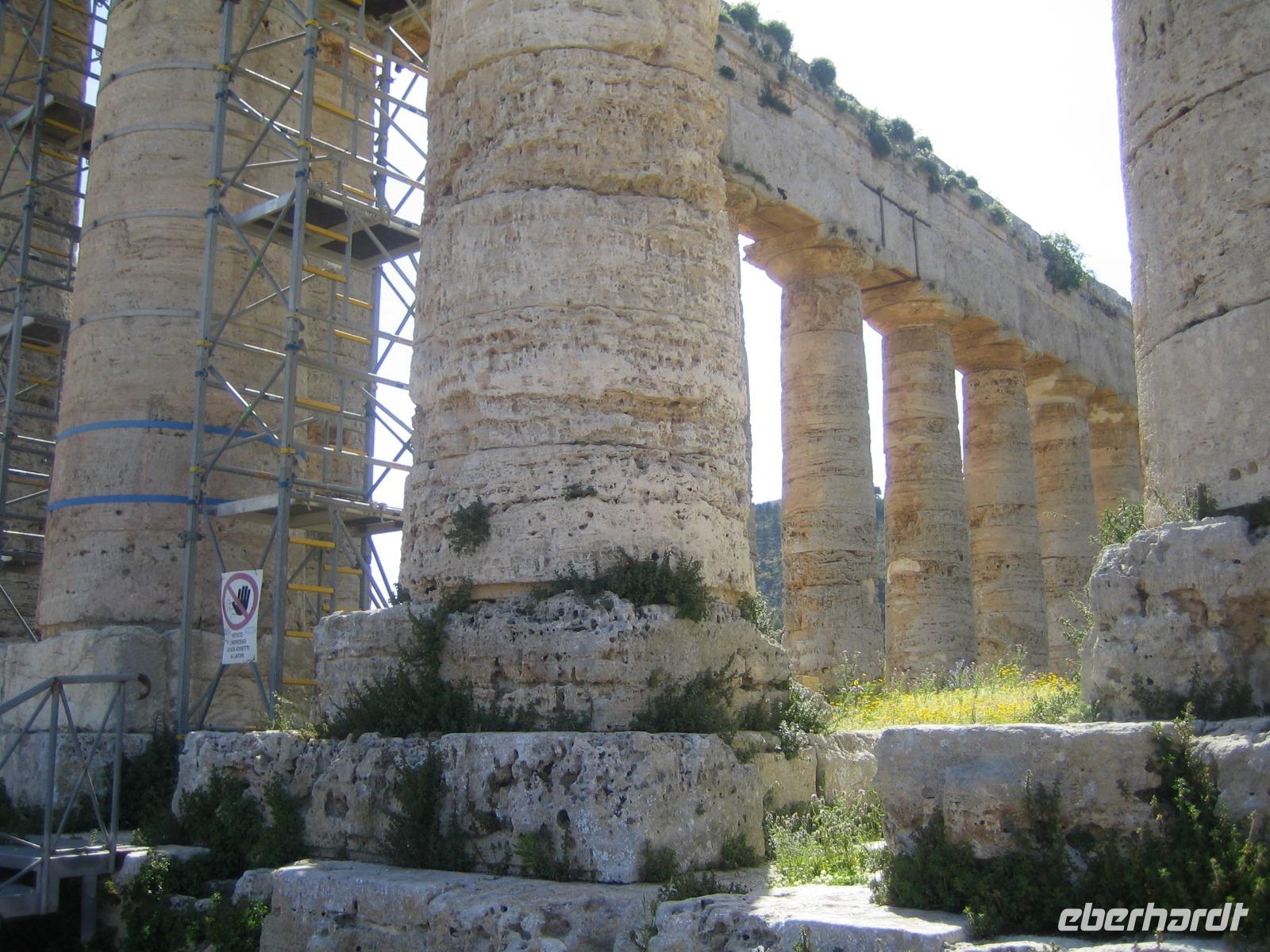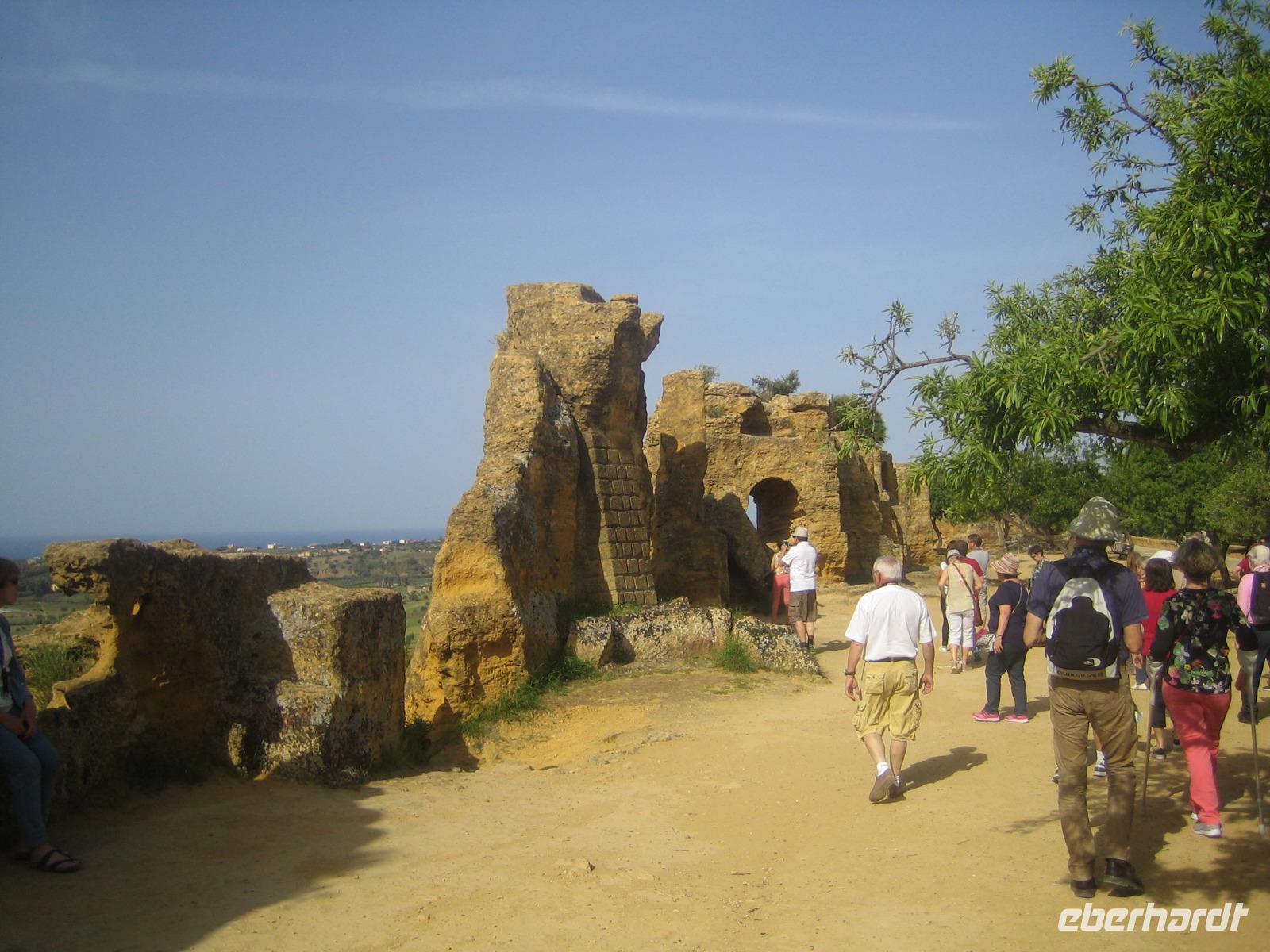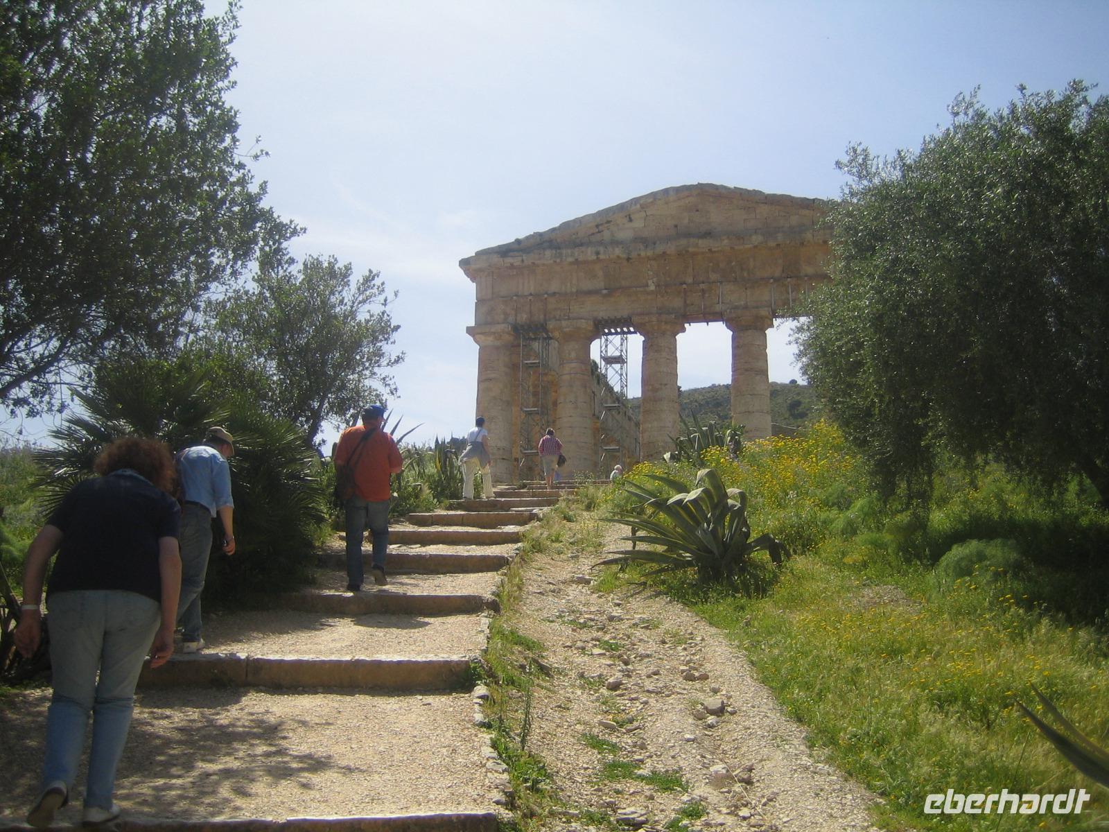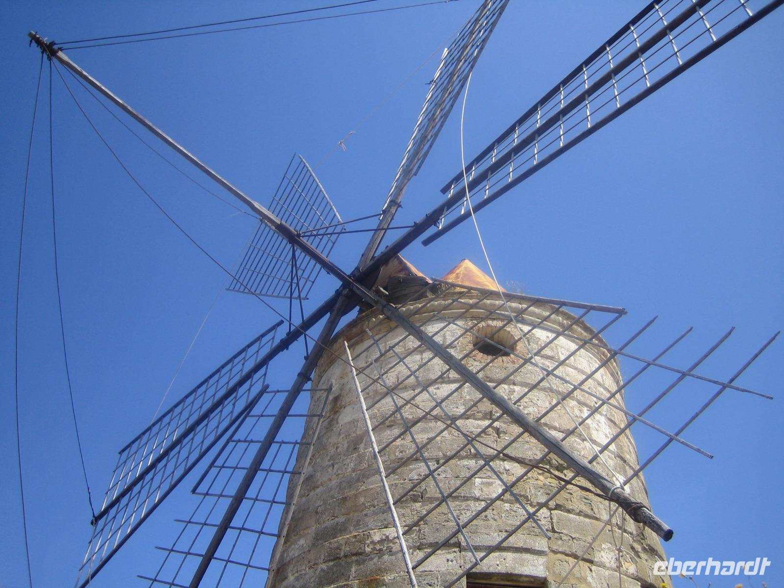 Kaum sind unsere Koffer wieder im Reisebus verstaut, fahren wir schon weiter, um die alte Stadt Erice besichtigen, die ganz oben auf einem Berg liegt. Unsere örtliche Reiseleiterin ist heute Regina und sie erzählt uns vom Land der Elymer, die Erice 1 000 Jahre vor Christus gründeten. Der Berg war ihnen heilig, weil er unzählige Süßwasserquellen birgt. Bis heute verehrt man hier die Göttin Aphrodite in einem Fruchtbarkeitskult. Bei einem Rundgang durch die verwinkelten Gassen der in Dreiecksform aufgebauten Stadt kommen wir schließlich zum Kastell, das die Normannen auf den Grundmauern des alten Aphrodite-Tempels bauen ließen. Über den Hauptplatz, der erst im 19. Jahrhundert geschaffen wurde, gelangen wir zur Marzipan- und Mandelbäckerei „Maria Grammatico". Wir sind eingeladen, den Backraum zu besichtigen und erhalten Kostproben der himmlisch süßen Spezialitäten. Maria Grammatico war 1963 die erste Frau Siziliens, die allein stehend einen Laden eröffnete. Dass das überhaupt nicht einfach war, beschreibt das Buch „Bittere Mandeln", das man in ihrem Geschäft kaufen kann. Sie selbst ist auch da, führt ihren Laden mit frischem Mut noch immer. Am späten Vormittag besichtigen wir die Mutterkirche von Erice. Dann fahren wir weiter zu den Salinen, den Salzfeldern am Meeresufer. Bereits die Phönizier schätzten das weiße Gold sehr, sie gewannen es aus dem Salzschaum am sehr flachen Ufer. Als die Araber Sizilien besiedelten, brachten sie aus Afrikas Wüstenoasen die Windenergie mit. Sie verbanden ihre Erfahrungen mit einer Erfindungen des Sizilianers Archimedes. Er hatte, wie der Name schon besagt, die archimedische Schraube entwickelt, doch das antike Wissen war lange verschüttet, wurde nun neu belebt. Nach einem Fotostopp an einem Windturm geht unsere Reise weiter, zur archäologischen Zone von Segesta. Sie war die Hauptstadt der Elymer und hier steht noch immer ihr 2 500 Jahre alter klassischer griechisch-dorischer Tempel, überraschender Weise in einer Stadt, die selbst niemals griechisch war. Regina erklärt uns sehr anschaulich die Besonderheiten dieser Stätte und auch die Ausgrabungen und Funde auf einem der Wohnhügel von Segesta. Dann sagen wir ihr Adieu, verlassen das Elymerland und reisen weiter, zum Hotel Baia di Ulisse in Agrigento im Süden der Insel.