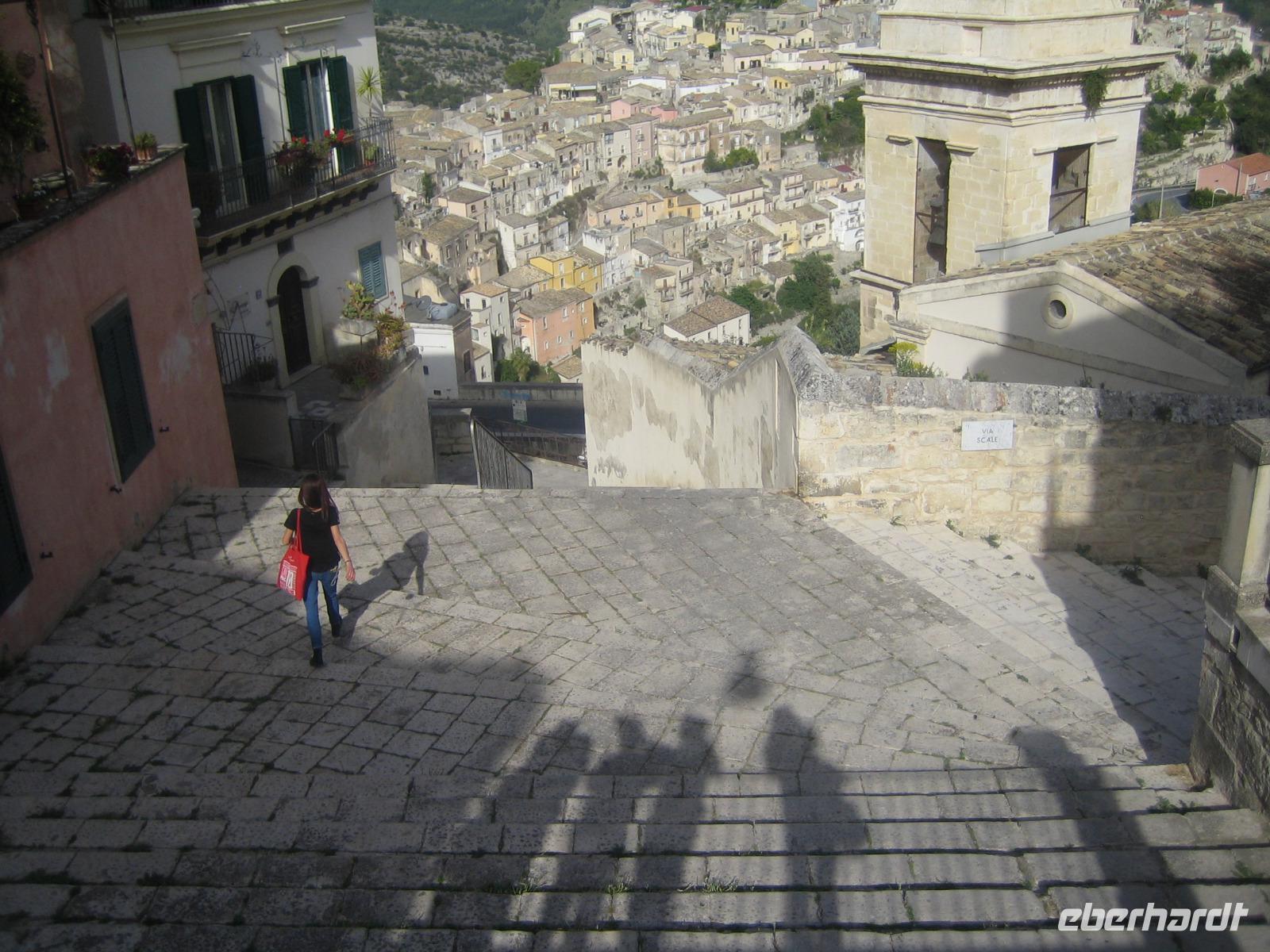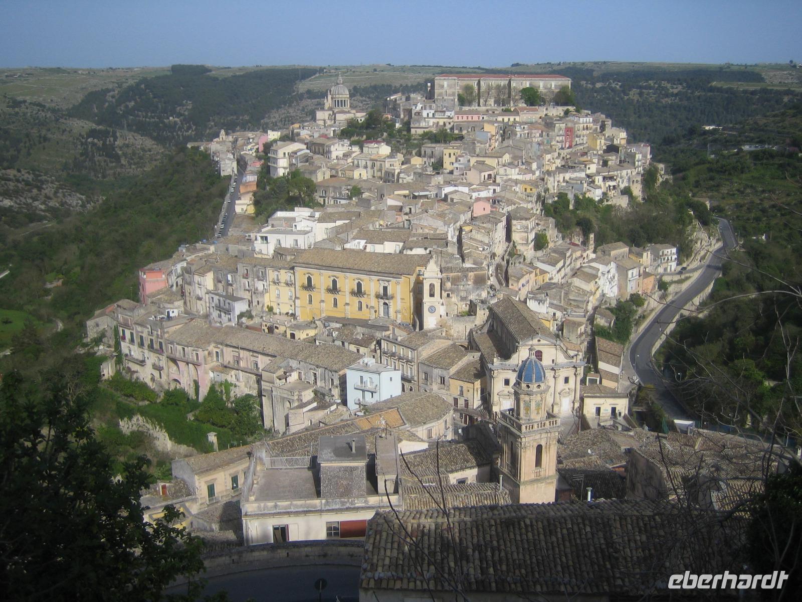 Heute erwartet uns das berühmte Valle dei Templi, das Tal der Tempel von Agrigent. Graziella, die uns hindurch führen wird, steigt unterwegs in unseren Reisebus. Wir starten unseren Rundgang am Heratempel, oben am höchsten Punkt des Tales, das eigentlich eine Hochebene ist. Entlang der alten Stadtmauer mit ihren byzantinischen Nekropolen gehen wir zum Concordia-Tempel, dem bedeutendsten Tempel im Tal. Unser Weg führt an Mandel- und Olivenplantagen vorbei, wir können nur erahnen, wie groß diese Stadt einst war, sehen die heutige Neustadt von Agrigent in der Ferne. Beim Herkules-Tempel stehen wir vor tief in die Steine geschnittenen Wagenspuren, auf denen die riesigen Steinblöcke zu den Tempelbaustellen transportiert wurden. Am Zeustempel erklärt uns Graziella die Figuren der Giganten. Sie kämpften gegen Zeus, verloren den Kampf und der Tempelbau zeigte sie als Steinmänner, die fortan das Dach des riesigen Tempels auf ihren Schultern tragen müssen. Wir verabschieden uns von Graziella, dann führt uns die Reise in die Küstenstadt Gela, wo wir nahe beim Sandstrand eine gemütliche Mittagspause einlegen. Am Nachmittag bereits erreichen wir Ragusa und können schon vorzeitig in unserem Hotel Mediterraneo Palace einchecken. Das ist klasse, denn so haben wir den ganzen Nachmittag bis zum Abendessen Zeit, uns die interessante Stadt anzusehen. Sie besteht aus zwei Teilen, die durch Brücken und viele Treppen miteinander verbunden sind. Wie gehen zur Kathedrale und dann hinunter zum Aussichtpunkt auf Ragusa Ibla, dem älteren Teil der Stadt. Einige von uns haben auch sie erkundet und dabei tolle Eindrücke mitgenommen. Andere genossen es, durch die Einkaufsstraßen zu flanieren und bei einem Kaffee in der angenehmen Atmosphäre der Stadt zu verweilen.