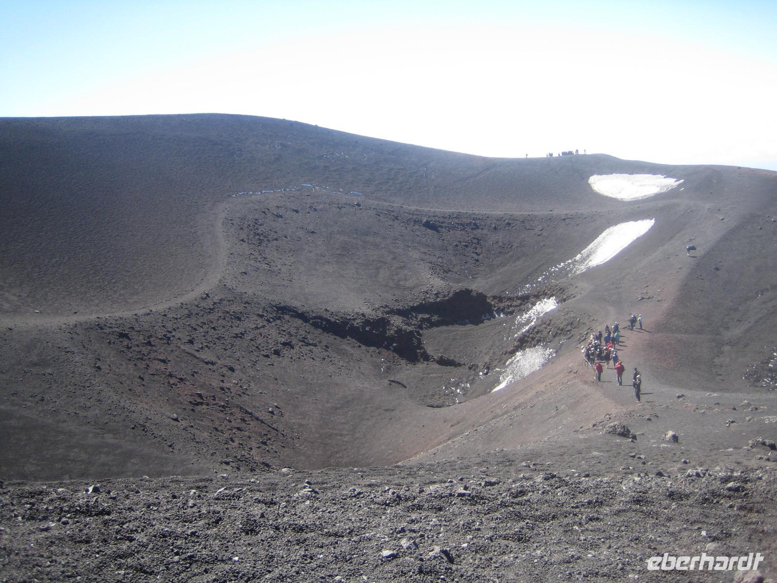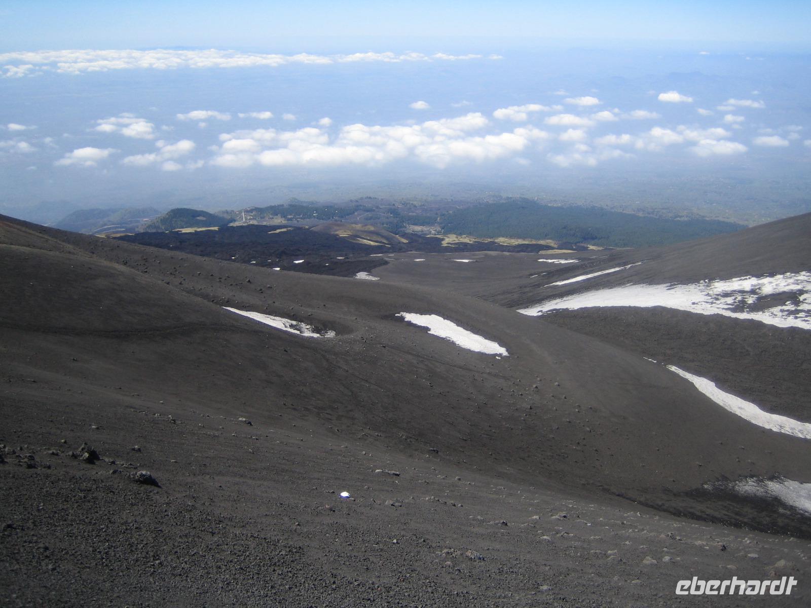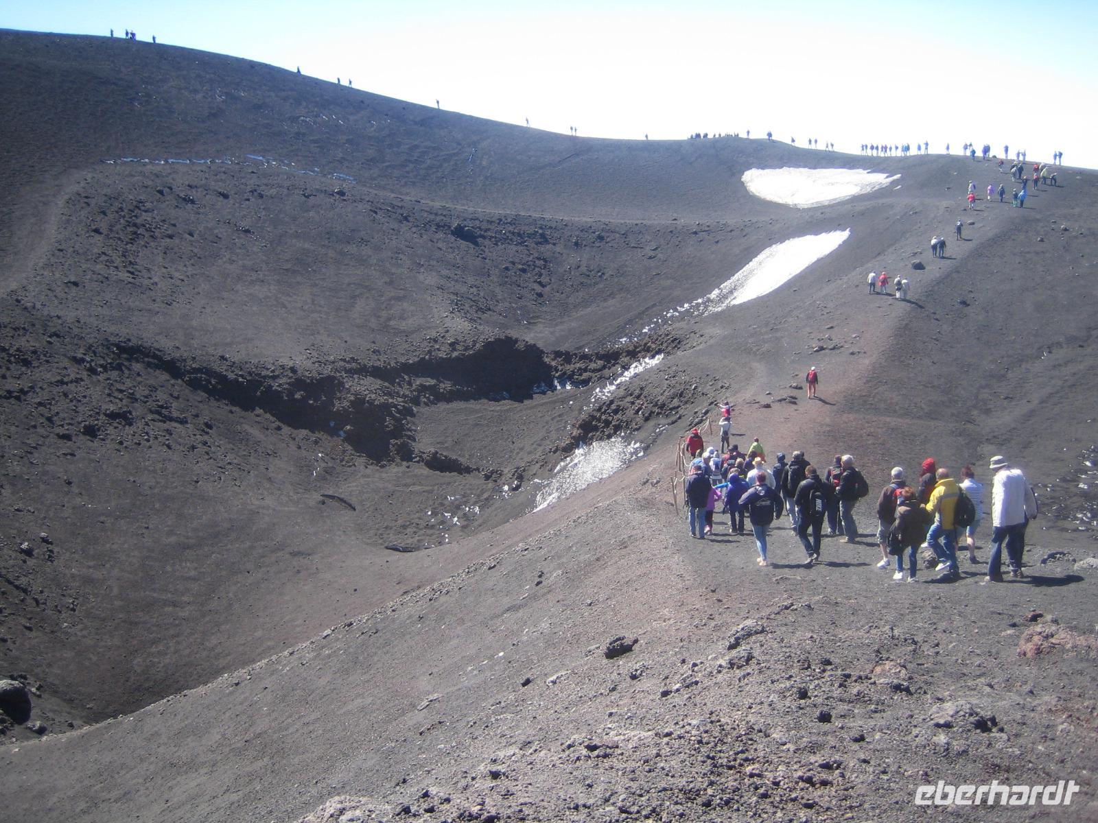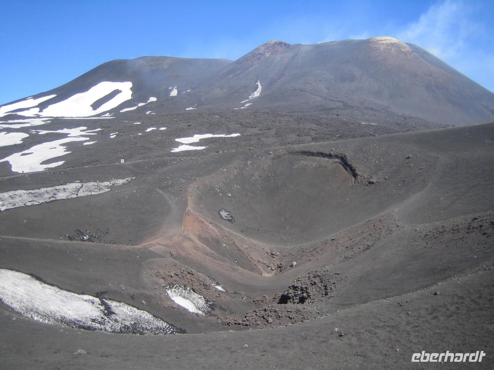 Am Morgen steigen wir in unseren Reisebus und fahren zum Ätna, zunächst zu den Silvestri-Kratern auf 2 000 Meter hinauf. Wir wechseln in die Seilbahn, die uns auf 2 500 Meter bringt. Von dort geht es mit dem Geländewagen weiter, zu den Kratern auf 3 000 Meter Höhe. Mit einem Bergführer besichtigen wir den Krater „Antonio Barbarello", der nach einem Vulkanologen benannt ist. Wir haben tolles Wetter und der Schnee, der noch kürzlich hier lag, ist verschwunden. Schwarze und rote Vulkansteine knirschen unter unseren Schuhen und wir können weit ins Land hinein sehen. Natürlich pfeift ein kräftiger Höhenwind, wie sollte das auf 3 000 Metern auch anders sein. Nach einer schönen Mittagspause, oben an der Seilbahnstation oder unten in den Cafeterias reisen wir nach Catania, der Stadt, in der wir vor fünf Tagen aus dem Flugzeug gestiegen waren. Inzwischen haben wir Sizilien fast ganz umrundet, haben interessante Menschen, wunderschöne Landschaften, uralte Tempel antiker Völker und prächtige sakrale Bauten kennen gelernt, vor allem die der Normannen, als deren Nachkomme Federico Duo geboren wurde. Jetzt haben wir die Gelegenheit, ein Gebäude zu sehen, das er selbst in der ersten Hälfte des 13. Jahrhunderts in Catania bauen ließ, das Castello Ursino. Es wurde zum Sitz des sizilianischen Parlamentes, das ihn 1295 zum König ernannte. Der Lavastrom vom Vulkanausbruch 1693 verschonte das Kastell und heute beherbergt es das Stadtmuseum und eine reiche Kunstsammlung. Wir haben ein wenig Zeit und schauen uns um in der Stadt Vincenso Bellinis, besichtigen die Kathedrale Santa Agatha oder schlendern über die Via Etnea, an deren Ende der Ätna sich über die Dächer Catanias erhebt. Auf unserem Rückweg zum Hotel fahren wir an seiner Ostseite entlang. Dunkle Rauchfahnen steigen jetzt auf, und dort oben waren wir heute Vormittag!