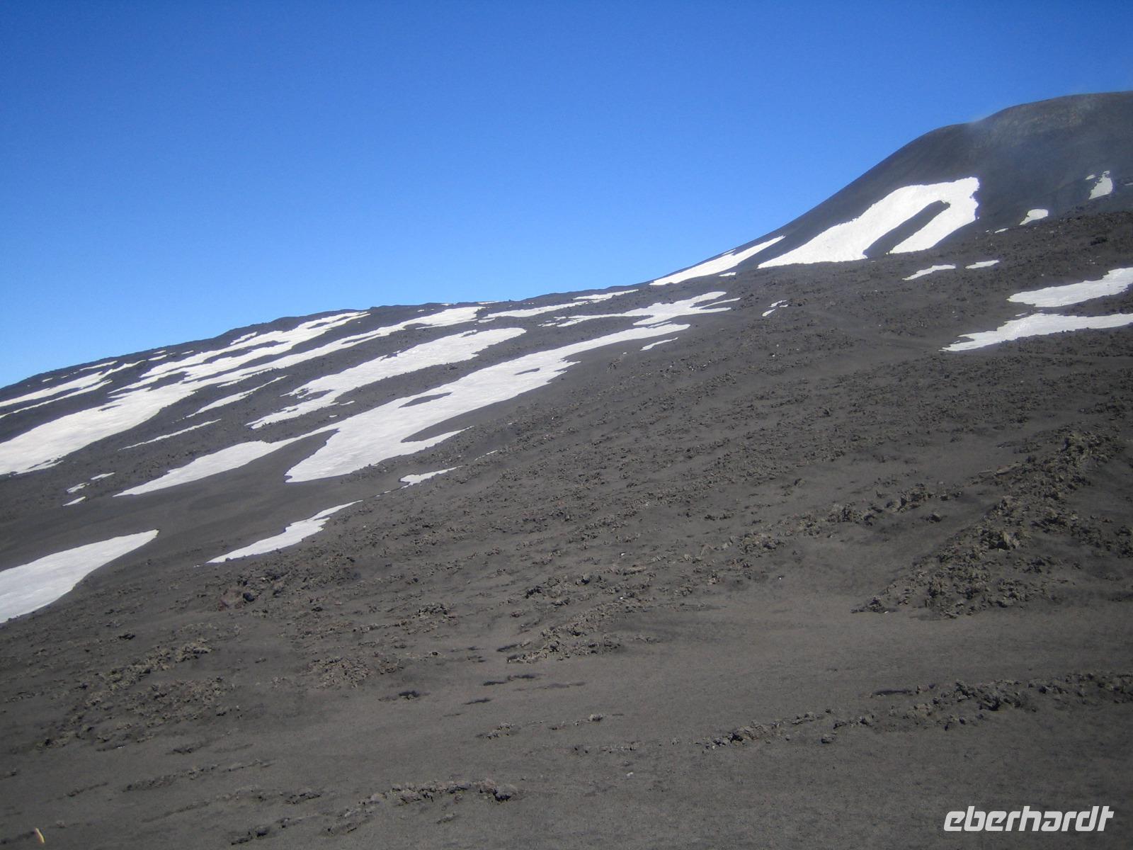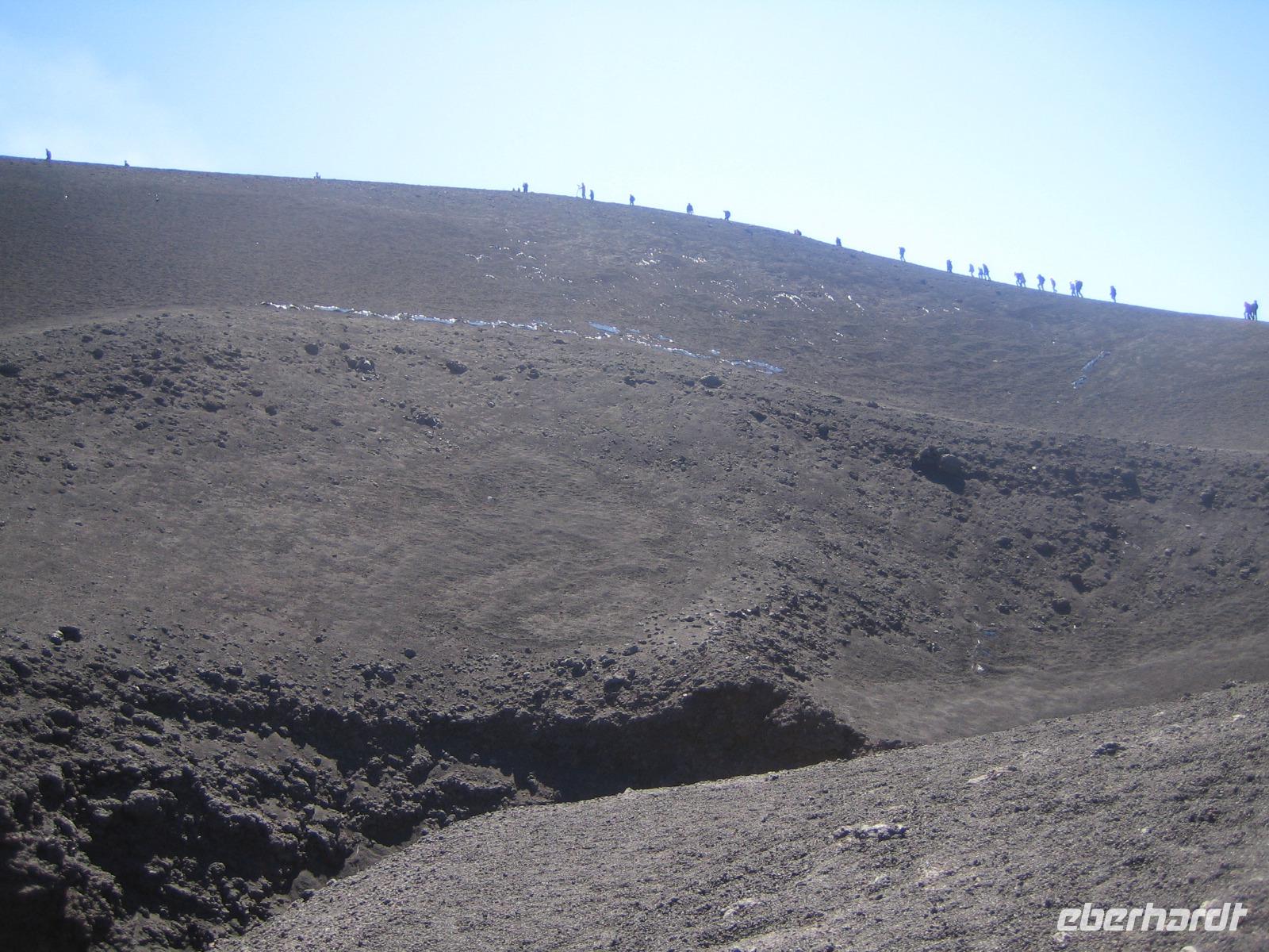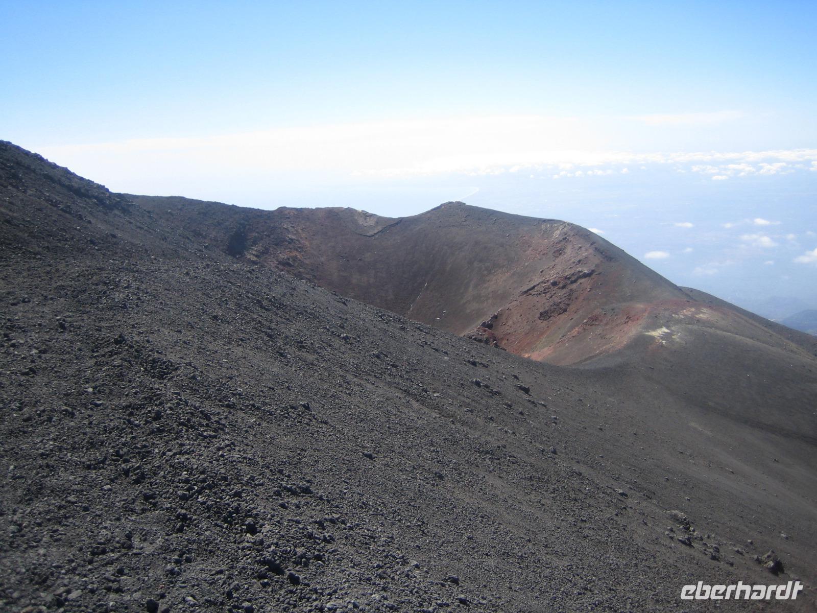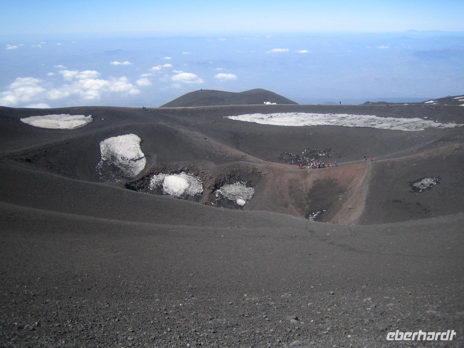 Am Morgen steigen wir in unseren Reisebus und fahren zum Ätna, zunächst zu den Silvestri-Kratern auf 2 000 Meter hinauf. Wir wechseln in die Seilbahn, die uns auf 2 500 Meter bringt. Von dort geht es mit dem Geländewagen weiter, zu den Kratern auf 3 000 Meter Höhe. Mit einem Bergführer besichtigen wir den Krater „Antonio Barbarello", der nach einem Vulkanologen benannt ist. Wir haben tolles Wetter und der Schnee, der noch kürzlich hier lag, ist verschwunden. Schwarze und rote Vulkansteine knirschen unter unseren Schuhen und wir können weit ins Land hinein sehen. Natürlich pfeift ein kräftiger Höhenwind, wie sollte das auf 3 000 Metern auch anders sein. Nach einer schönen Mittagspause, oben an der Seilbahnstation oder unten in den Cafeterias reisen wir nach Catania, der Stadt, in der wir vor fünf Tagen aus dem Flugzeug gestiegen waren. Inzwischen haben wir Sizilien fast ganz umrundet, haben interessante Menschen, wunderschöne Landschaften, uralte Tempel antiker Völker und prächtige sakrale Bauten kennen gelernt, vor allem die der Normannen, als deren Nachkomme Federico Duo geboren wurde. Jetzt haben wir die Gelegenheit, ein Gebäude zu sehen, das er selbst in der ersten Hälfte des 13. Jahrhunderts in Catania bauen ließ, das Castello Ursino. Es wurde zum Sitz des sizilianischen Parlamentes, das ihn 1295 zum König ernannte. Der Lavastrom vom Vulkanausbruch 1693 verschonte das Kastell und heute beherbergt es das Stadtmuseum und eine reiche Kunstsammlung. Wir haben ein wenig Zeit und schauen uns um in der Stadt Vincenso Bellinis, besichtigen die Kathedrale Santa Agatha oder schlendern über die Via Etnea, an deren Ende der Ätna sich über die Dächer Catanias erhebt. Auf unserem Rückweg zum Hotel fahren wir an seiner Ostseite entlang. Dunkle Rauchfahnen steigen jetzt auf, und dort oben waren wir heute Vormittag!