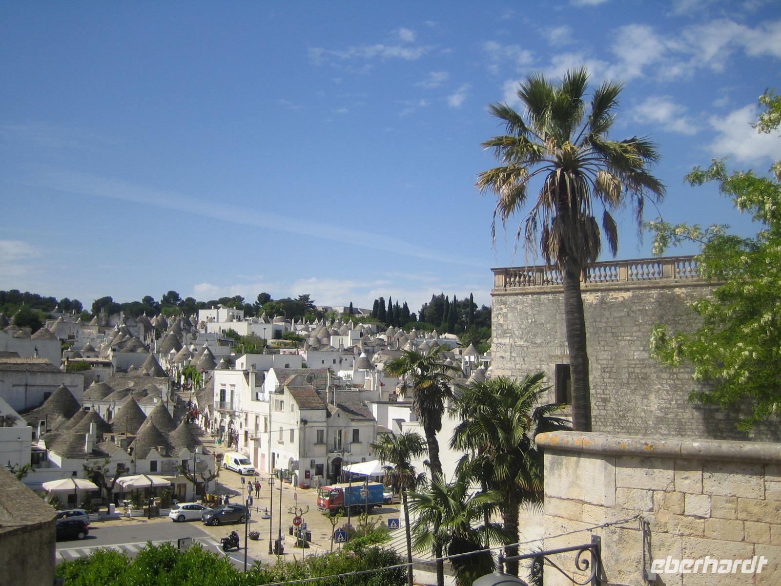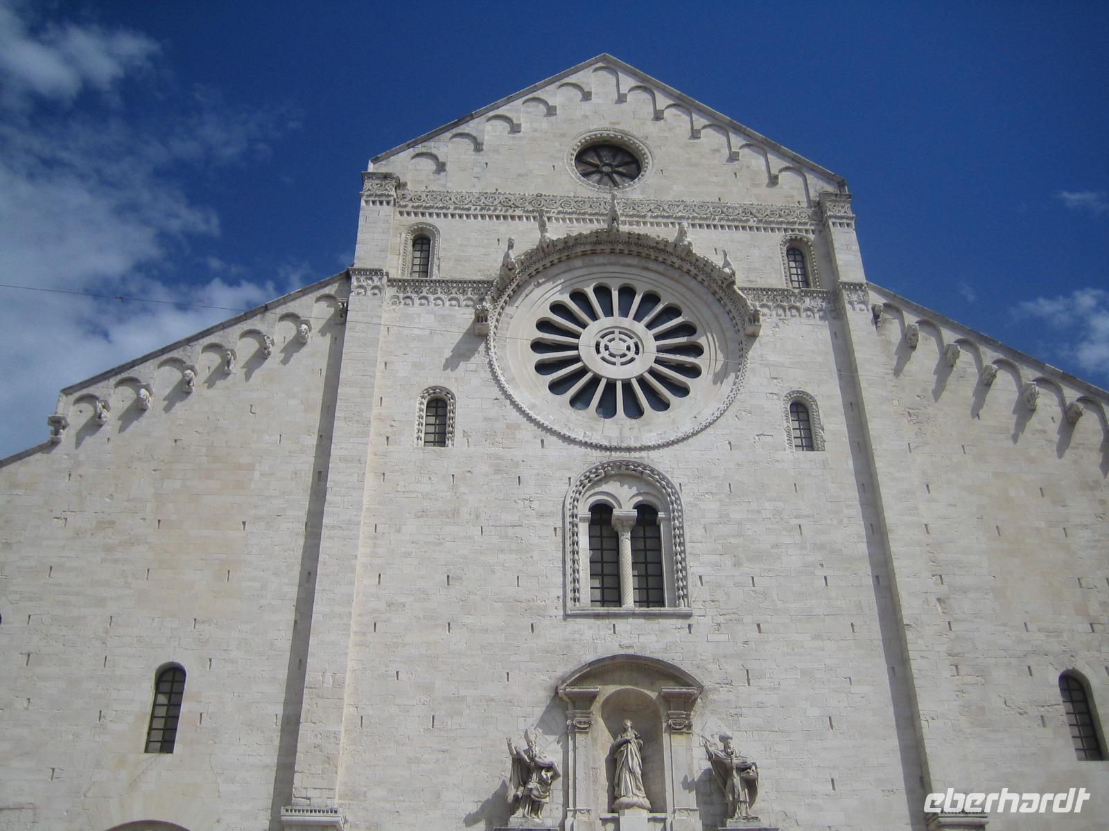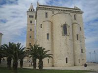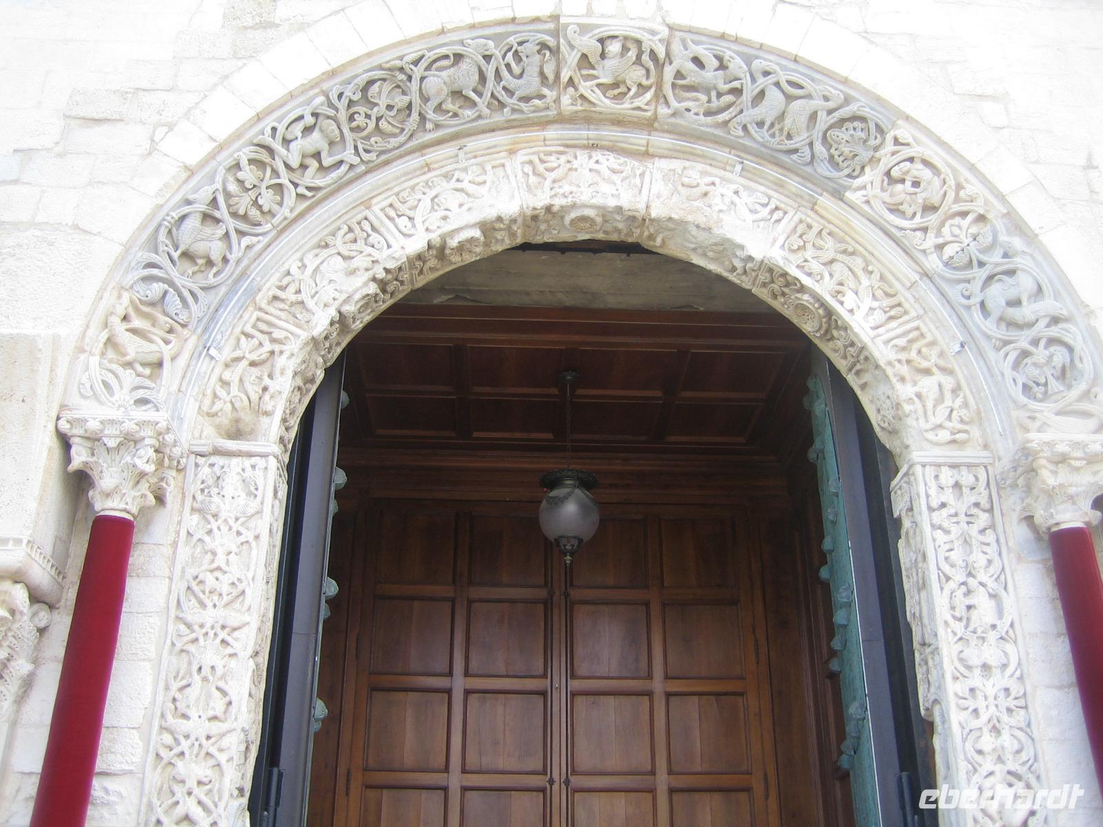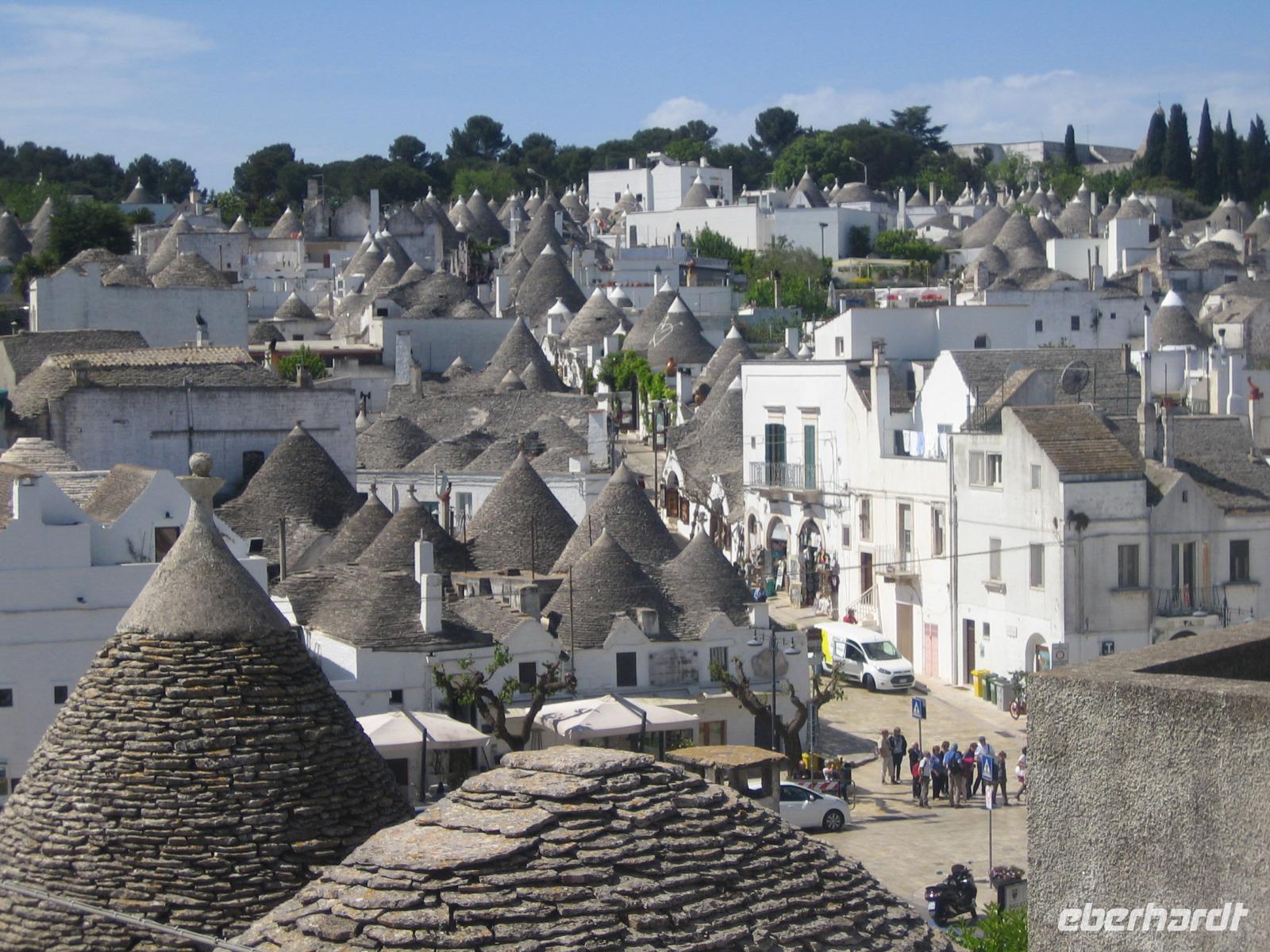 Ein Ort mit ganz besonderen Häusern ist Alberobello, unser nächstes Ziel. Die heute seltene Bauweise kündigt sich schon in den Feldern vor der Stadt an. Die vereinzelt im Land auftauchenden kleinen Häuser sind rund gebaut und haben spitze Dächer aus unverputzten flachen Steinen. Es ist eine uralte Bauweise von Hirtenvölkern, die es an vielen Orten gab. Wieso aber besteht noch heute eine ganze Stadt aus ihnen, den Trulli? Die Lösung ist so überraschend wie alltäglich: Ein Fürst wollte Steuern für Baugenehmigungen sparen und befahl seinen Untergebenen, die Häuser so zu bauen, dass man ihre Dächer sofort zerstören konnte, wenn die Steueraufsicht nahte. Ihre Einwohner kämpften lange dafür, als bewohnte Stadt anerkannt zu werden und als es ihnen endlich gelang, war die Neuzeit erreicht. Die Trullistadt blieb, wie sie war, aber sie durfte nun nicht mehr zerstört werden. Marilena, die uns die nächsten zwei Tage Apulien zeigen wird, nimmt uns vor den Toren der Neustadt in Empfang. Mit ihr gehen wir durch die Stadt, kommen durch schmale Gassen zu einem Trullo, das wir auch von Innen besichtigen dürfen. Vom Aussichtspunkt am Hauptplatz wandern wir hinauf bis zur Kirche, die ebenfalls im Trullo-Stil gebaut ist. Wir besichtigen auch sie, dann fahren wir weiter nach Bari, der Hauptstadt Apuliens. An der Piazza Ferrarese starten wir unsern Stadtrundgang, über die Piazza Mercantile zur Basilika des heiligen Nicolaus. Sie ist noch immer eine Wallfahrtskirche, bewahrt in ihrer Schatzkammer der Geschenke der Pilger und unterm Altar die Gebeine des heiligen Nicolaus. Im normannischen, byzantinischen und korinthischen Stil erbaut gilt sie als Prototyp der romanischen Architektur, hat wundervolle Elefantenfenster und ein Löwenportal. Von dort gehen wir zum Stauferkastell, in dem auch Franz von Assisi bei Federico Duo zu Gast war. Am Parlament und dem Finanzpalast vorbei gelangen wir wieder zum Reisebus und fahren zum Hotel Riva del Sole in Giovinazzo. Für das Abendessen treffen wir uns heute in einem tollen Terrassenspeisesaal, direkt am Ufer der Adria.