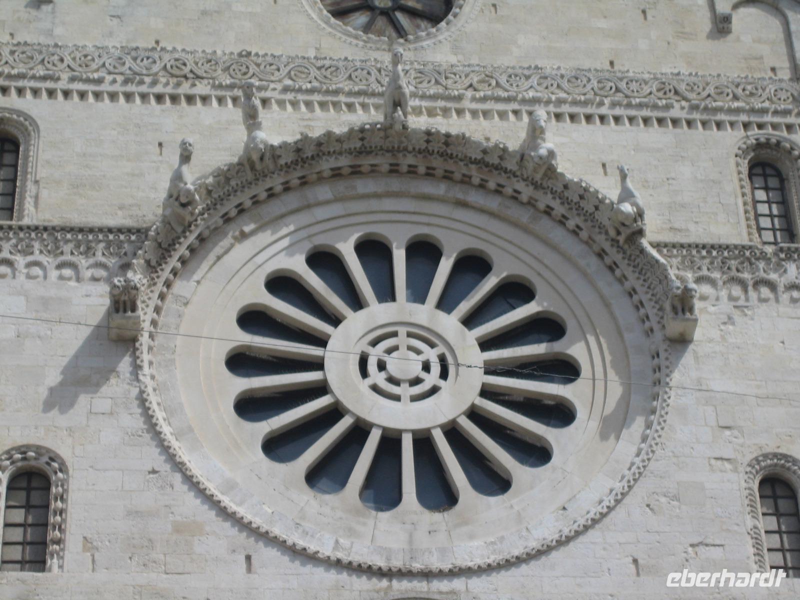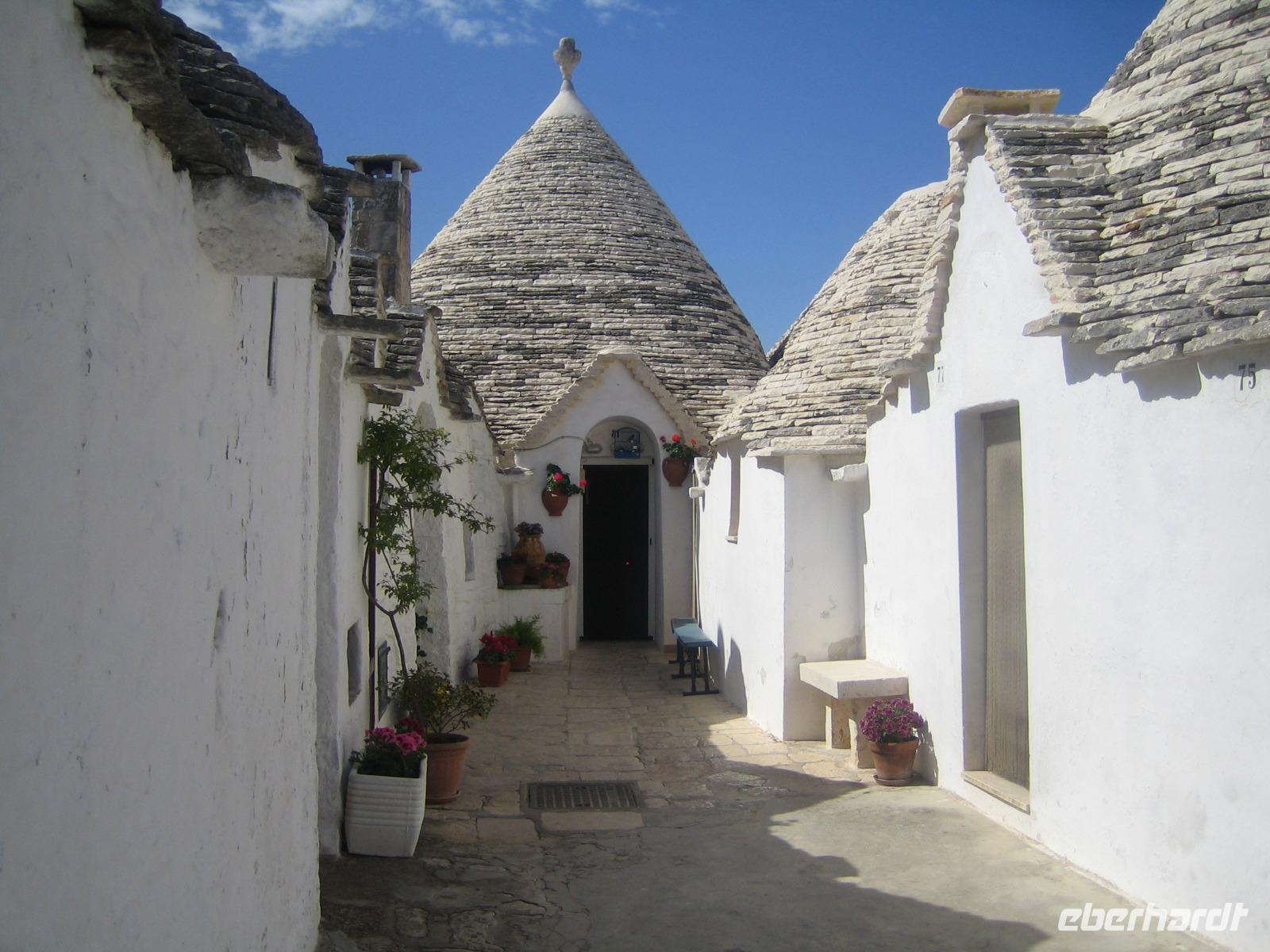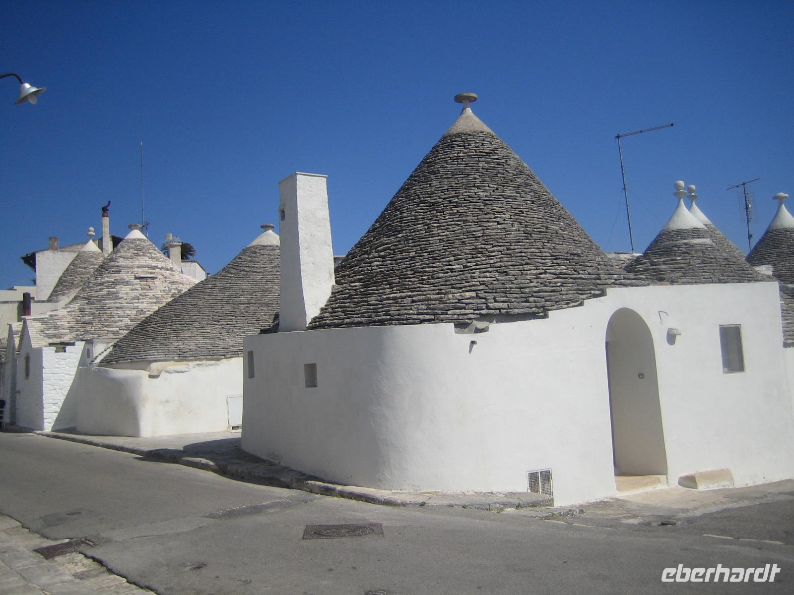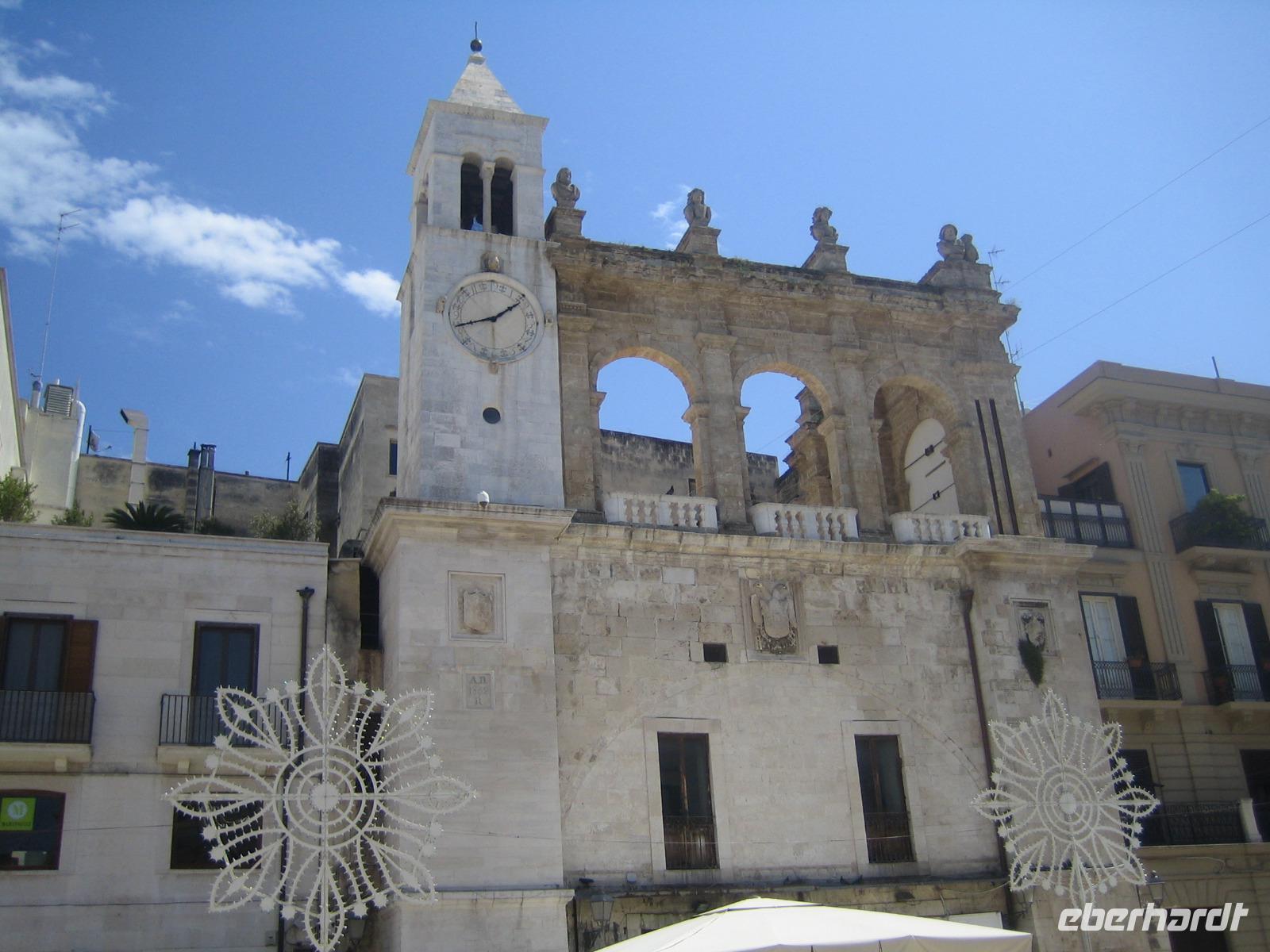 Ein Ort mit ganz besonderen Häusern ist Alberobello, unser nächstes Ziel. Die heute seltene Bauweise kündigt sich schon in den Feldern vor der Stadt an. Die vereinzelt im Land auftauchenden kleinen Häuser sind rund gebaut und haben spitze Dächer aus unverputzten flachen Steinen. Es ist eine uralte Bauweise von Hirtenvölkern, die es an vielen Orten gab. Wieso aber besteht noch heute eine ganze Stadt aus ihnen, den Trulli? Die Lösung ist so überraschend wie alltäglich: Ein Fürst wollte Steuern für Baugenehmigungen sparen und befahl seinen Untergebenen, die Häuser so zu bauen, dass man ihre Dächer sofort zerstören konnte, wenn die Steueraufsicht nahte. Ihre Einwohner kämpften lange dafür, als bewohnte Stadt anerkannt zu werden und als es ihnen endlich gelang, war die Neuzeit erreicht. Die Trullistadt blieb, wie sie war, aber sie durfte nun nicht mehr zerstört werden. Marilena, die uns die nächsten zwei Tage Apulien zeigen wird, nimmt uns vor den Toren der Neustadt in Empfang. Mit ihr gehen wir durch die Stadt, kommen durch schmale Gassen zu einem Trullo, das wir auch von Innen besichtigen dürfen. Vom Aussichtspunkt am Hauptplatz wandern wir hinauf bis zur Kirche, die ebenfalls im Trullo-Stil gebaut ist. Wir besichtigen auch sie, dann fahren wir weiter nach Bari, der Hauptstadt Apuliens. An der Piazza Ferrarese starten wir unsern Stadtrundgang, über die Piazza Mercantile zur Basilika des heiligen Nicolaus. Sie ist noch immer eine Wallfahrtskirche, bewahrt in ihrer Schatzkammer der Geschenke der Pilger und unterm Altar die Gebeine des heiligen Nicolaus. Im normannischen, byzantinischen und korinthischen Stil erbaut gilt sie als Prototyp der romanischen Architektur, hat wundervolle Elefantenfenster und ein Löwenportal. Von dort gehen wir zum Stauferkastell, in dem auch Franz von Assisi bei Federico Duo zu Gast war. Am Parlament und dem Finanzpalast vorbei gelangen wir wieder zum Reisebus und fahren zum Hotel Riva del Sole in Giovinazzo. Für das Abendessen treffen wir uns heute in einem tollen Terrassenspeisesaal, direkt am Ufer der Adria.