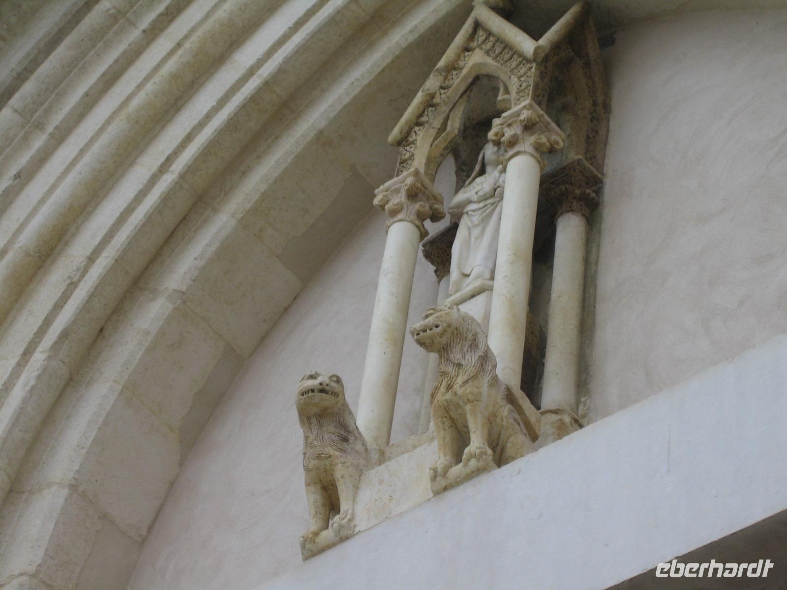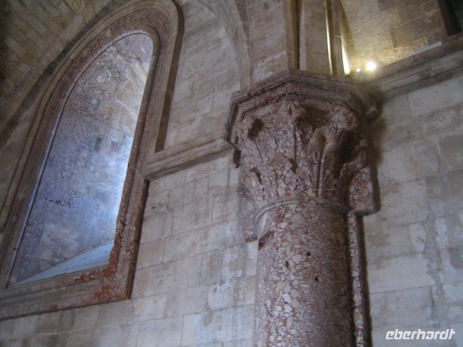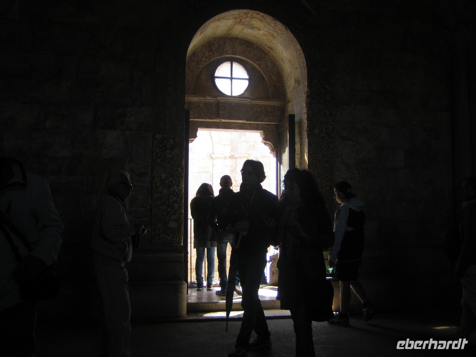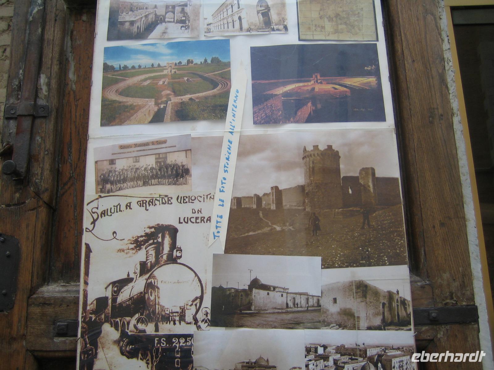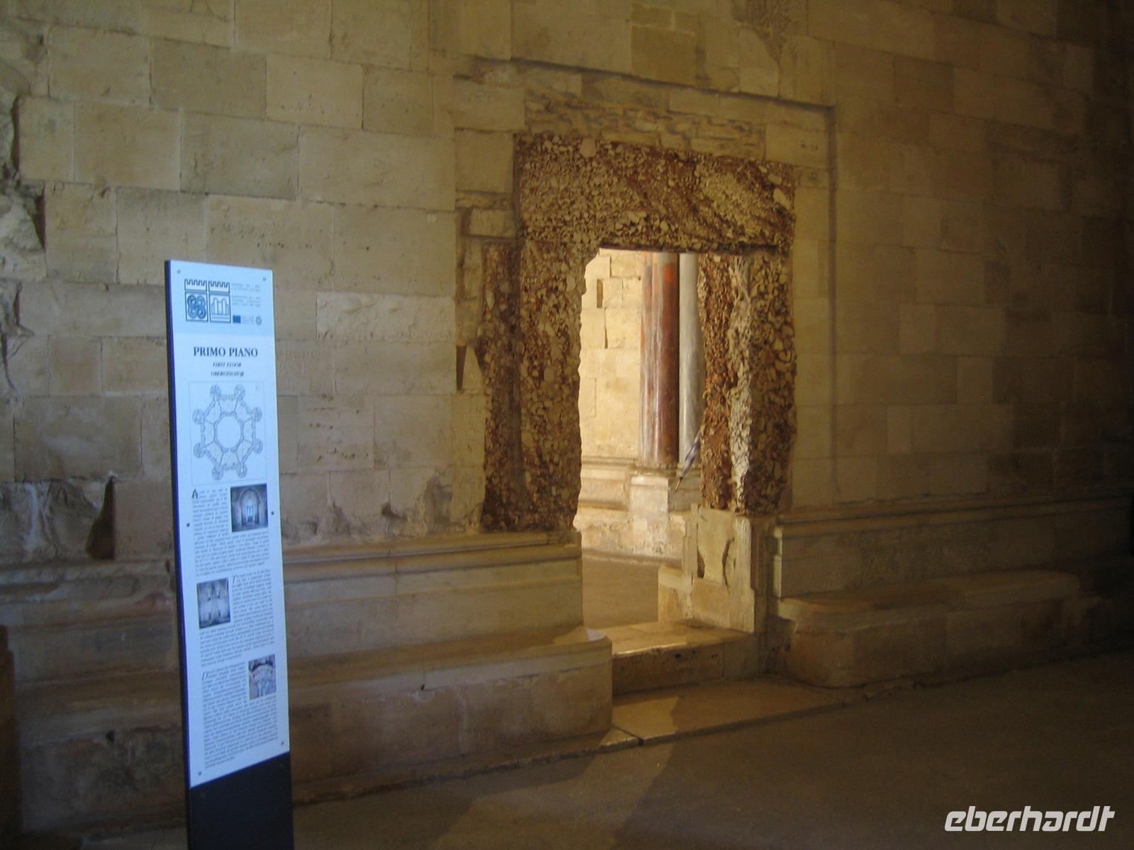 Die Hafenstadt Trani birgt einen ganz besonderen Schatz - die Meereskathedrale. Sie erhebt sich auf einer frühchristlichen Kirche aus dem 7. Jahrhundert, die inzwischen anderthalb Meter unter den Meeresspiegel abgesunken ist. Über diese Kirche baute man im 9. Jahrhundert die Maria de la Scala Kirche, die heute die Krypta der wiederum darüber gebauten Kathedrale Nicola de Pelegrino ist. Dorthin gehen wir zusammen mit Marilena durch den großen Hafen der Stadt. Nach unserer Besichtigung führt uns Marilena zum Stauferkastell, das Federico Duo im Jahr 1242 erbauen ließ. Hier erfahren wir so viel über den Stauferkönig, dass sich die Details unserer bisherigen Reise wie in einem facettenreichen Mosaik zusammenfügen. Palermo rückt noch einmal ins Gedächtnis, denn es war die Stadt, in der Friedrich aufwuchs und wo seine Freundschaft mit muslimischen Menschen begann. Später wurde er vom Papst hart bekämpft, weil er durch diplomatische Verhandlungen mit einem Scheich die heilige Stadt Jerusalem kampflos erhielt. Die Kirche aber wollte die Andersgläubigen niedergemetzelt sehen. Statt sich auf einen Kreuzzug zu begeben, gründete Federico jedoch Universitäten in seinem Königreich und bildete dort seine Beamten aus. Er wurde exkommuniziert und gebannt, doch er hielt um so beharrlicher an seinem Ziel fest, Gutes für die Menschheit zu tun, wie er selbst es sagte. Von Trani fahren wir zum Castell del Monte, der steinernen Krone Apuliens. Bis heute weiß man nicht, als was Friedrich dieses besondere Gebäude hat bauen lassen. Für ein Empfangsschloss ist es zu weit entfernt von Foggia, der Stadt, die er zu seiner Residenzstadt machte. Eine Festung ist es auch nicht, denn es fehlen die Schießscharten und der Wassergaben. War es ein Jagdschloss, in das sich Federico mit seinen engsten Freunden zurückzog? Wie auch immer. Wir besichtigen das spannende Gebäude mit seinen Portalen aus rotem Korallenschotter. Marilena erklärt uns das Kastell so anschaulich, dass wir ihr nur zustimmen können: hier ist die Anwesenheit des Staufers noch heute am meisten zu spüren. Dann sagen wir unserer tollen Stadt- und Burgführerin Adieu und fahren zu unserem nächsten Domizil, dem Hotel Palace Lucera.