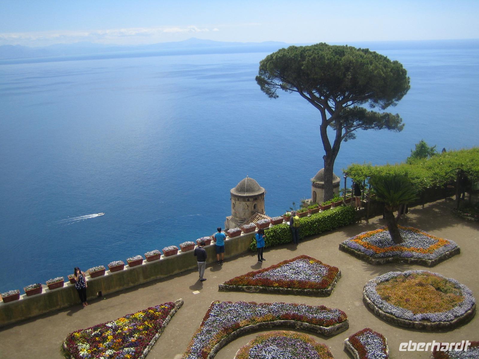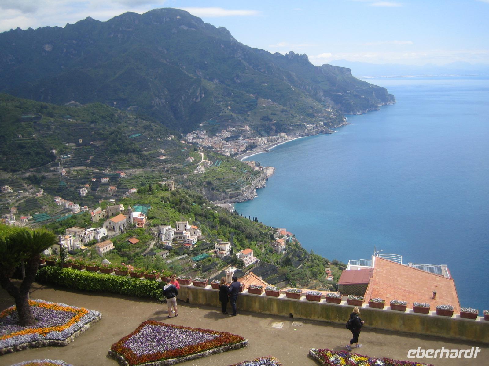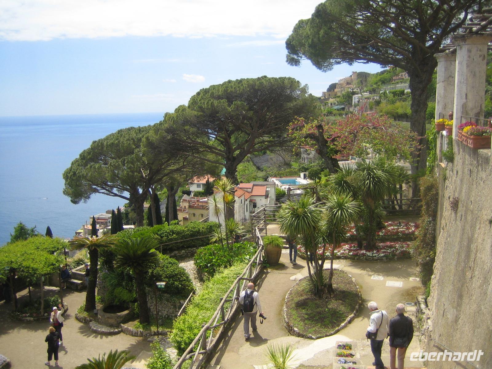 Früher führten alle Wege auf Schusters Rappen, auf Eselsrücken oder in kleinen Booten zu den malerischen Orten der Amalfiküste. Die Sirenen, deren drei Inseln im Golf von Salerno liegen, lebten in einsamer Ruhe und hatten viel Muse für ihre betörenden Gesänge, in denen die Schiffe der Helden versanken. Dann baute man die 52 Kilometer lange Küstenstraße, sie beginnt gleich hinter Sorrento und reicht bis nach Salerno. Heute knattert dichter Autoverkehr die steilen Ufer entlang, schlängelt sich in Serpentinen von Stadt zu Stadt. Mit unserer charmanten örtlichen Reiseleiterin Esther fahren wir durch Positano, vorbei an Sarazenenwachtürmen, die zum Schutz vor Piraten gebaut worden sind, und erreichen nach dem Fjord von Furore und der Smaraggrotte den Ort Amalfi. Hier wurde die erste Seerepublik im östlichen Mittelmeer gegründet. Wir nehmen uns Zeit und besichtigen die Stadt mit ihrer Kathedrale, die weit oben thront. Mittags fahren wir nach Ravello hinauf. Das Städtchen liegt 400 Meter weiter oben als die anderen Orte an der Amalfiküste und war somit unsichtbar für die gierigen Blicke der Seeräuber. So traute man sich, hier prächtige Villen zu bauen. Eines der Anwesen besuchen wir, die Villa Rufolo, in der einst Richard Wagner wandelte. Dabei erblickte er jene Blumenmädchen, die in „Klingsors Garten" die Aufgabe erhielten, Parzival von seiner Suche nach dem Gral abzulenken. Daher werden seit vielen Jahren in Ravello Wagnerfestspiele veranstaltet. Von den Sirenen jedoch hat man lange nichts mehr gehört. Vielleicht modernisieren sie sich derzeit unterseeisch zu neuen Gesängen oder sitzen unbemerkt in den Küstenstädten der Amalfitana, um die Menschen von Heute und ihre neuen Legenden zu studieren.