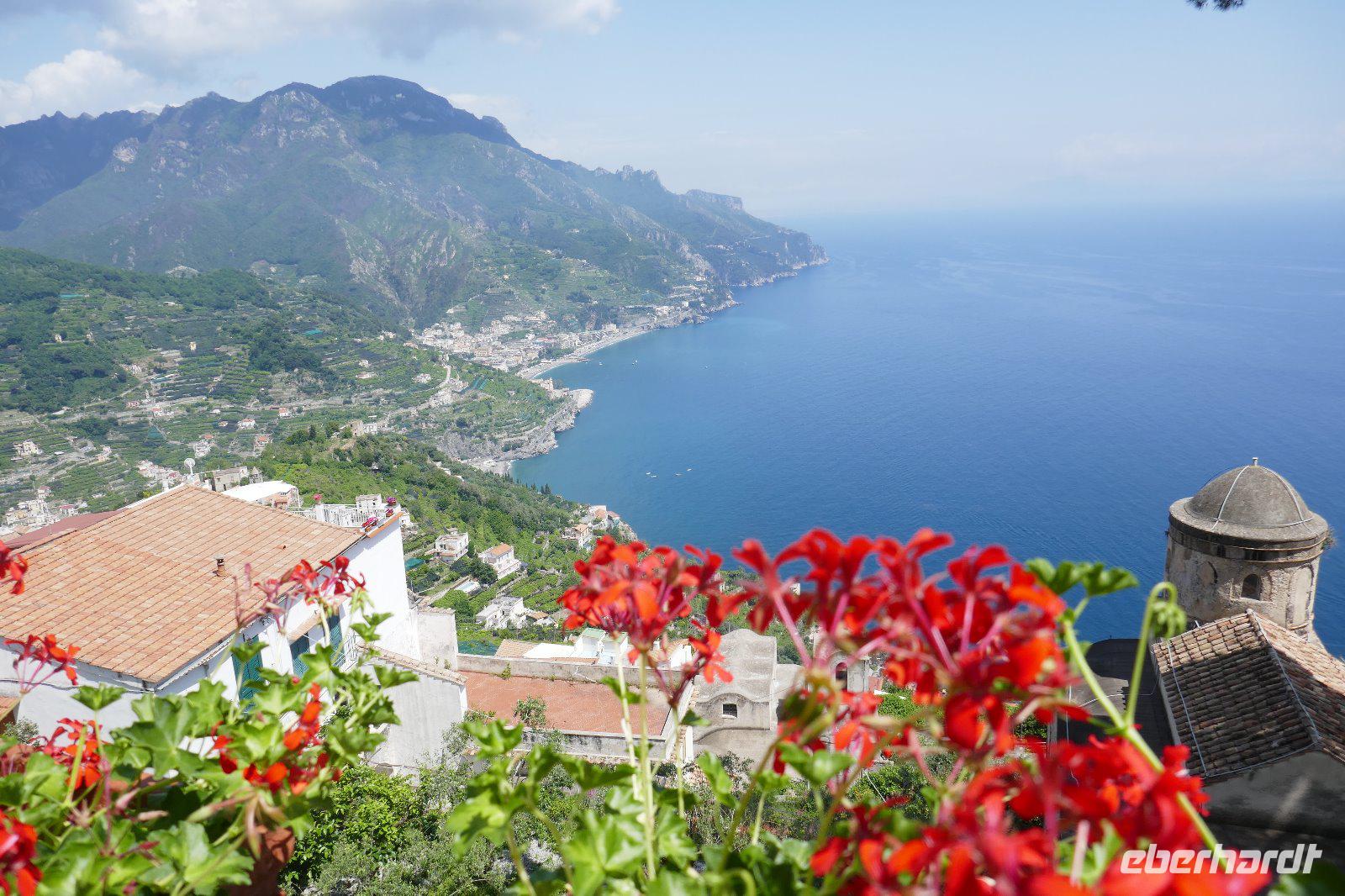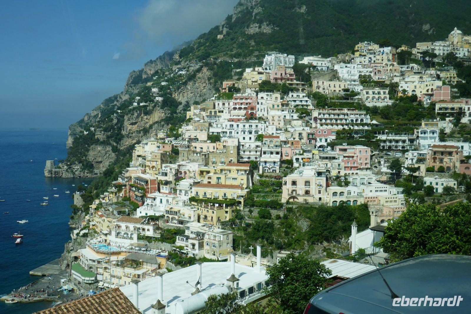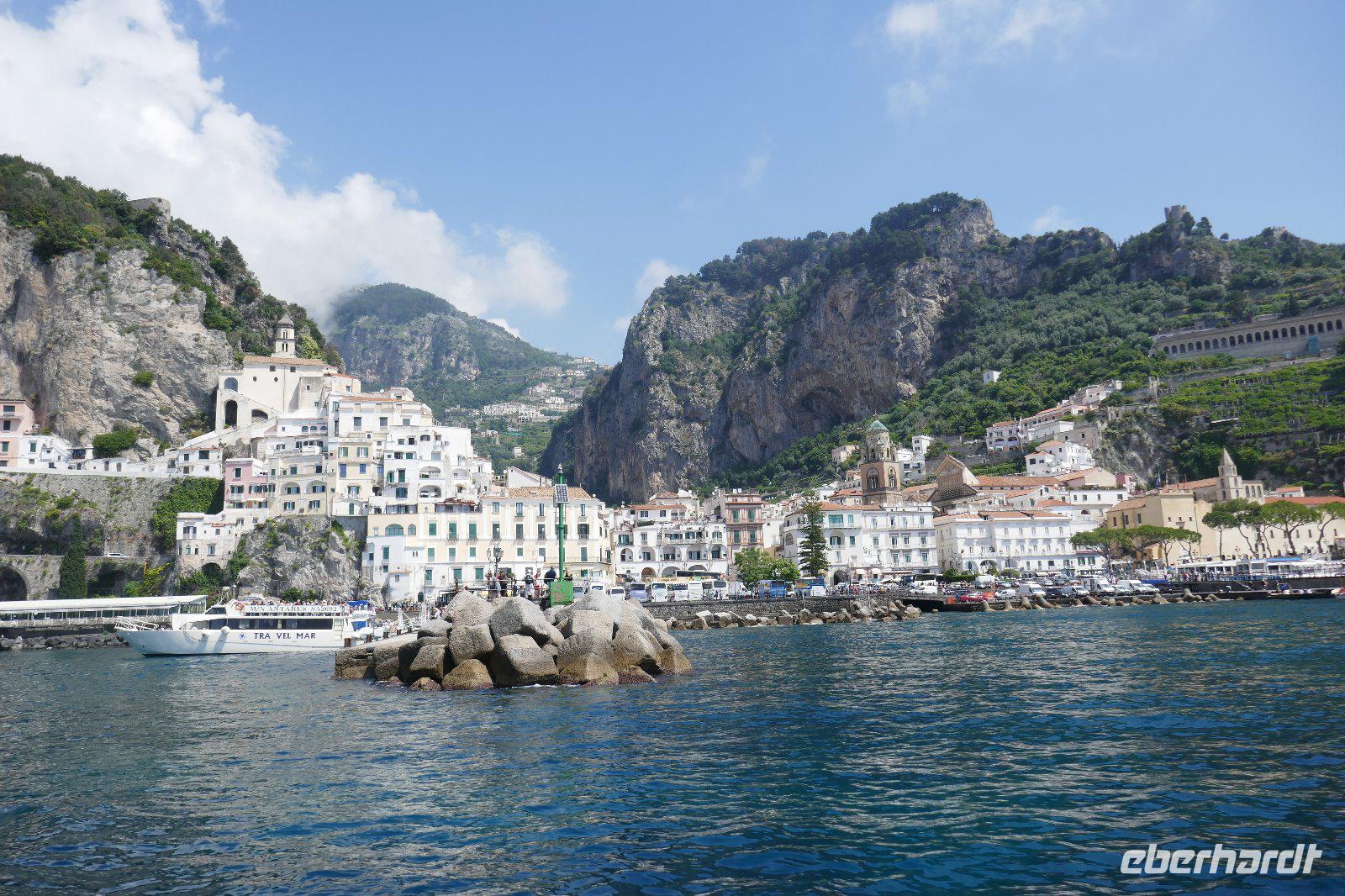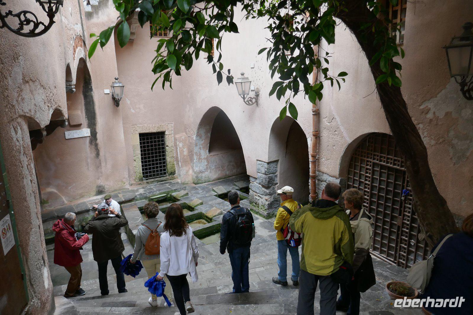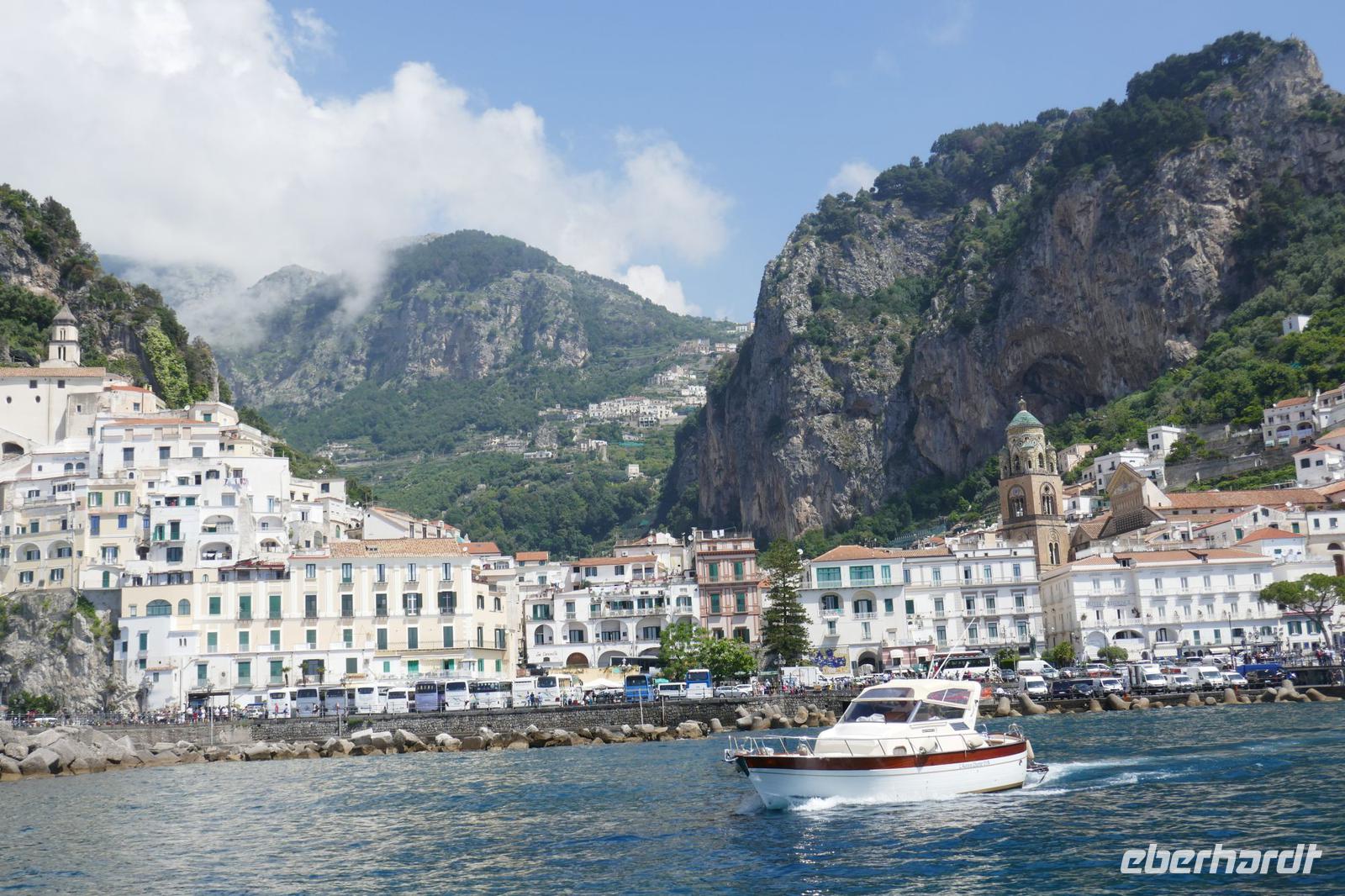 Die Amalfiküste, der Ort wo die Zitronen blühen, sei die schönste Küste der Welt. Unsere Gruppe wollte sich heute selbst ein Bild davon machen. Senkrecht aufragende Felswände am glitzernden Tyrrhenischen Meer. So stellte sich uns dieser Ort vor. Man hatte das Gefühl zwischen Himmel und dem Abgrund zu sein. Hier wurde in abenteuerlicher Weise eine der schönsten Küstenstraßen gebaut. An jeder Ecke ein interessantes Fotomotiv. Und einige der schönsten Dörfer Italiens scheinen fast wie an den Felsabhängen zu kleben. In der Nähe von Positano war unser erster Stopp. Schon John Steinbeck nannte ihn „der einzige senkrechte Ort der Welt". Alle steilen Gassen laufen auf den kleinen Strand zu. Kurve für Kurve, Serpentine für Serpentine steuerten wir unser nächstes Ziel Amalfi an. Nun wird dem letzten Bewusst, warum man hier nur mit einem einheimischen Busfahrer unterwegs sein kann. Geübt und mit der nötigen Gelassenheit umfährt er jede noch so kleine „Klippe". Ob Tourist mit Wagen oder der sonstige Gegenverkehr ist für unseren italienischen Fahrer kein Problem. Im Gegensatz zu Positano bietet Amalfi einen majestätischen Dom. Mit seiner pittoresk-bunten Fassade - ein kunstgeschichtliches Highlight - manifestiert er die Seerepublik Amalfis aus dem 11. Jahrhundert. Doch vorher erlebten wir die atemberaubende Küste wie sie die Seefahrer vom Wasser aus erleben. So manche Villa prominenter Persönlichkeiten konnte vom Boot aus ausgemacht werden. Am Ende hatte jeder auf seine Weise Gelegenheit diesen Ort zu entdecken. So mancher stellte auch fest, dass Schönheit seinen Preis hat. Über viele Kurven ging es übers Gebirge zum Ort Ravello. Ravello war berühmt für seine vielen Adelsfamilien, die dort lebten. So auch die Familie Rufolo, die im 12. Jh. auf einem Felsvorsprung die gleichnamige Villa errichten ließ. Im 19. Jh. wurde diese Villa durch einen Schotten zu neuem Leben erweckt. Wagner war hier im Garten und die Schönheit des Gartens und der Blick aufs Meer inspirierten ihn für das Bühnenbild 2. Akt des Parzivals (Klingsors Zaubergarten). Wer wollte konnte auf einem kleinen Rundgang diese besuchen oder den Ort genießen. Mit Bildern einer traumhaften Landschaft kehrten wir zum Hotel zurück.