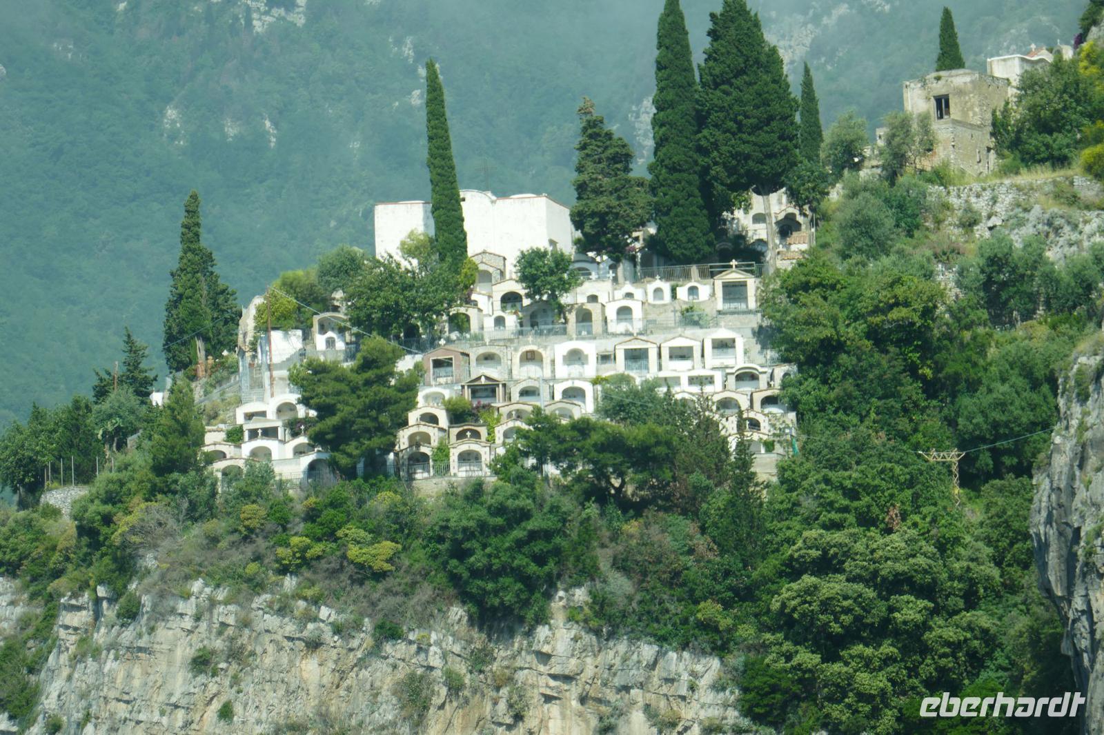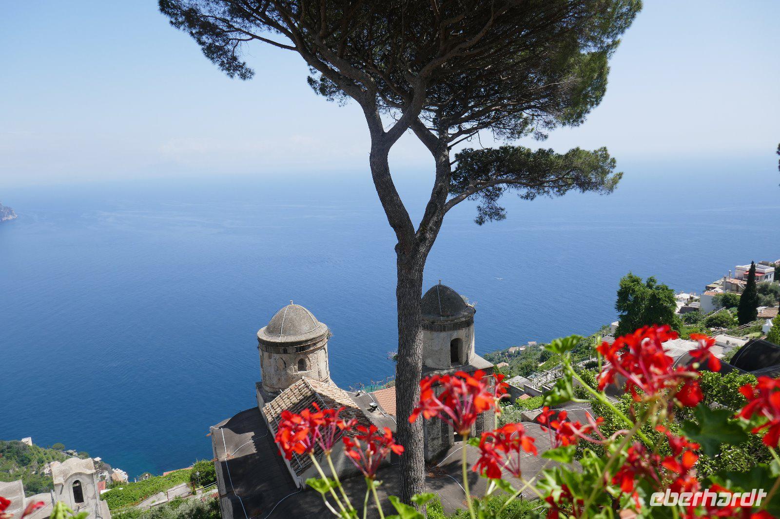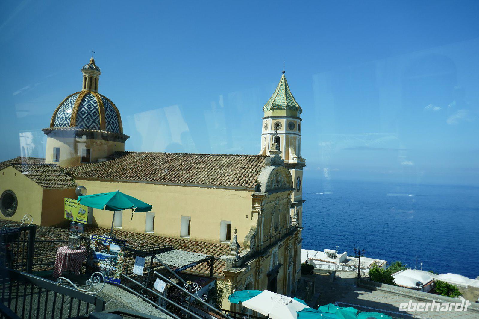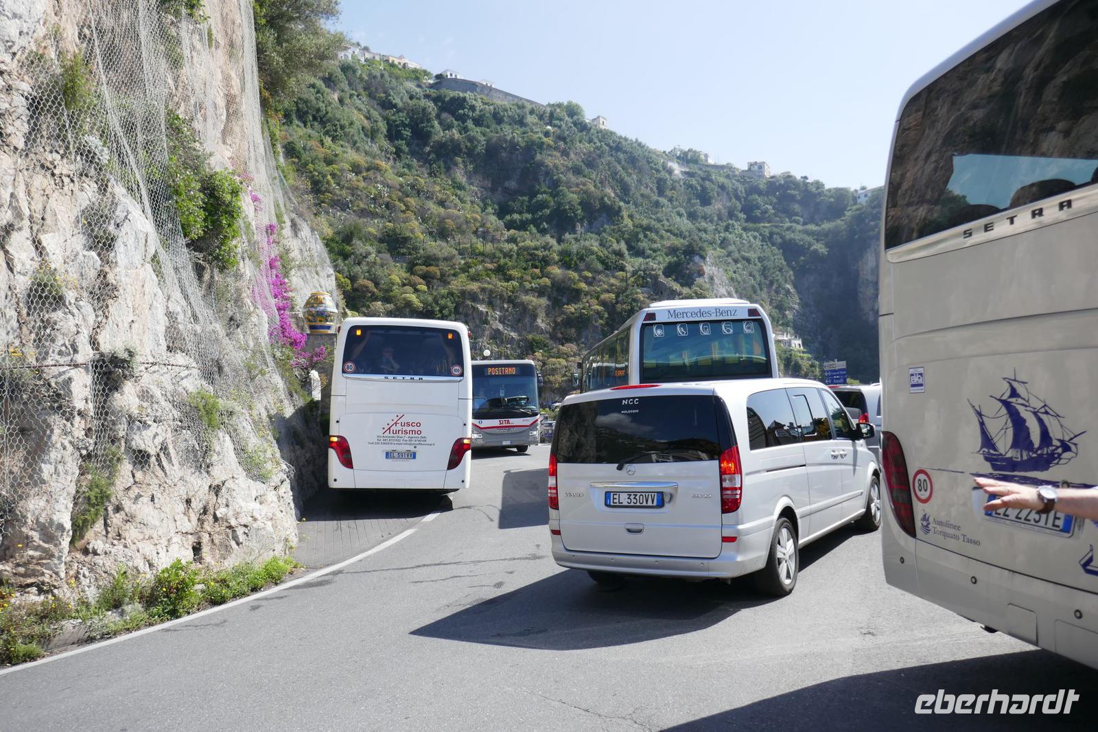 Die Amalfiküste, der Ort wo die Zitronen blühen, sei die schönste Küste der Welt. Unsere Gruppe wollte sich heute selbst ein Bild davon machen. Senkrecht aufragende Felswände am glitzernden Tyrrhenischen Meer. So stellte sich uns dieser Ort vor. Man hatte das Gefühl zwischen Himmel und dem Abgrund zu sein. Hier wurde in abenteuerlicher Weise eine der schönsten Küstenstraßen gebaut. An jeder Ecke ein interessantes Fotomotiv. Und einige der schönsten Dörfer Italiens scheinen fast wie an den Felsabhängen zu kleben. In der Nähe von Positano war unser erster Stopp. Schon John Steinbeck nannte ihn „der einzige senkrechte Ort der Welt". Alle steilen Gassen laufen auf den kleinen Strand zu. Kurve für Kurve, Serpentine für Serpentine steuerten wir unser nächstes Ziel Amalfi an. Nun wird dem letzten Bewusst, warum man hier nur mit einem einheimischen Busfahrer unterwegs sein kann. Geübt und mit der nötigen Gelassenheit umfährt er jede noch so kleine „Klippe". Ob Tourist mit Wagen oder der sonstige Gegenverkehr ist für unseren italienischen Fahrer kein Problem. Im Gegensatz zu Positano bietet Amalfi einen majestätischen Dom. Mit seiner pittoresk-bunten Fassade - ein kunstgeschichtliches Highlight - manifestiert er die Seerepublik Amalfis aus dem 11. Jahrhundert. Doch vorher erlebten wir die atemberaubende Küste wie sie die Seefahrer vom Wasser aus erleben. So manche Villa prominenter Persönlichkeiten konnte vom Boot aus ausgemacht werden. Am Ende hatte jeder auf seine Weise Gelegenheit diesen Ort zu entdecken. So mancher stellte auch fest, dass Schönheit seinen Preis hat. Über viele Kurven ging es übers Gebirge zum Ort Ravello. Ravello war berühmt für seine vielen Adelsfamilien, die dort lebten. So auch die Familie Rufolo, die im 12. Jh. auf einem Felsvorsprung die gleichnamige Villa errichten ließ. Im 19. Jh. wurde diese Villa durch einen Schotten zu neuem Leben erweckt. Wagner war hier im Garten und die Schönheit des Gartens und der Blick aufs Meer inspirierten ihn für das Bühnenbild 2. Akt des Parzivals (Klingsors Zaubergarten). Wer wollte konnte auf einem kleinen Rundgang diese besuchen oder den Ort genießen. Mit Bildern einer traumhaften Landschaft kehrten wir zum Hotel zurück.