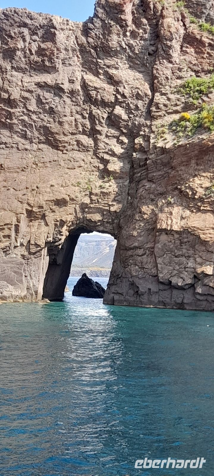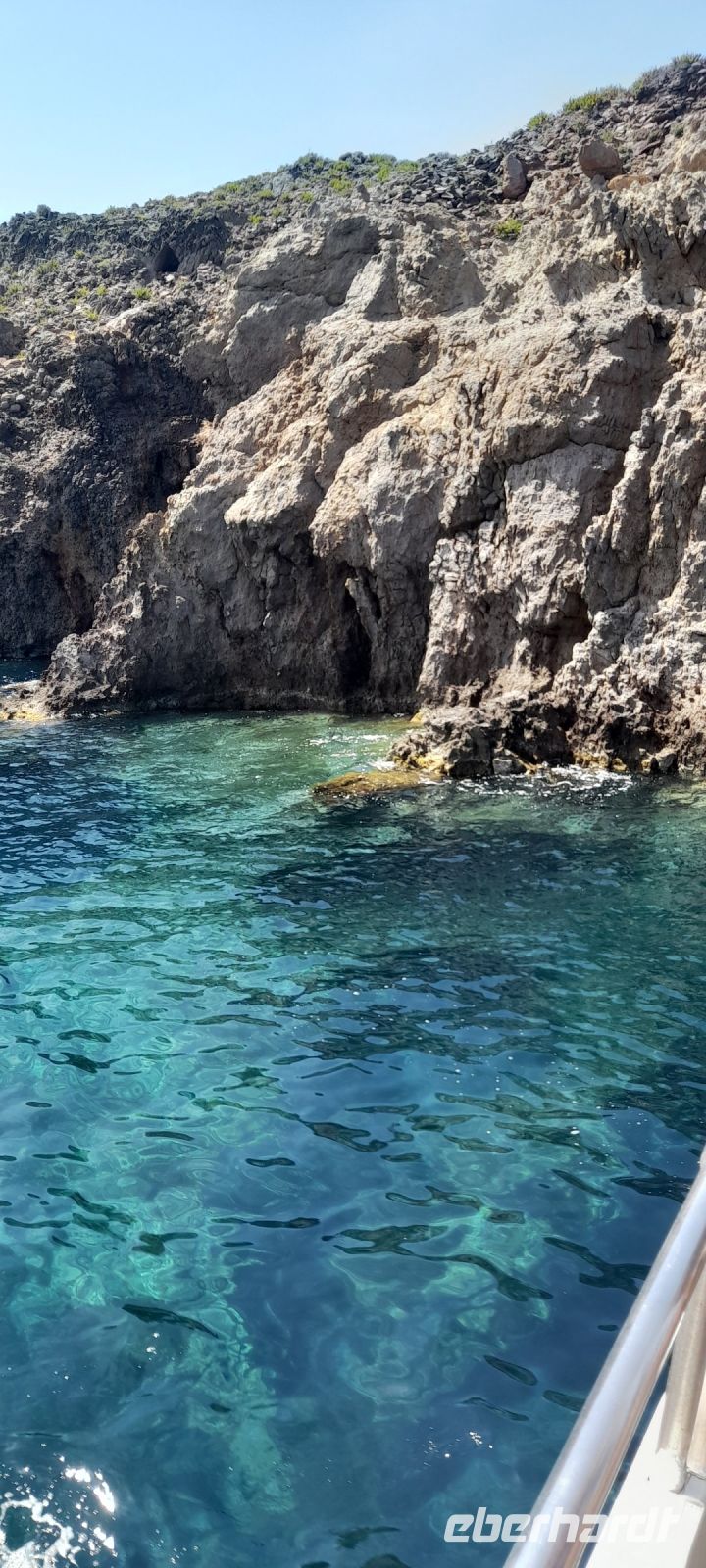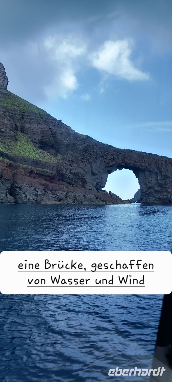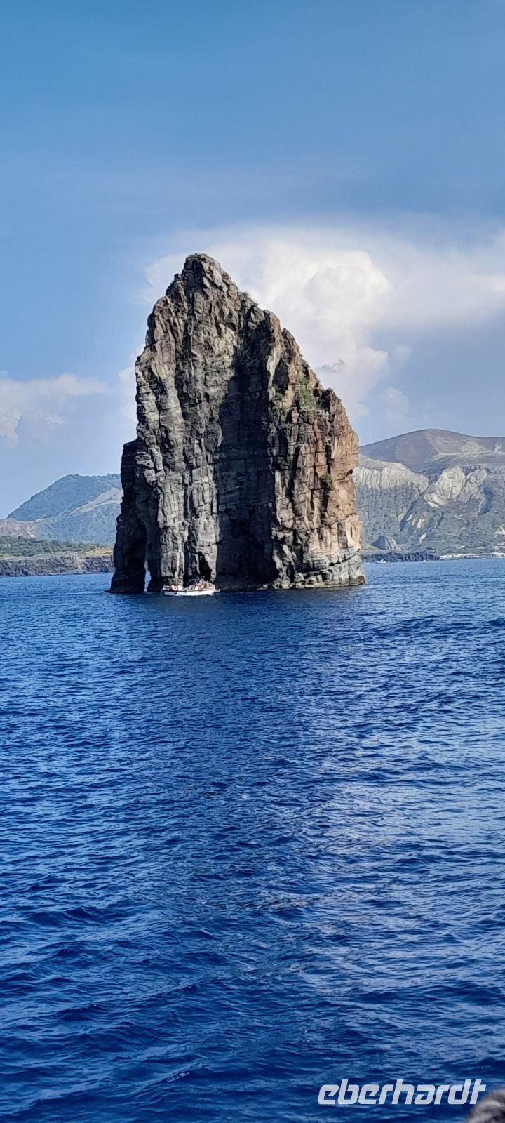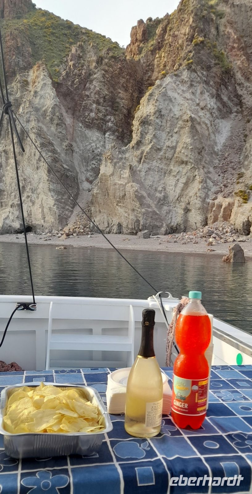 Sagenhaft, was die Erosion hier an Torbogen, Höhlen und Felsbrocken geschaffen hat! Wir sitzen gemütlich, mit traumhaft schönen Blick auf Stromboli mit seiner ewigen Rauchfahne und genießen einheimische Spezialitäten. Bella Italia!