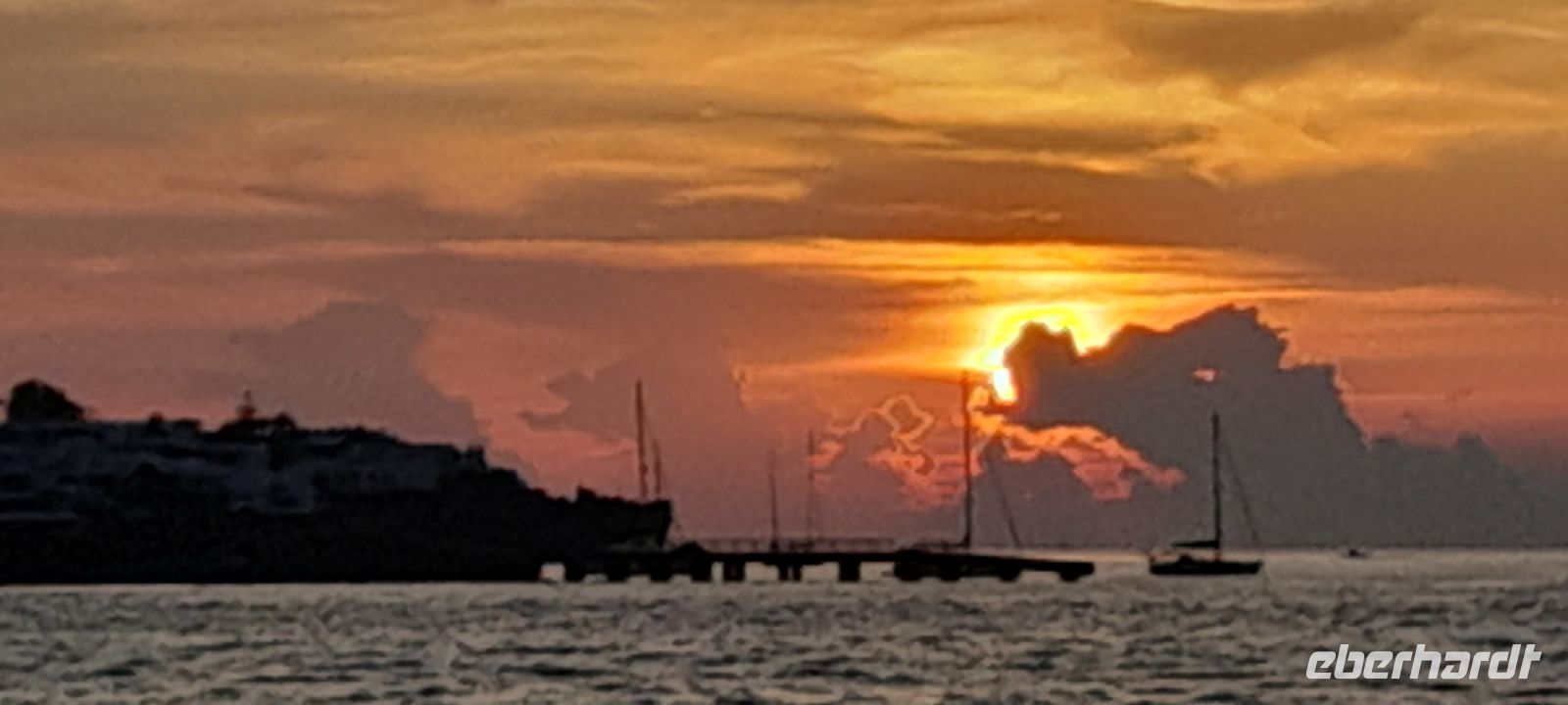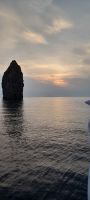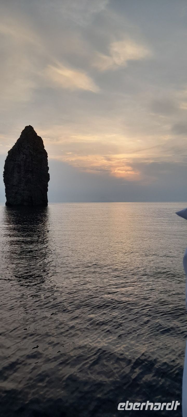 Am späten Nachmittag treffen wir uns wieder am Bootshafen mit unserem Guide und wir starten - ganz exklusiv unter uns - zu einem Bootsausflug rund um die Insel. Nahe der bekannten Felsen von Lipari bringt die Mannschaft, Sekt, Knabbereien und eine große Pizza, um mit uns den Sonnenuntergang zu feiern. Es gibt heute zwar leider einige Schleierwolken, aber das tut unserer guten Laune keinen Abbruch - es ist ein wunderschöner Tagesabschluß.