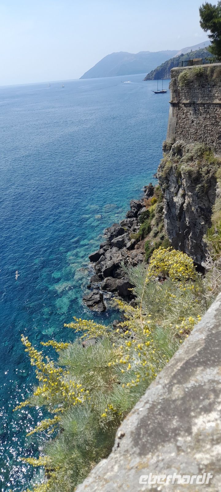 In Porto Santa Marina auf Salina angekommen, staunen wir wieder einmal über die vielen Kirchen, die sauberen, engen Gassen und die herrliche Blumenpracht. Strände mit grobem Kiesel sind hier das normale Bild. Wir fahren weiter, an der wild zerklüfteten Küste entlang bis nach Lingua.