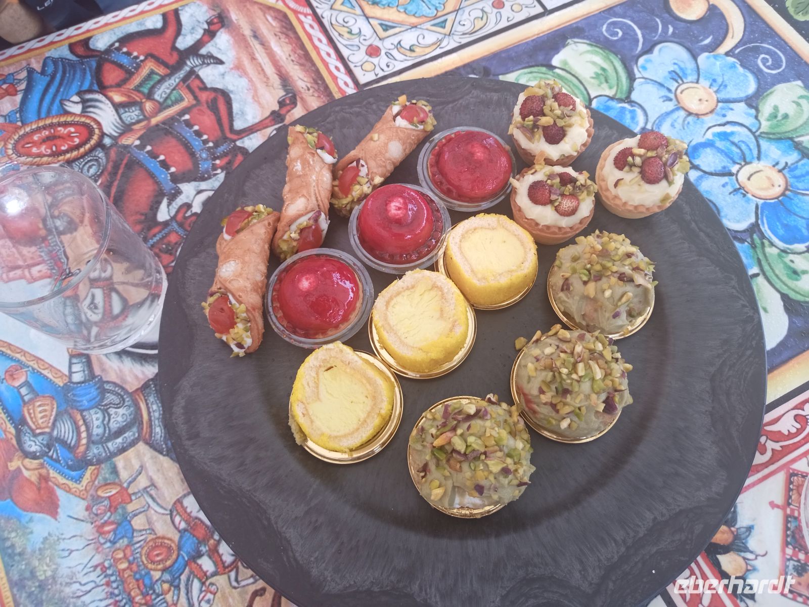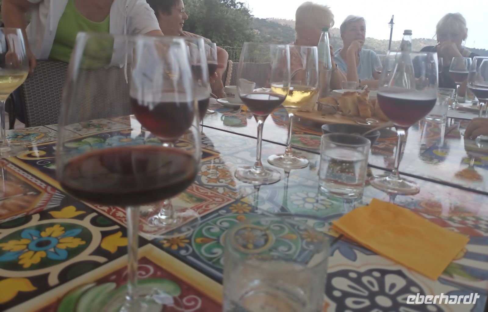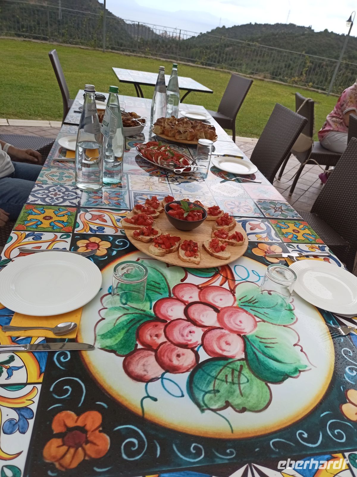 Zurück in unserer Villa wartete bereits ein besonderes Highlight: eine Weinprobe mit regionalen Spezialitäten. Mehrere Weiß- und Rotweine sowie ein Likör wurden vorgestellt und fachkundig erklärt und von uns verkostet. Dazu servierte der Koch köstliche Kleinigkeiten – von Antipasti, knusprigen Tomatenbrot bis zu frisch gebackenen Köstlichkeiten. Anschließend überraschte uns noch eine Auswahl an typisch sizilianischen Süßigkeiten aus einer Confiserie in Brolo. Die Stimmung war heiter, und so ließen wir den Nachmittag in geselliger Runde ausklingen.