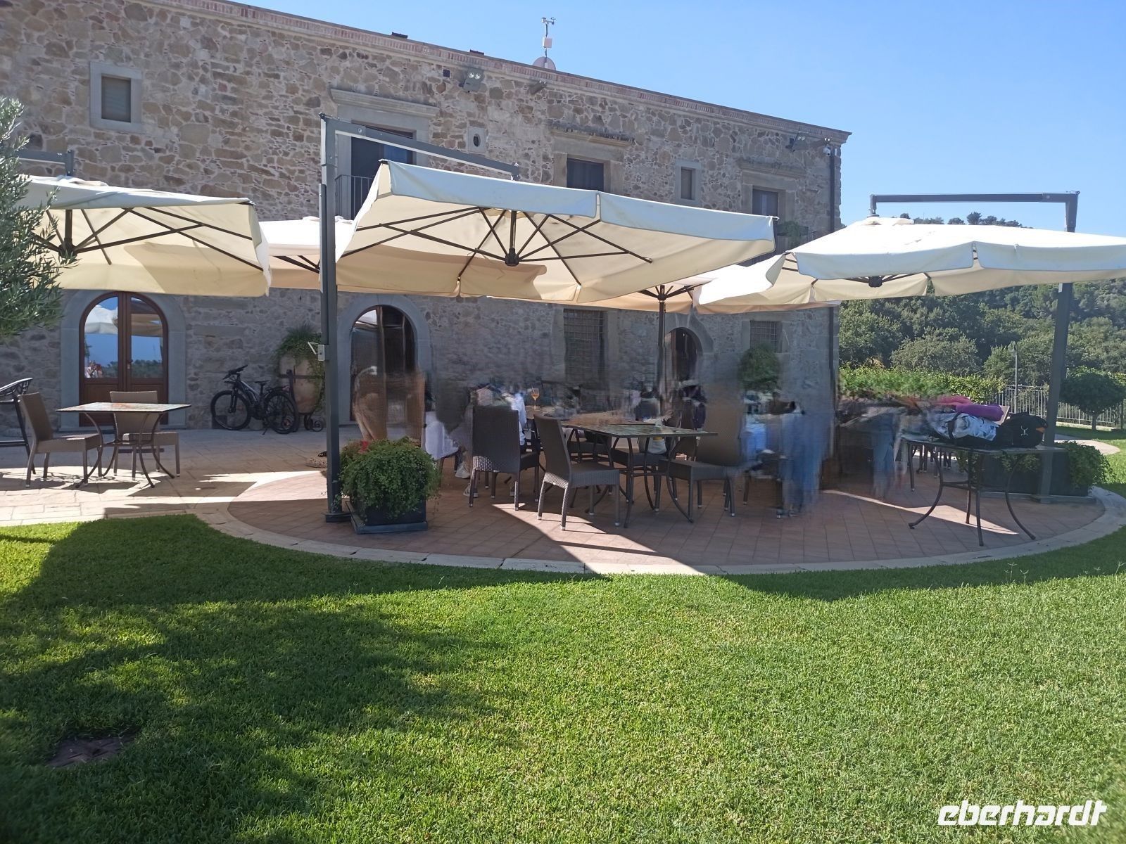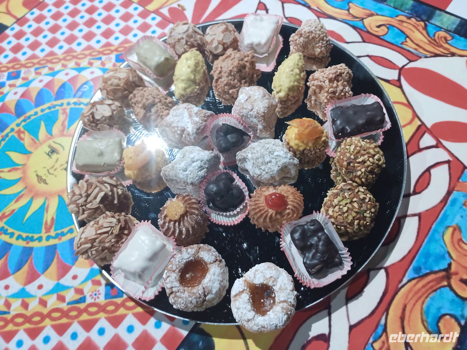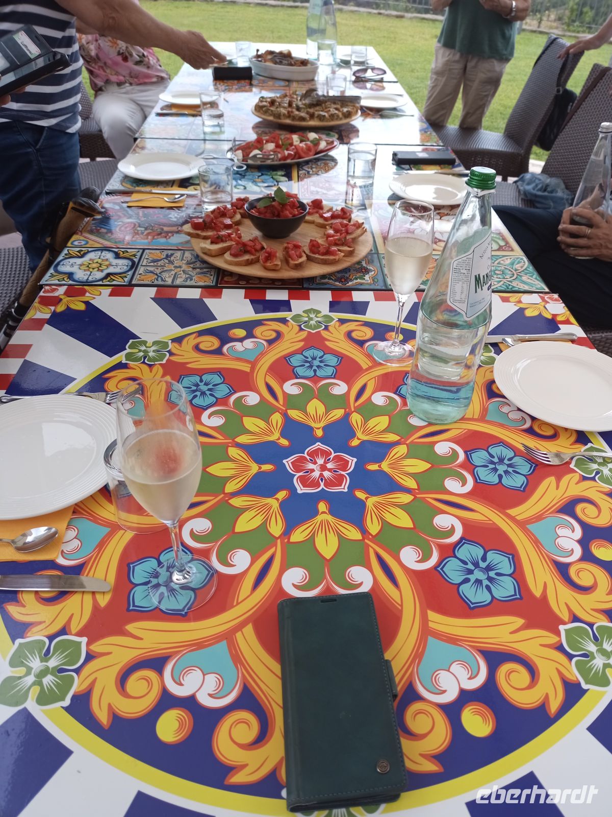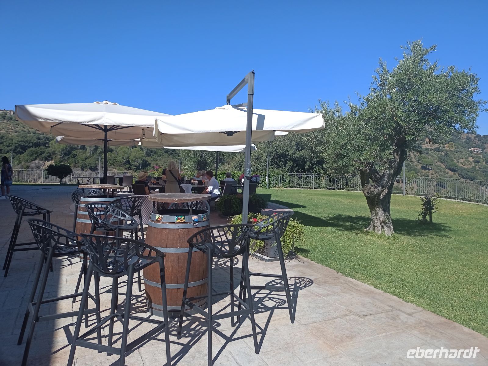 Zurück in unserer Villa wartete bereits ein besonderes Highlight: eine Weinprobe mit regionalen Spezialitäten. Mehrere Weiß- und Rotweine sowie ein Likör wurden vorgestellt und fachkundig erklärt und von uns verkostet. Dazu servierte der Koch köstliche Kleinigkeiten – von Antipasti, knusprigen Tomatenbrot bis zu frisch gebackenen Köstlichkeiten. Anschließend überraschte uns noch eine Auswahl an typisch sizilianischen Süßigkeiten aus einer Confiserie in Brolo. Die Stimmung war heiter, und so ließen wir den Nachmittag in geselliger Runde ausklingen.