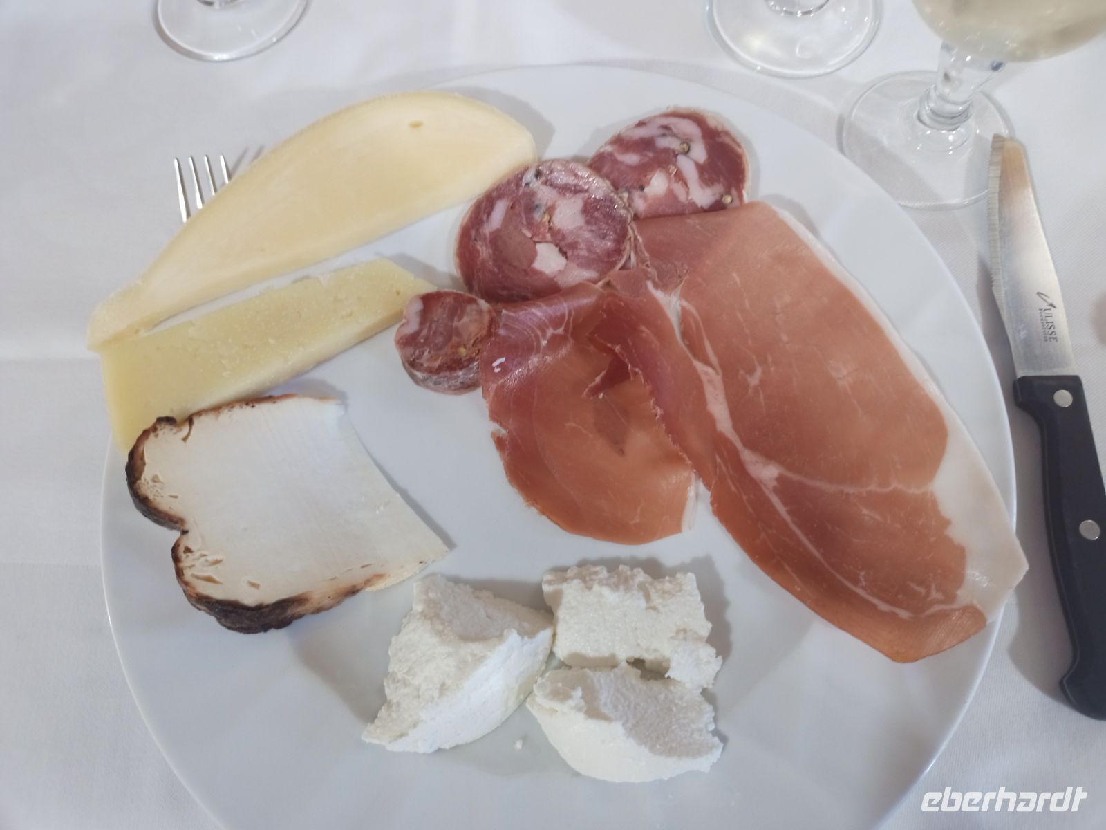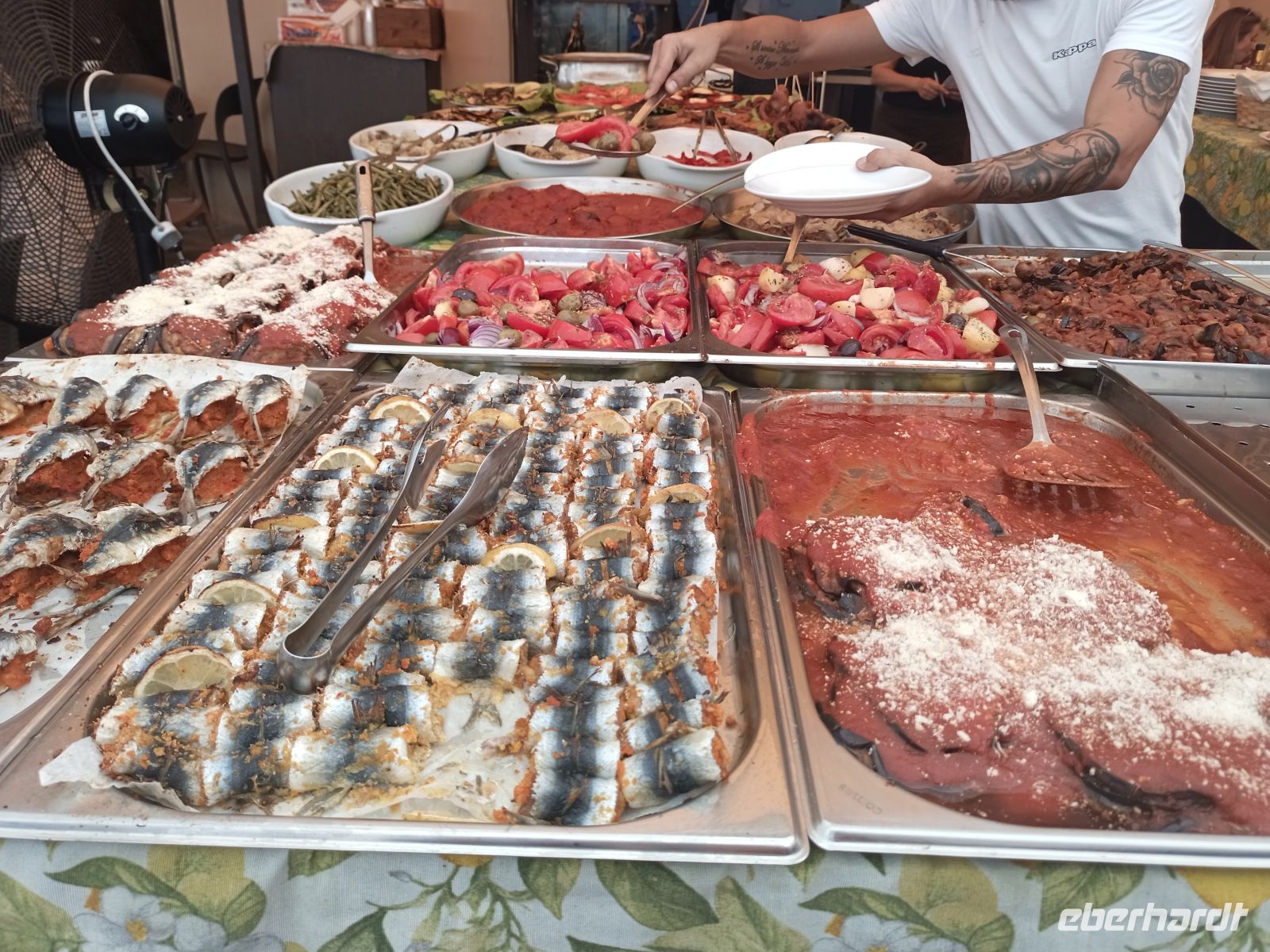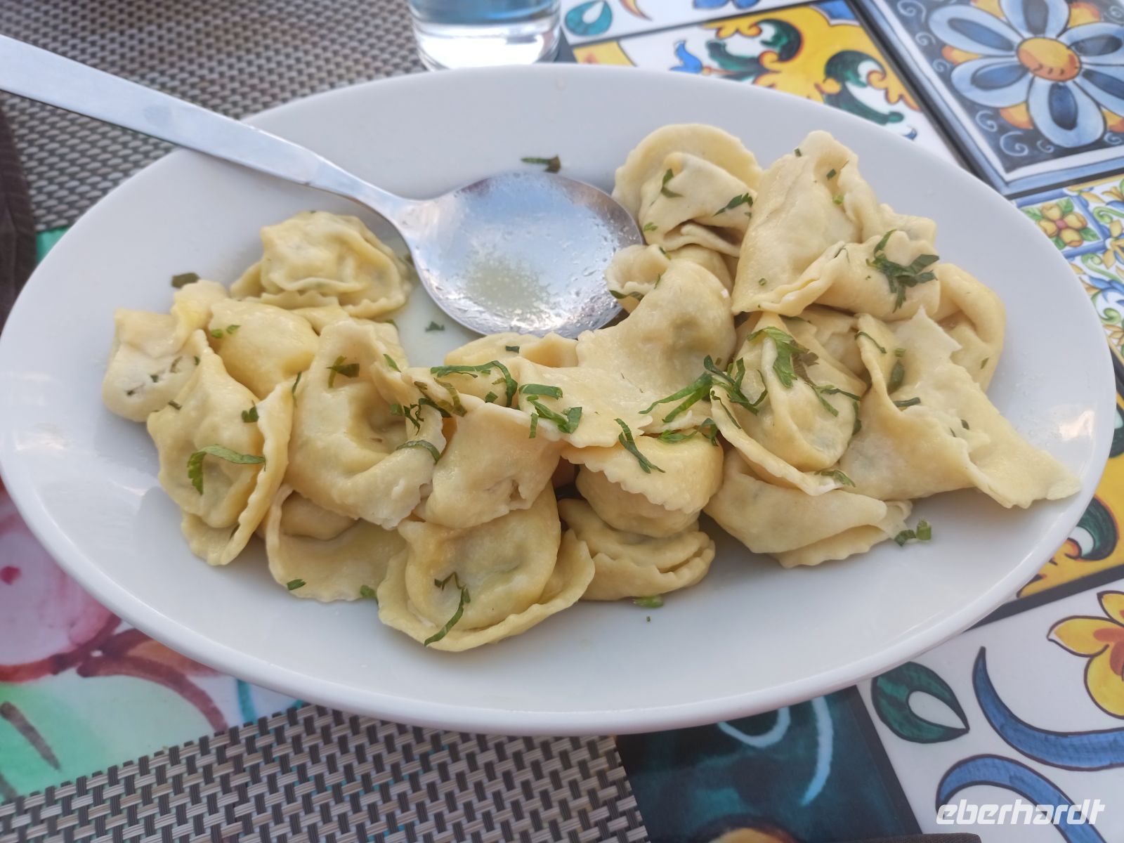 Zum Mittagessen kehrten wir in ein Restaurant auf der Piazza ein, nach langer Wartezeit aufs bestellte Essen, haben wir unsere Getränke bezahlt und ein anderes Restaurant aufgesucht. Da haben wir einige leckere Spezialitäten verkostet. Einige Gäste nutzten die Gelegenheit für einen Espresso oder ein Eis an der Marina Corta, andere besichtigten noch die Kirche Parrocchia di S. Giuseppe in der Nähe, oder bummelten durch die kleinen Gassen.