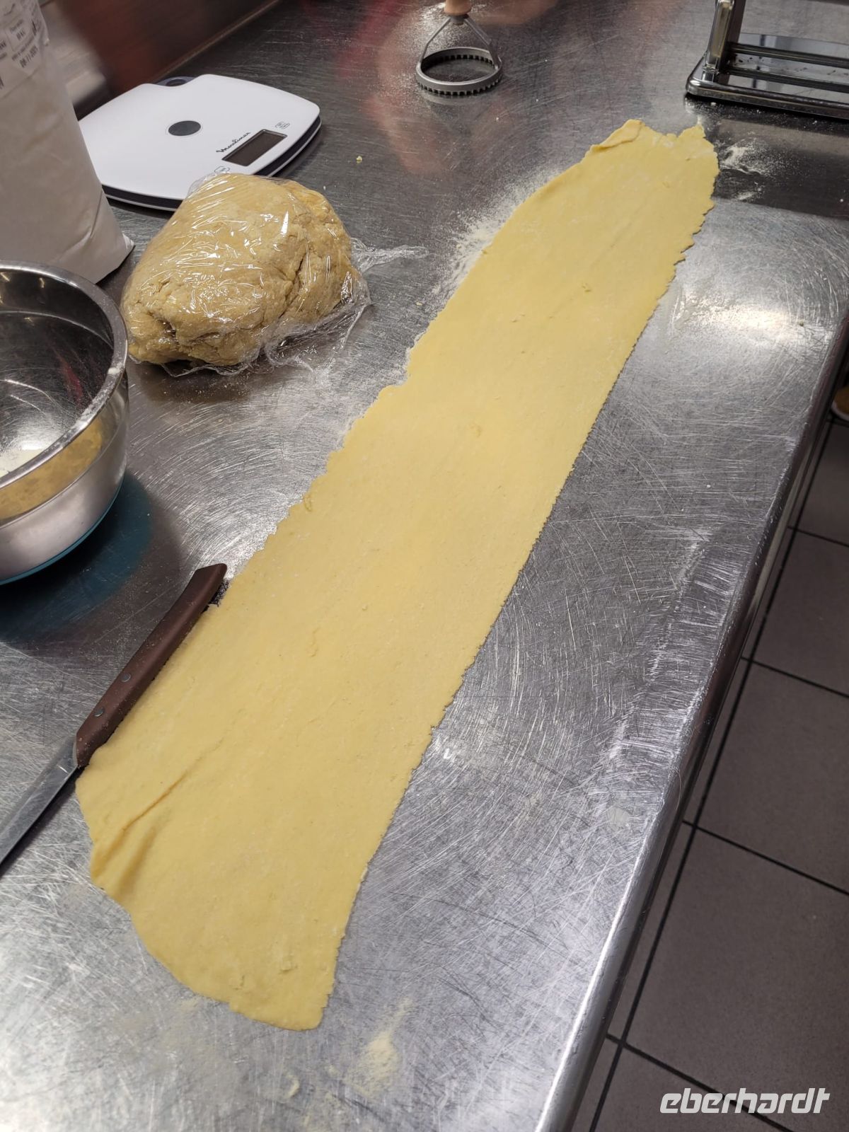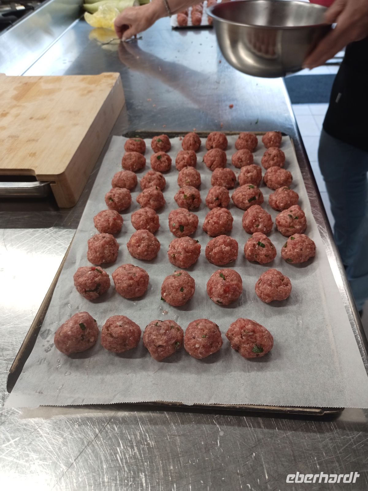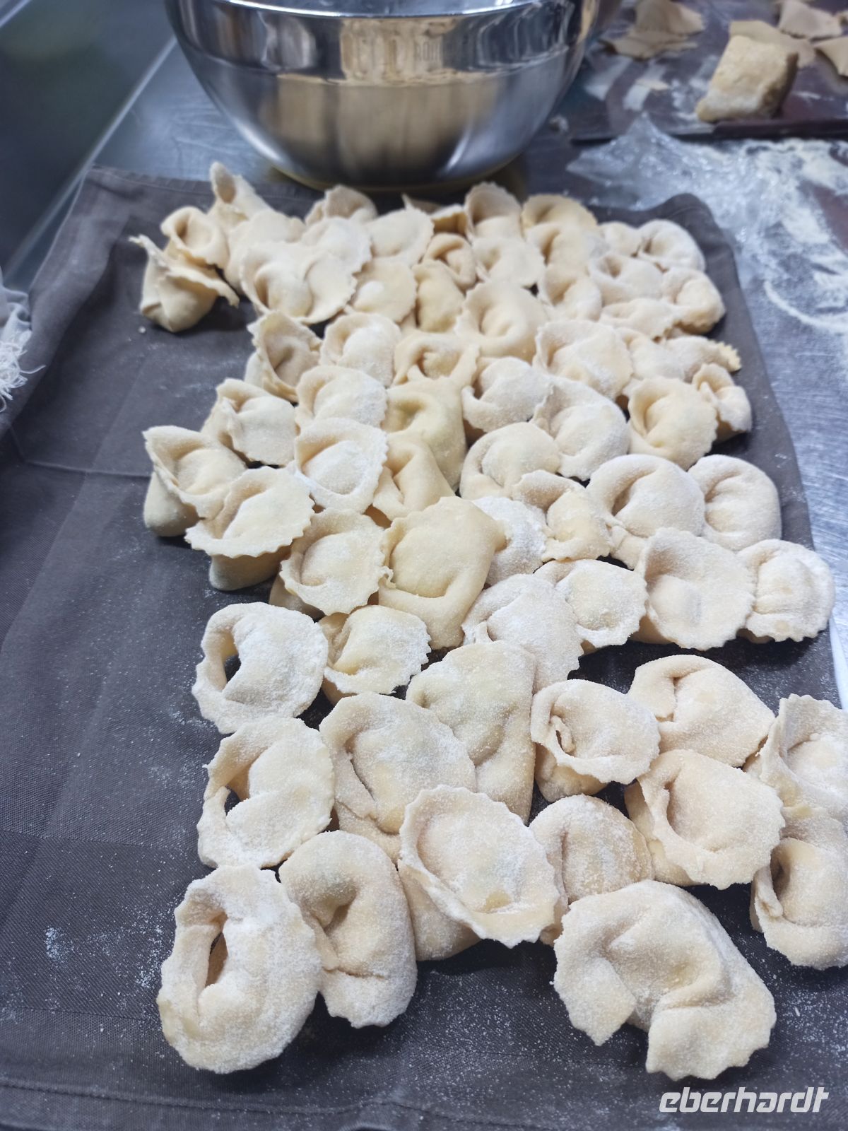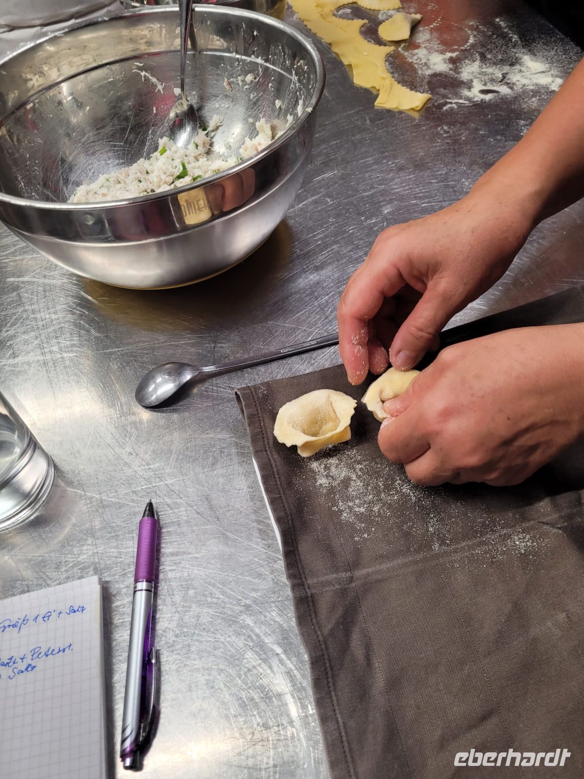 Mit viel Leidenschaft und Freude zeigte uns die Küchenfee und Markus, wie man einen frischen Pastateig vorbereitet. Anschließend durften wir selbst Hand anlegen: Mit der Nudelmaschine wurde der Teig hauchdünn ausgerollt, gefüllt mit Fisch oder und zu kleinen Tortelloni geformt. Parallel bereitete eine andere Gruppe die Fischfüllung und würzige Hackfleischbällchen mit Chili zu.