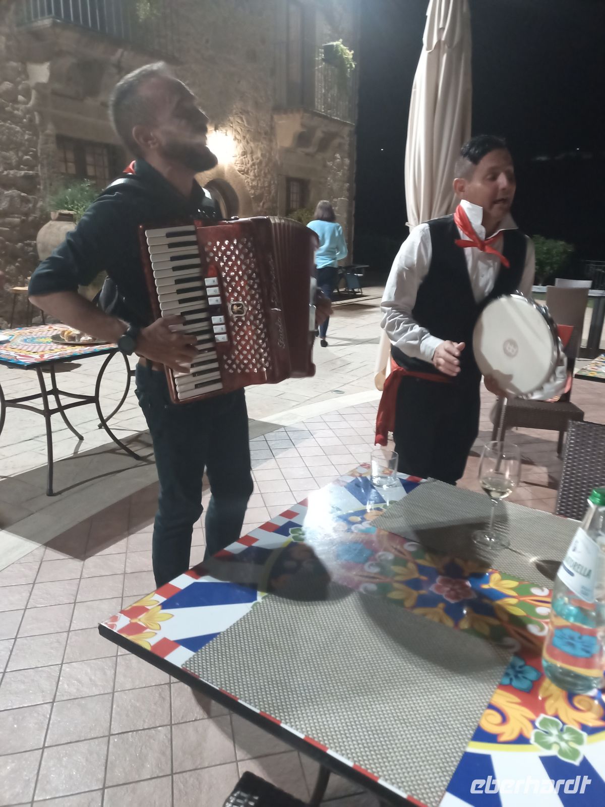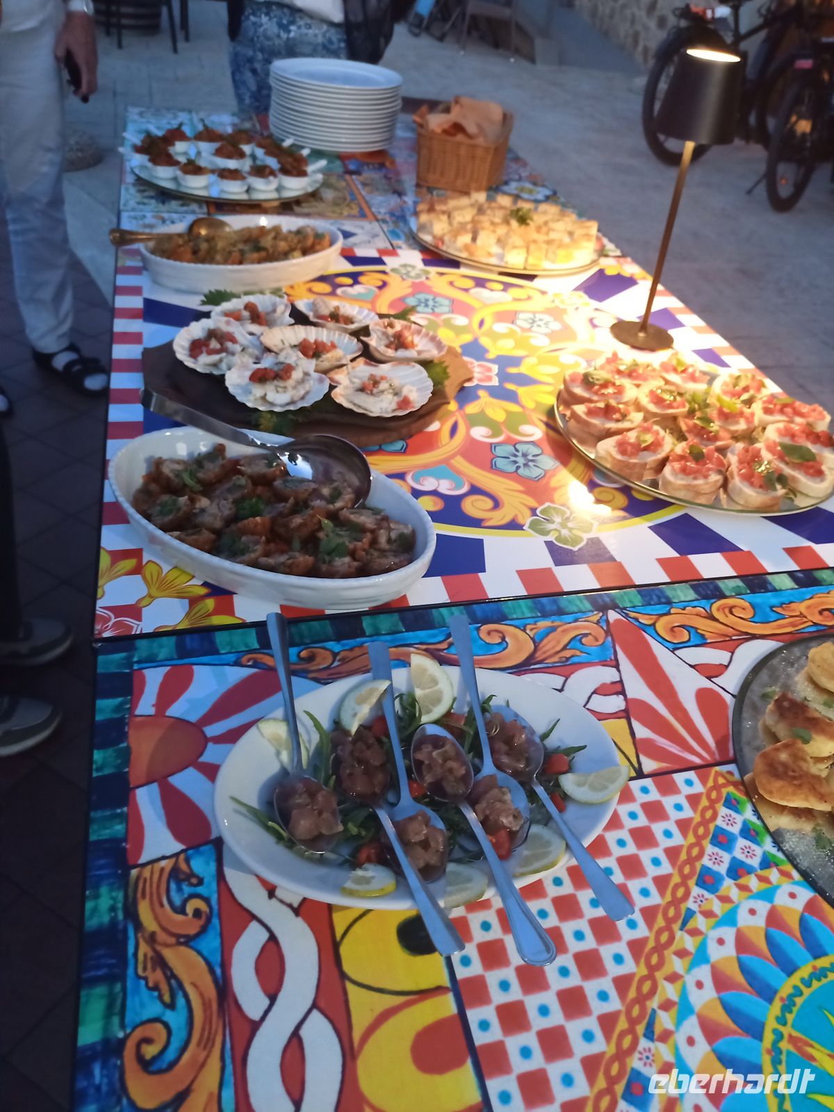 Im Anschluss erwartete uns ein festliches Abschiedsessen. In geselliger Runde wurden wir von Küchenchef Markus und seinem Team verwöhnt: ein köstliches Antipasti-Buffet, begleitet von raffinierten warmen Speisen, verführerischen Dessert und nicht zuletzt auch einen guten Wein rundete die Reise kulinarisch ab. Danach sorgten zwei sizilianische Musiker mit Harmonika und Tamburine für ausgelassene Stimmung. Bald füllte sich auch die Tanzfläche, und Gäste wie Gastgeber ließen den Abend voller Freude und Lebenslust ausklingen.
