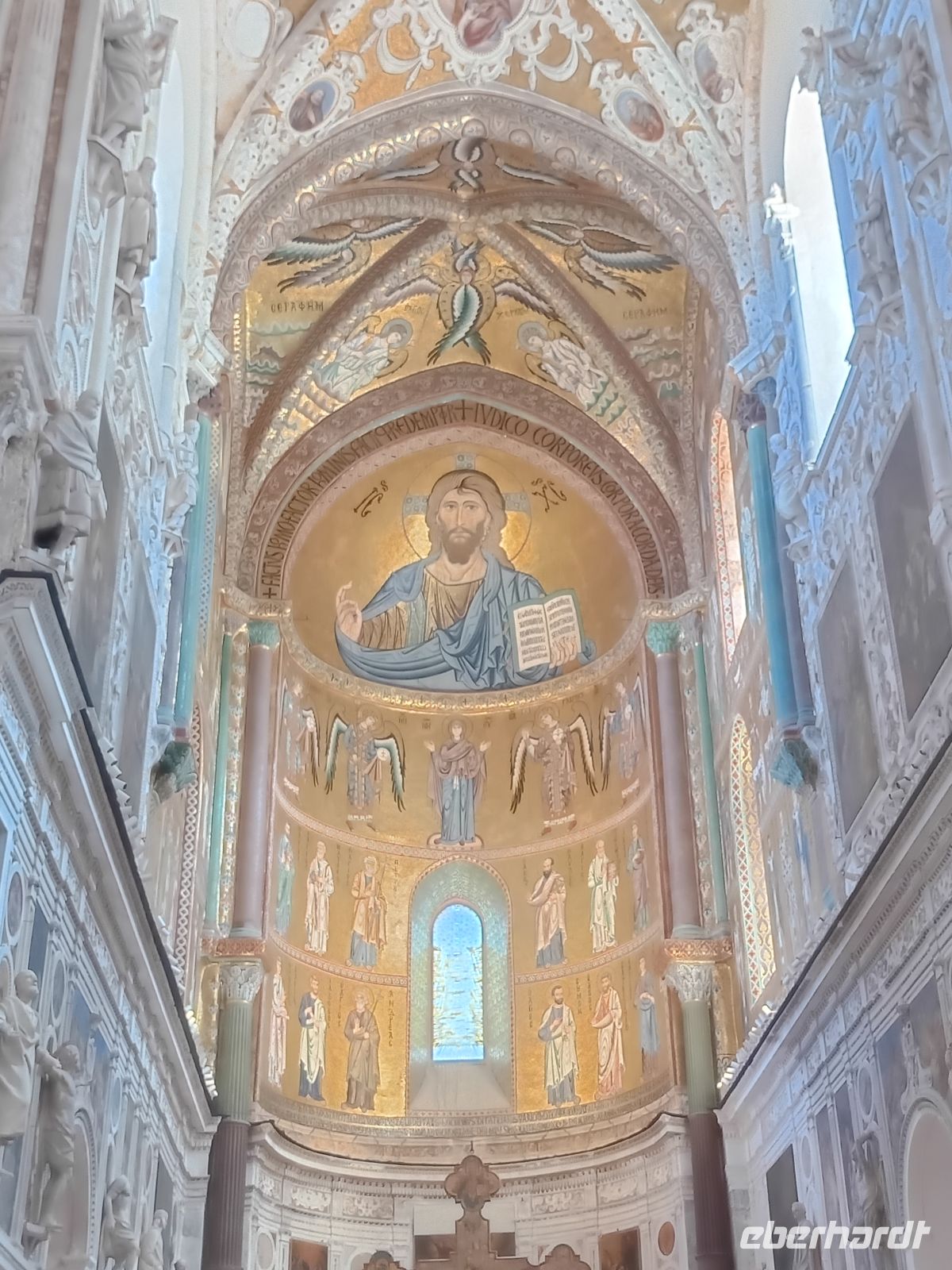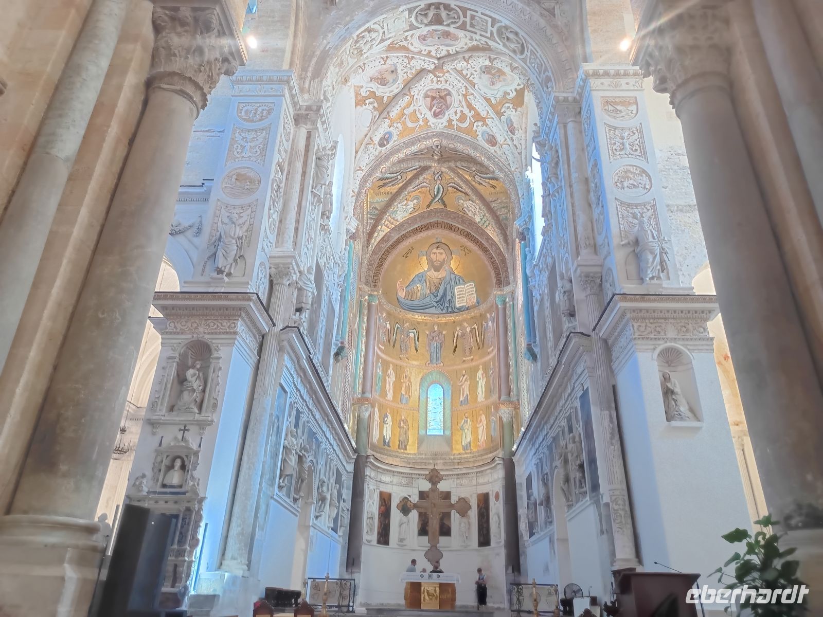 Besonders eindrucksvoll ist das byzantinische Mosaik in der Apsis: „Christus Pantokrator“, der segnend in strahlendem Gold erhaben über dem Altar thront. Dieses Meisterwerk aus dem 12. Jahrhundert zählt zu den bedeutendsten Mosaiken im Mittelmeerraum und hinterlässt bis heute bei jedem Besucher einen bleibenden Eindruck.